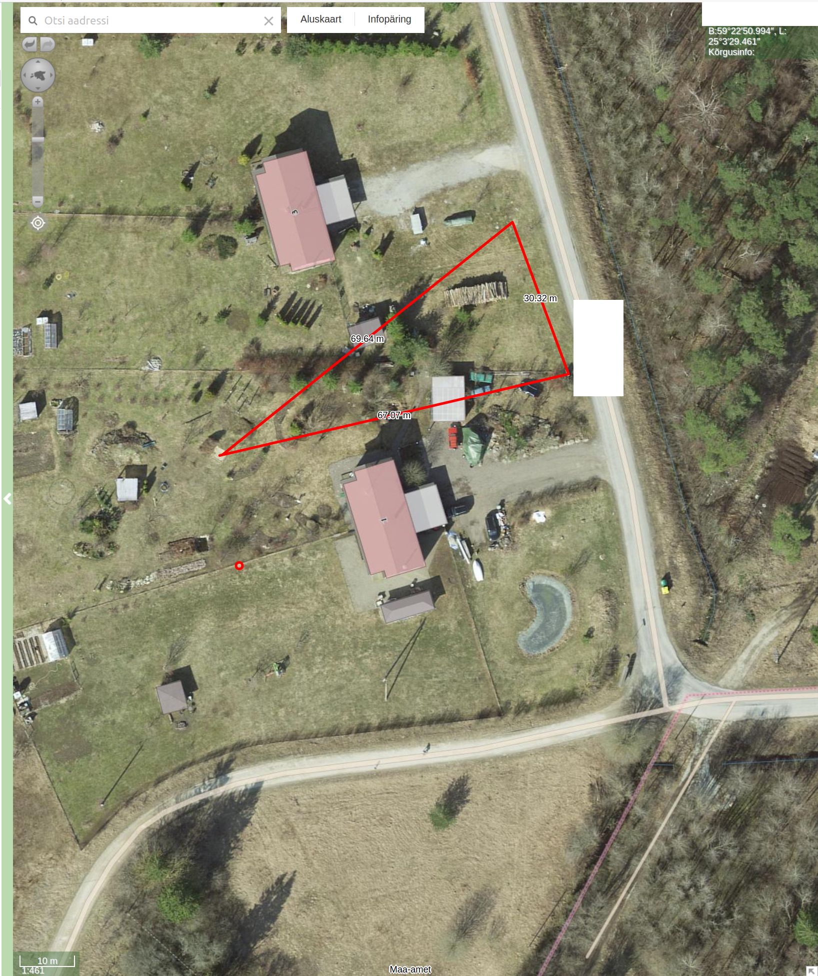 Olemasolev 10m3 kogumispaak on vaja vahetada biopuhasti vastu. Natuke keerulisemaks teeb asja see, et arvatavasti tuleb teha ühe toru/tunneliga imbväljak. Pildil on distantsid olemasolevast puurkaevust (67m) ja praeguse kogumispaagi kaane ja aia (krundi piiri) vahel (30m). Pinnas on üsna savi-klibu. Samas on imbuvus olnud üsna hea.