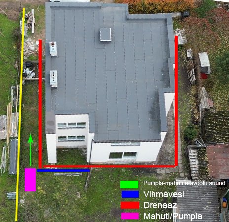 Mõte on siis panna drenaazitorud 3 maja külge (nejandasse külge, maja ette, ei kannata panna, ning too pool tundub ka kõige kuivem olevat) , mis vähendaks kevadeti põhjavee survet maja betoonist põrandale, ning et drenaazitorud suunaks selle vee kuskile mahutisse, kust siis pump selle mujale ära juhiks.