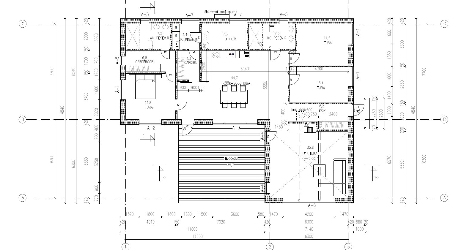 Elamu eelprojekt ja autocad failid olemas, vaja teha plaatvundamendi tööprojekt, kus ära märgitud kommunikatsioonid ja küttetorud. Samuti oleks vaja mahutabelit, et küsida korrektseid hinnapakkumisi ehitustööle.