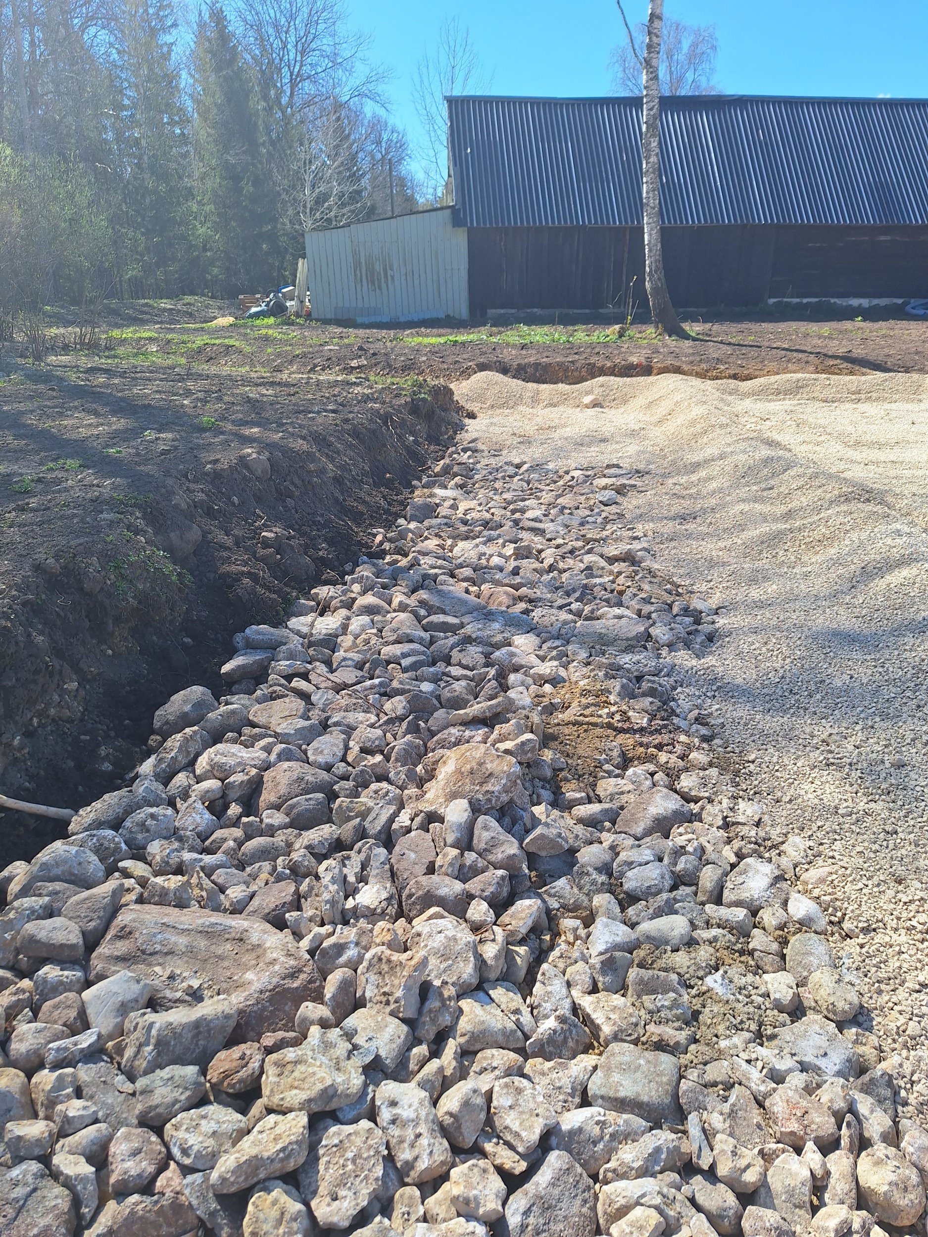 Ratsaplatsi aluspind on ette valmistatud. Kalded paigas. Savi/muld eemaldatud. Aluspind täidetud kividega ja tasandatud. Paigaldatud drenaaž.