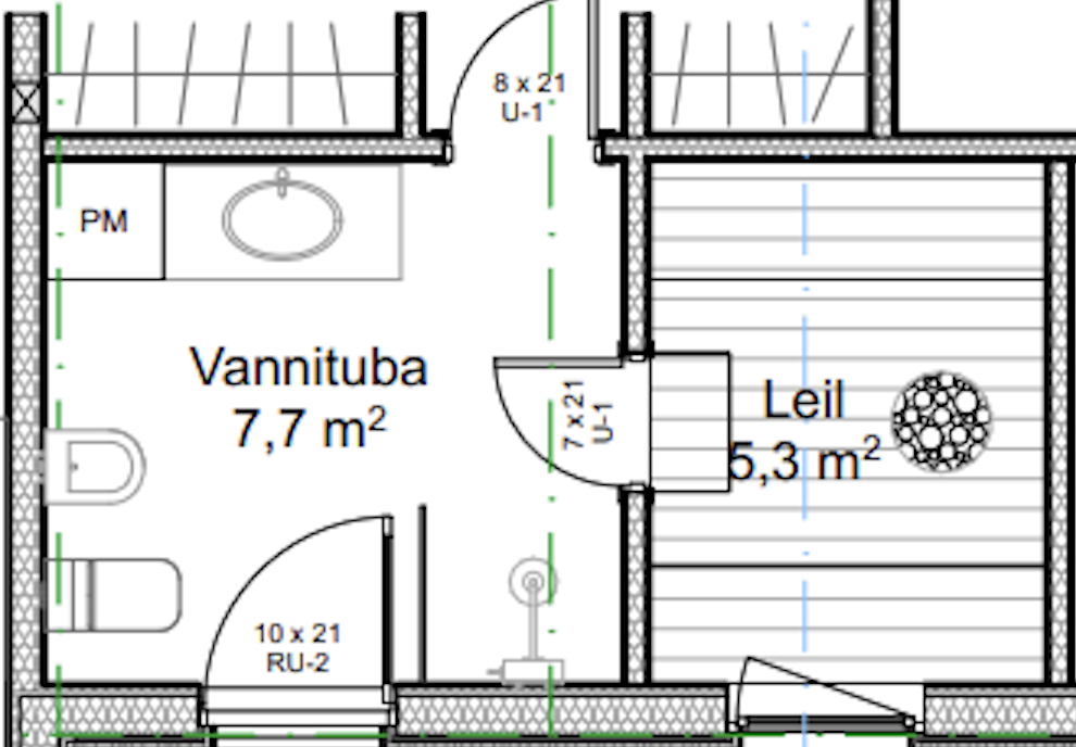 Muu info: põrandatel trapikalded valatud, duši rennitrapp välja toodud. Põrandaplaat - diagonaal, 20x20, dušinurgas mosaiik. Seinaplaat 25x75.