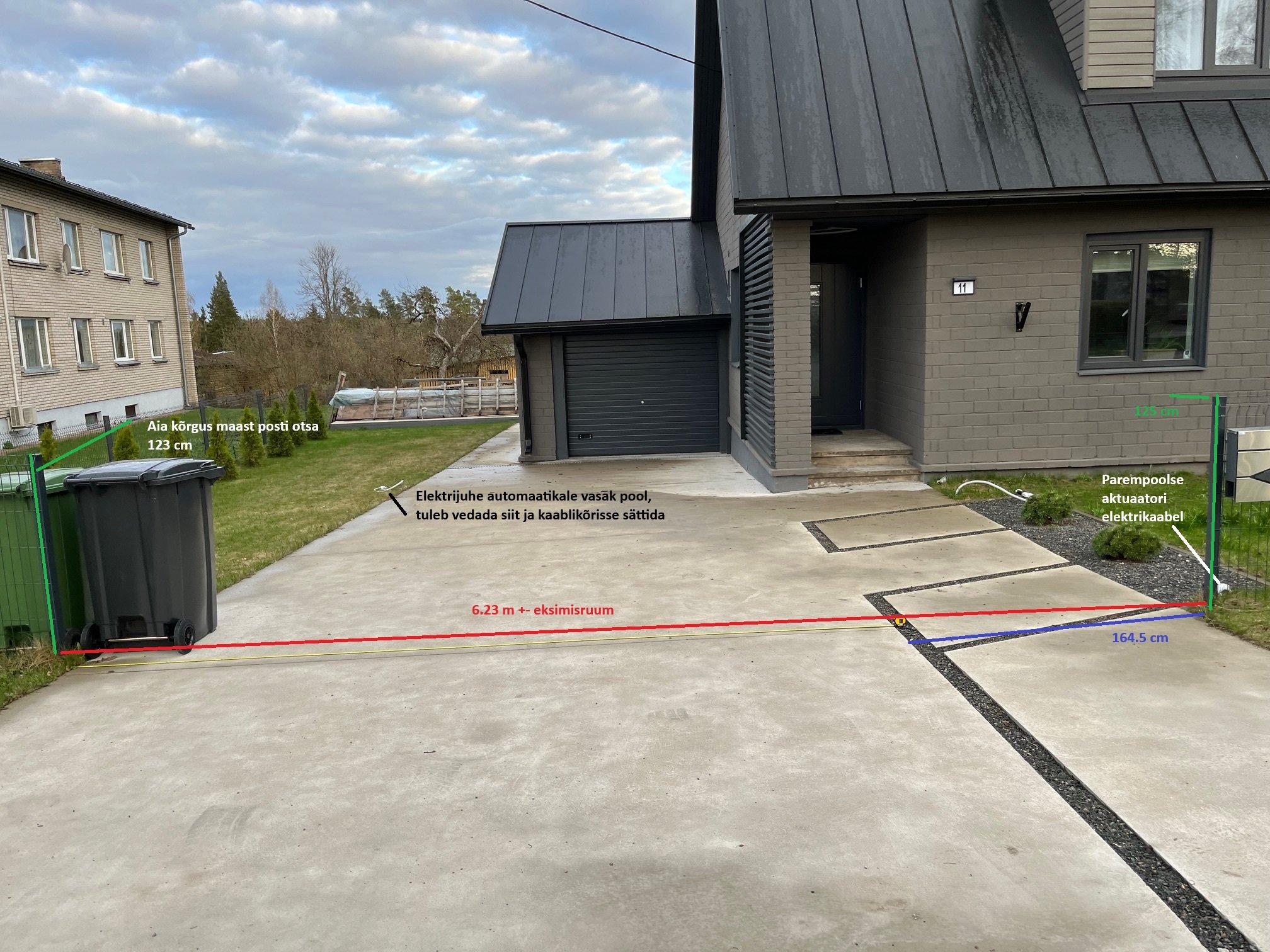 Väravapostide jaoks tuleb lõigata betooni avad ning sinna väravapostid paigaldada. Automaatika võiks olla piisav, vähemalt maksimum tiiva laius on 2500 mm. Siin tuleb mõelda, et kas 4m on piisav või minna pigem 2.1 või isegi pikem, ruumi jagub. Kõige parem oleks muidugi kohapeal üle mõõta ja paika panna, et mis täpselt. Jalgväraval ja autoväraval ka pädev kukustus.
