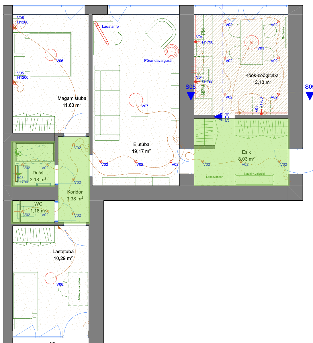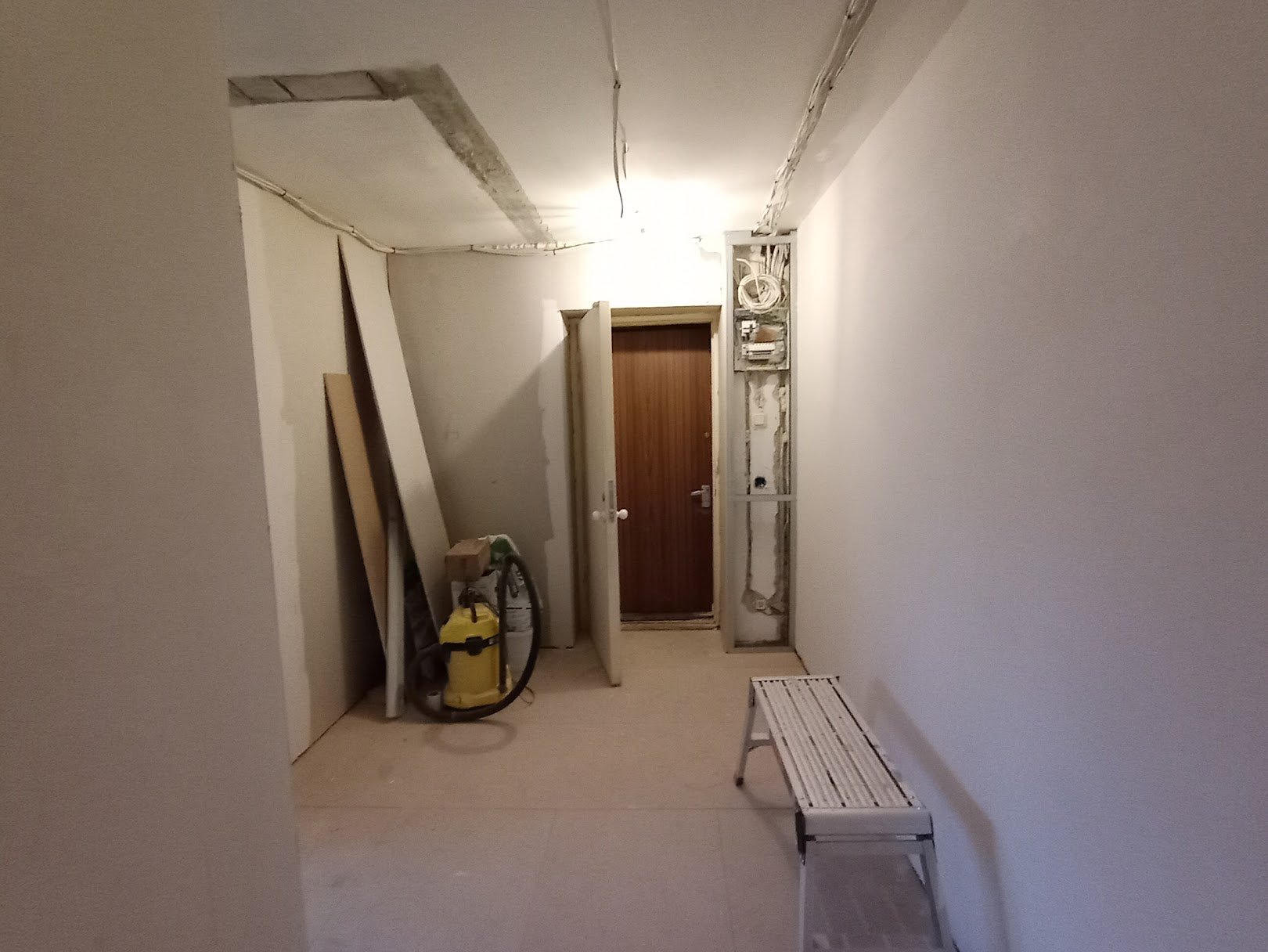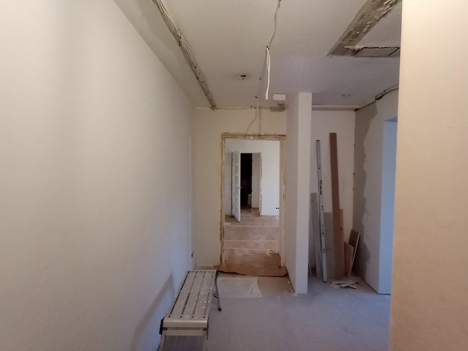 Kipslagede ehitus + ettevalmistus kruntvärvimiseks - esikus (8m2), koridoris (3m2), duširuumis (2 m2), WCs (1 m2). Karkass võiks olla võimalikult õhuke, et ruumikõrgus saaks maksimaalselt säilitada. Duširuumis võta arvesse niiskusega seotud vajadusi. Lisaks kaablie läbiviigud (10 tk), hooldusluukide paigaldus (2 tk). Praegune ruumikõrgus on 2,44 m.