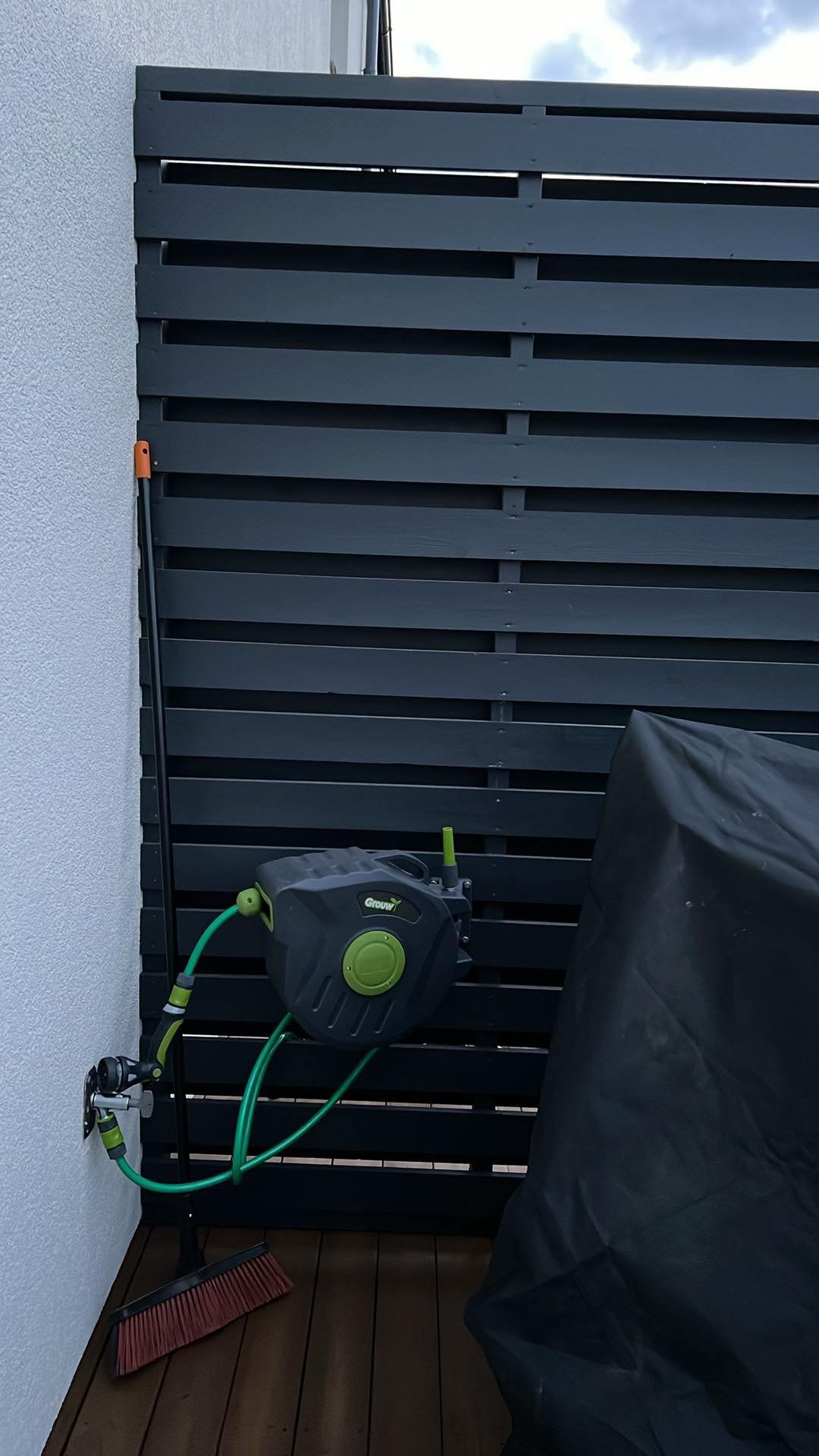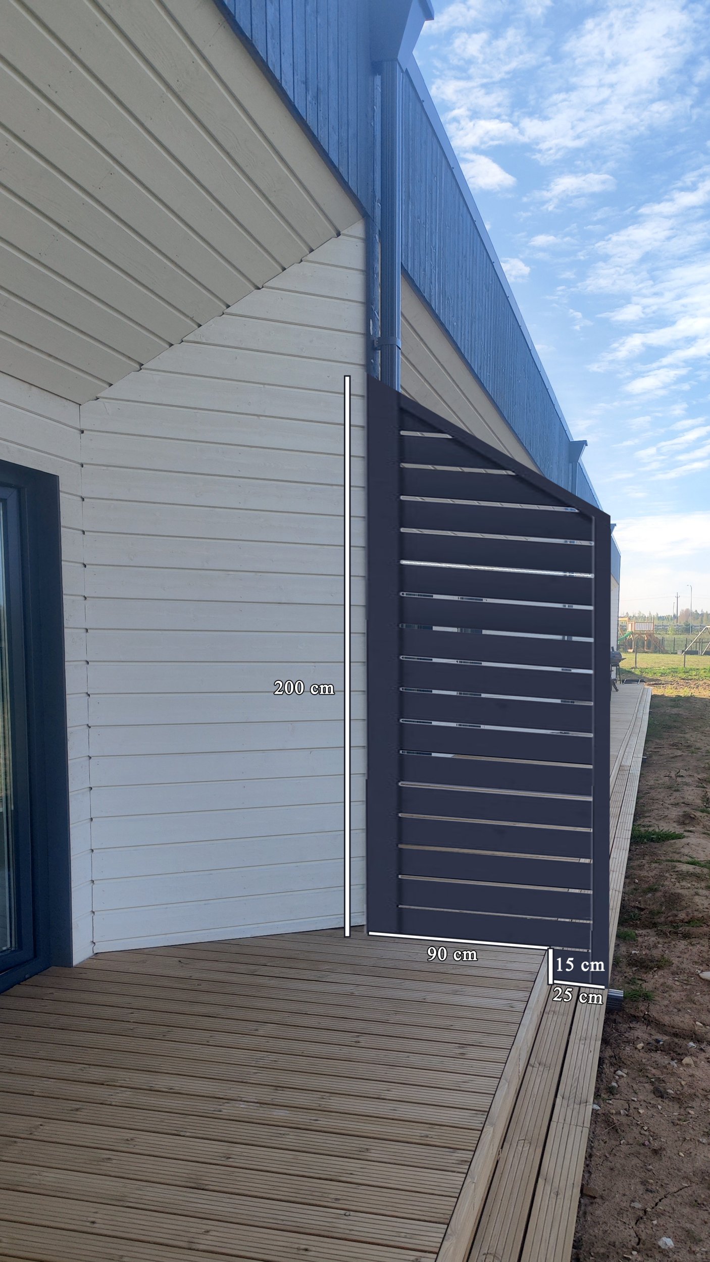 Piltidelt leiab mõõdud ja esialgse eskiisi. Vihmaveetoru peaks jääma vaheseina sisse. Seinast võiks õhk läbi käia. Ehk siis liistud väikeste vahedega. Aga liistude vahed võiksid kahel pool olla erinevatel kohtadel, et sein ei paistaks läbi. Selliseid seinu oleks vaja kokku 5-7.