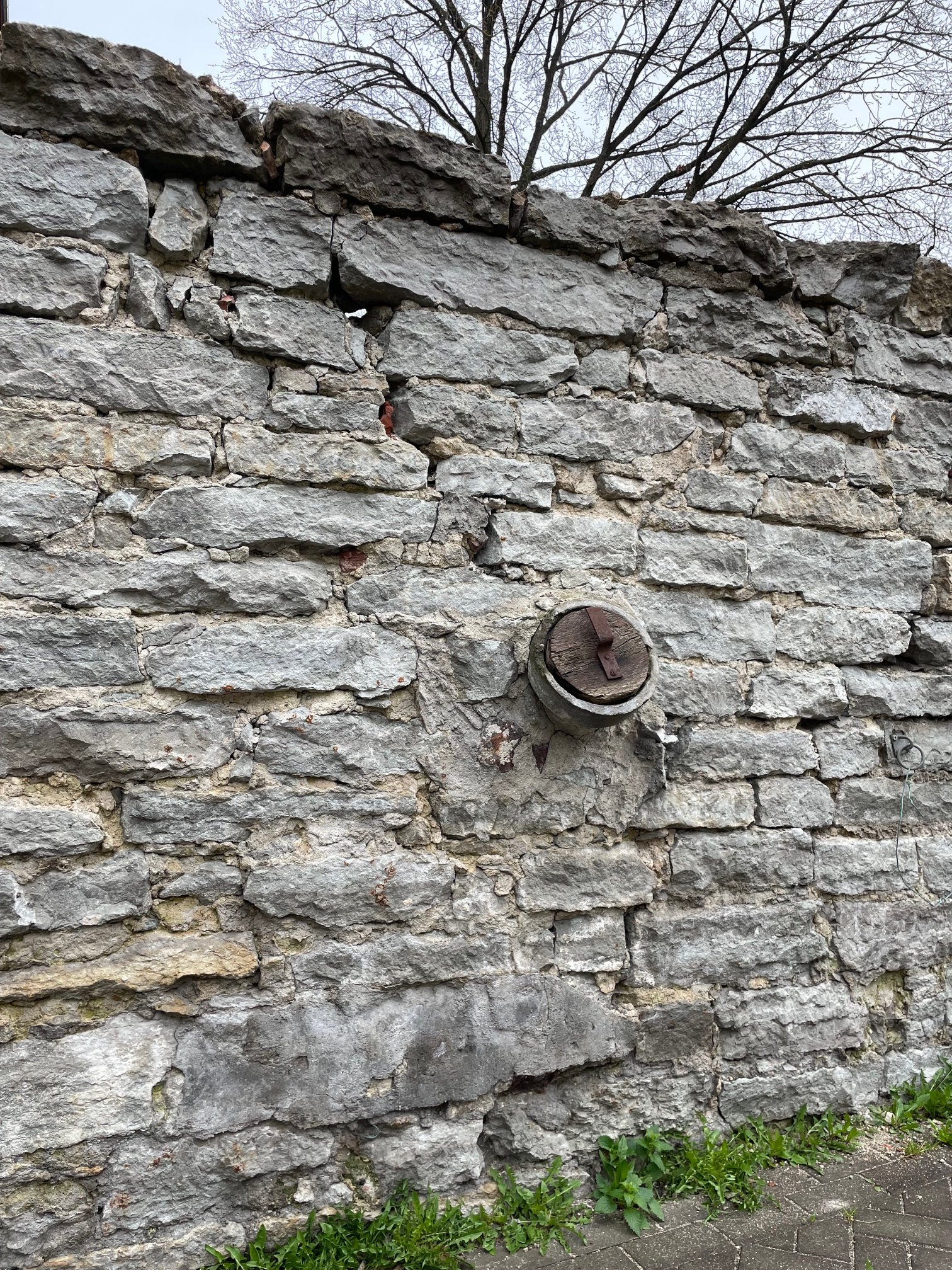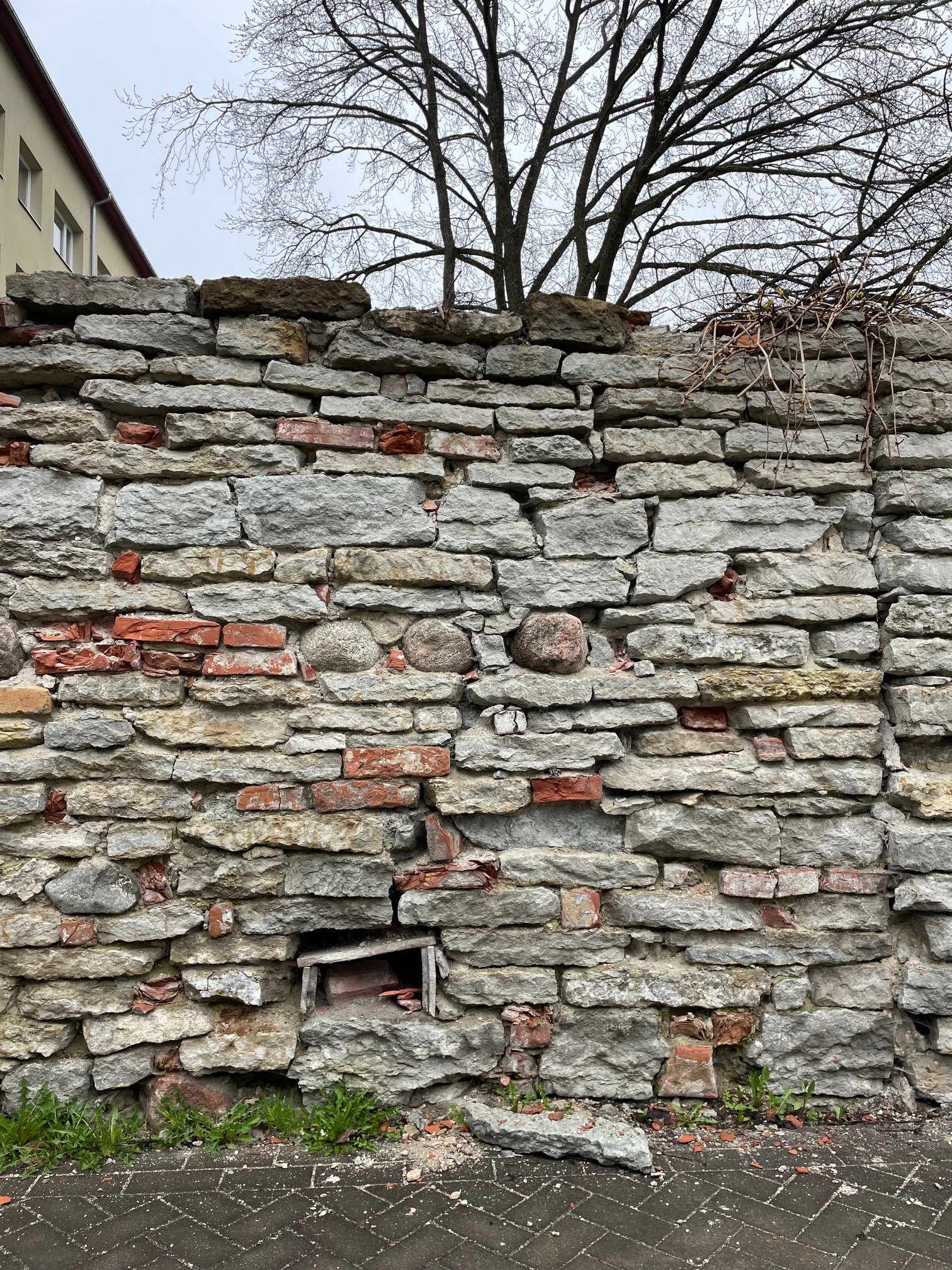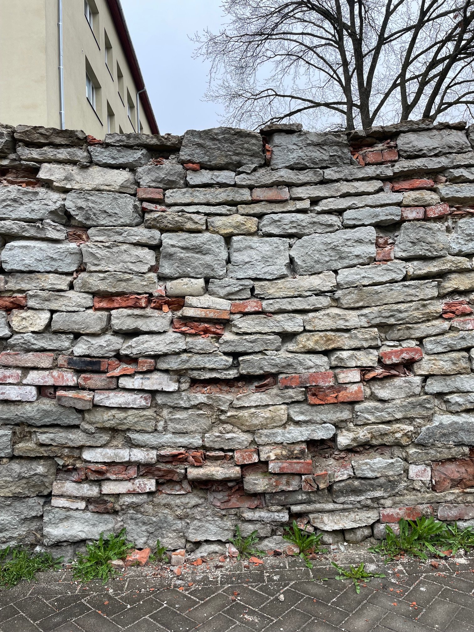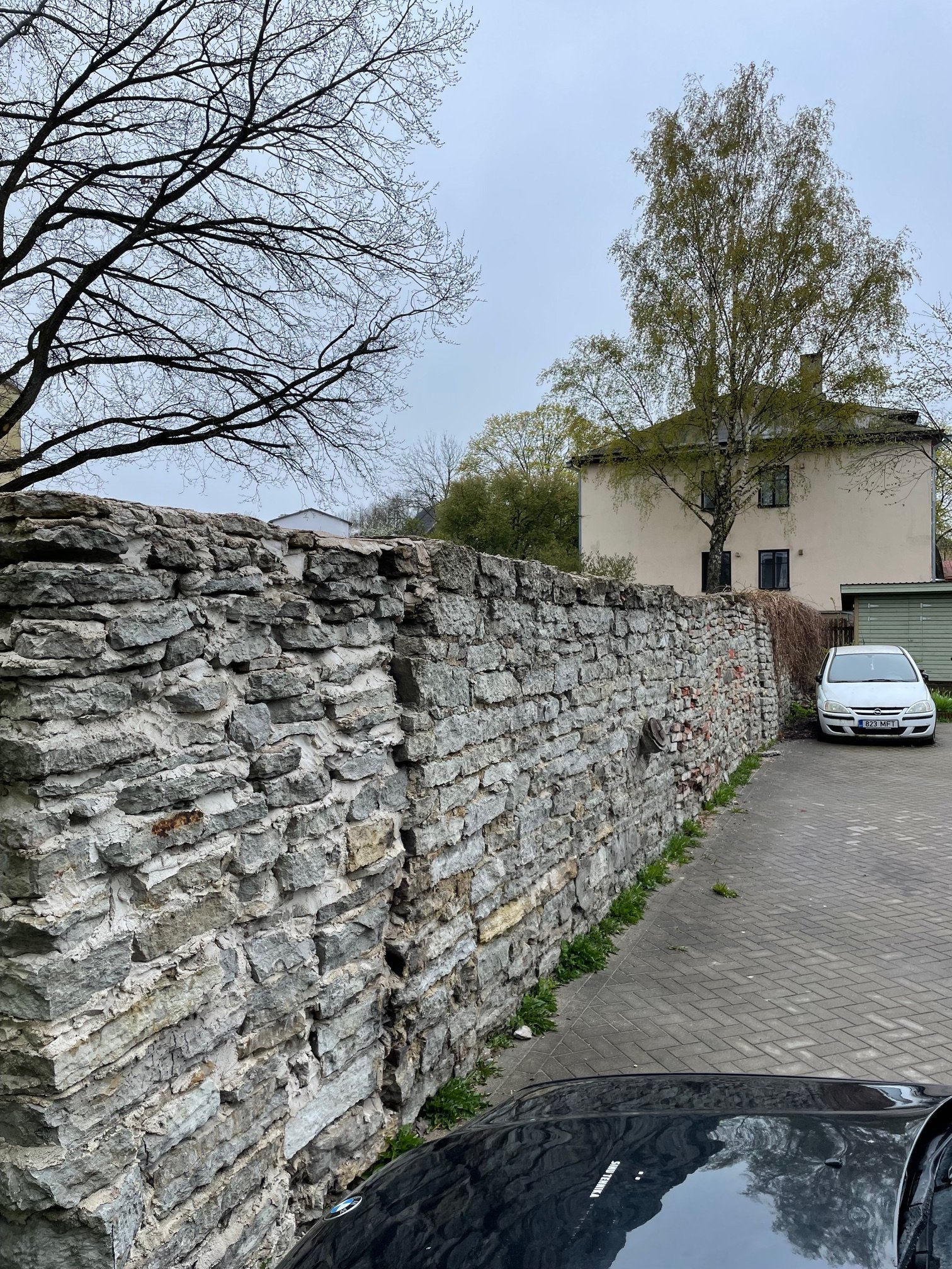 Variant 1: Paekvivst müüritise katmine sobiva krohviga. Töö mahus tuleb arvestada 20m pikkuse ja 2,2m kõrguse paekivist müüri katmisega sobiva pritskrohvi kihiga vähemalt kahes kihis. Enne pritskrohviga katmist tuleb suuremad tühimikud seinas täita paekivi tükkidega (kohapeal olemas) või tellise tükkidega. Samuti tuleb töö mahus arvestada seina peale kaldekolmnurga rajamisega sobivast mördist/segust, mis tuleb ankrute abil siduda müüritisega ning koos seina katmisega katta pritskrohviga. Müüritis tuleb katta mõlemalt poolt. Müüritise pinda on kokku ~100m2.