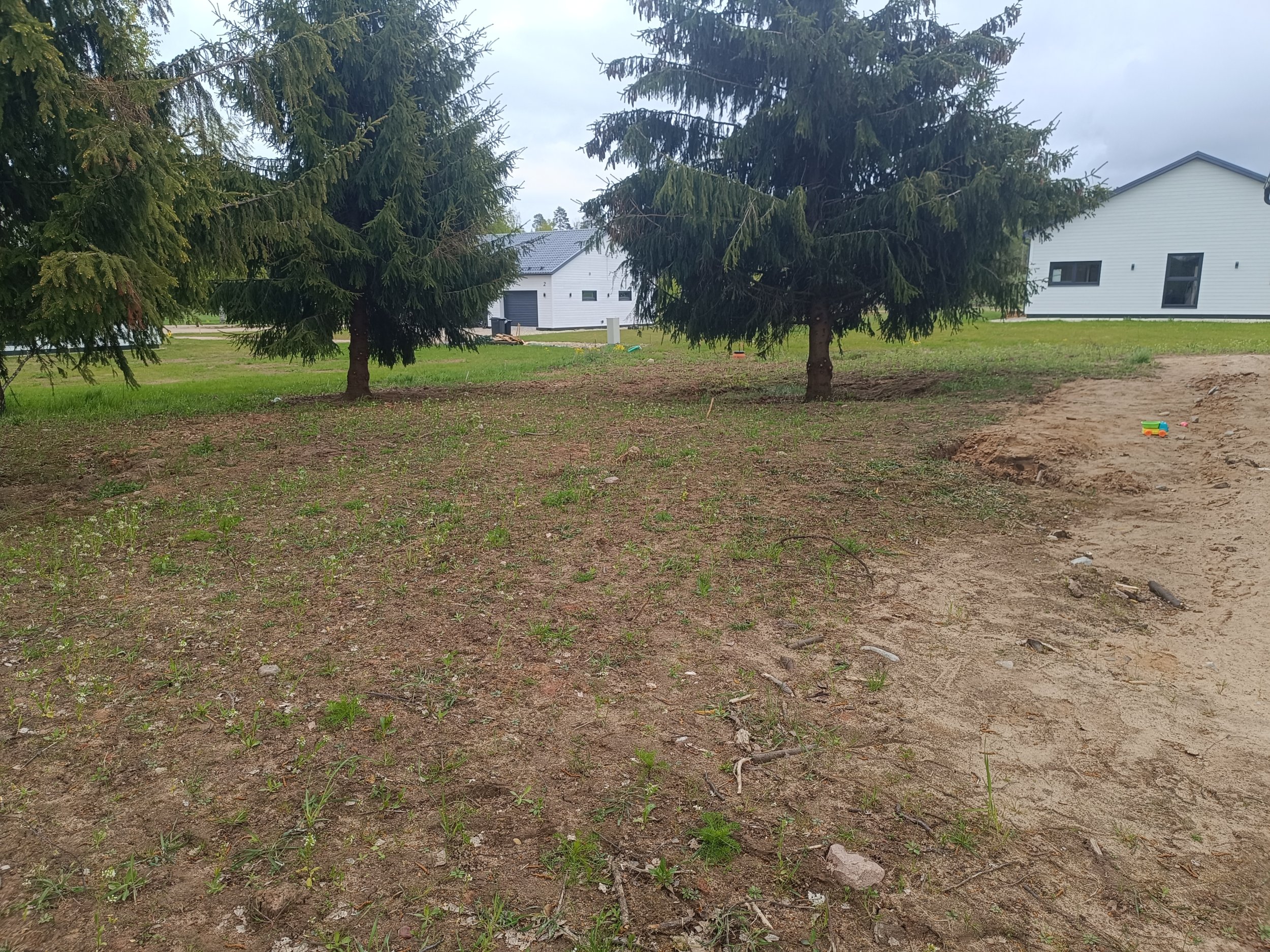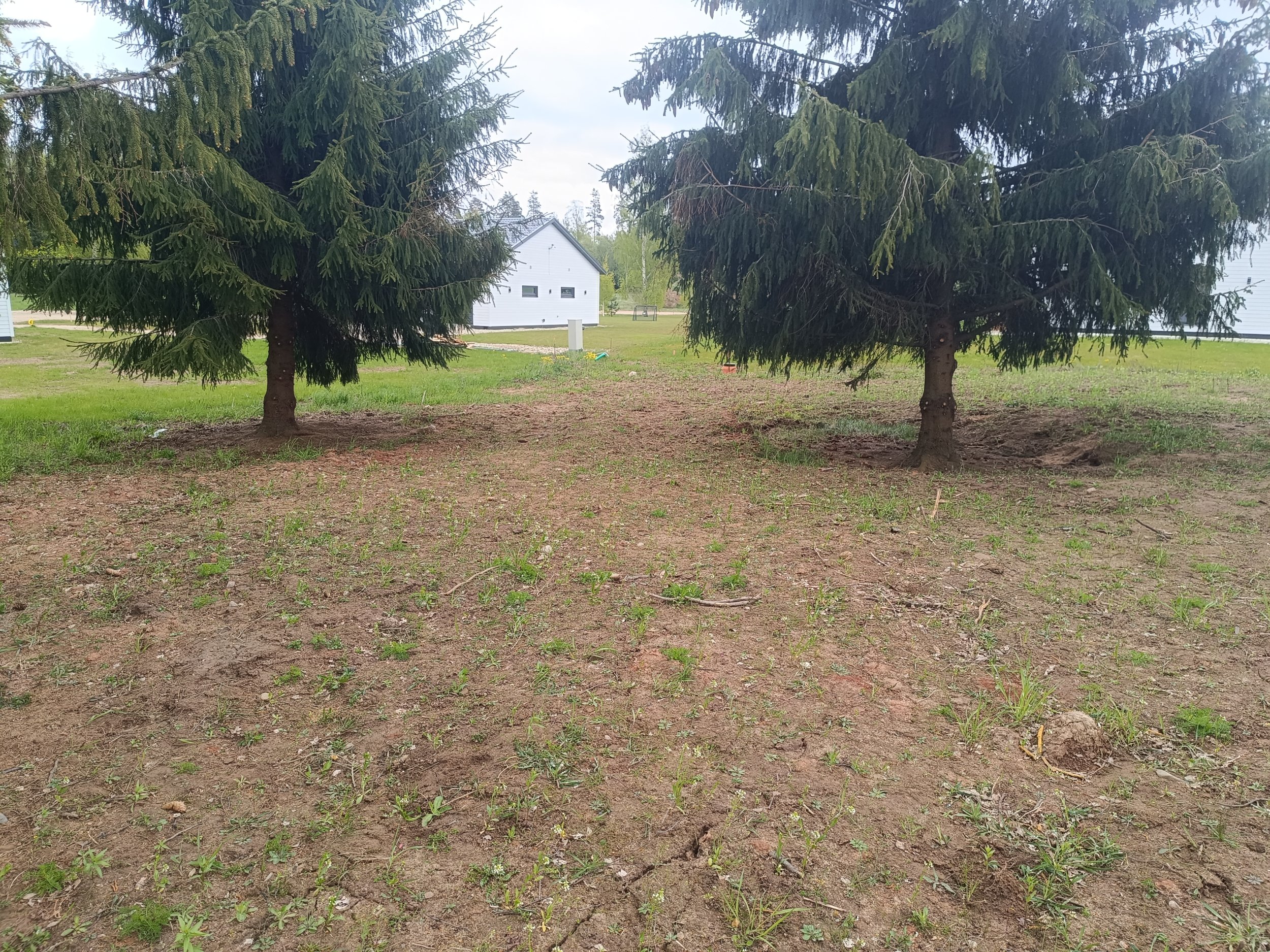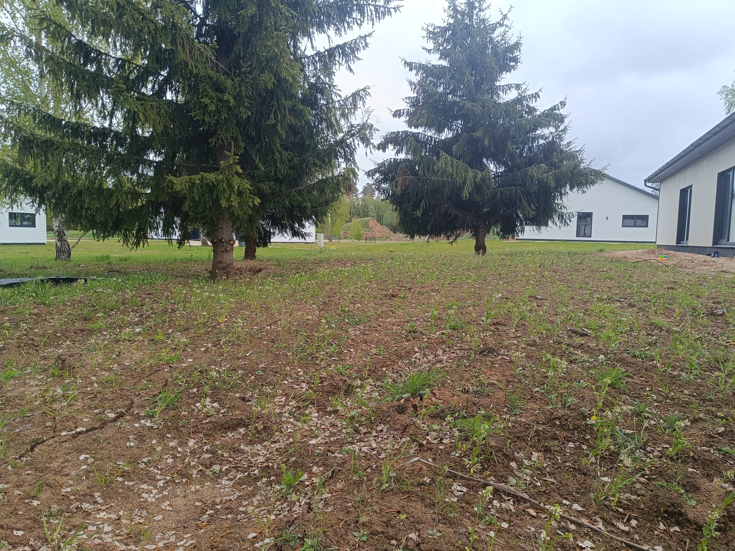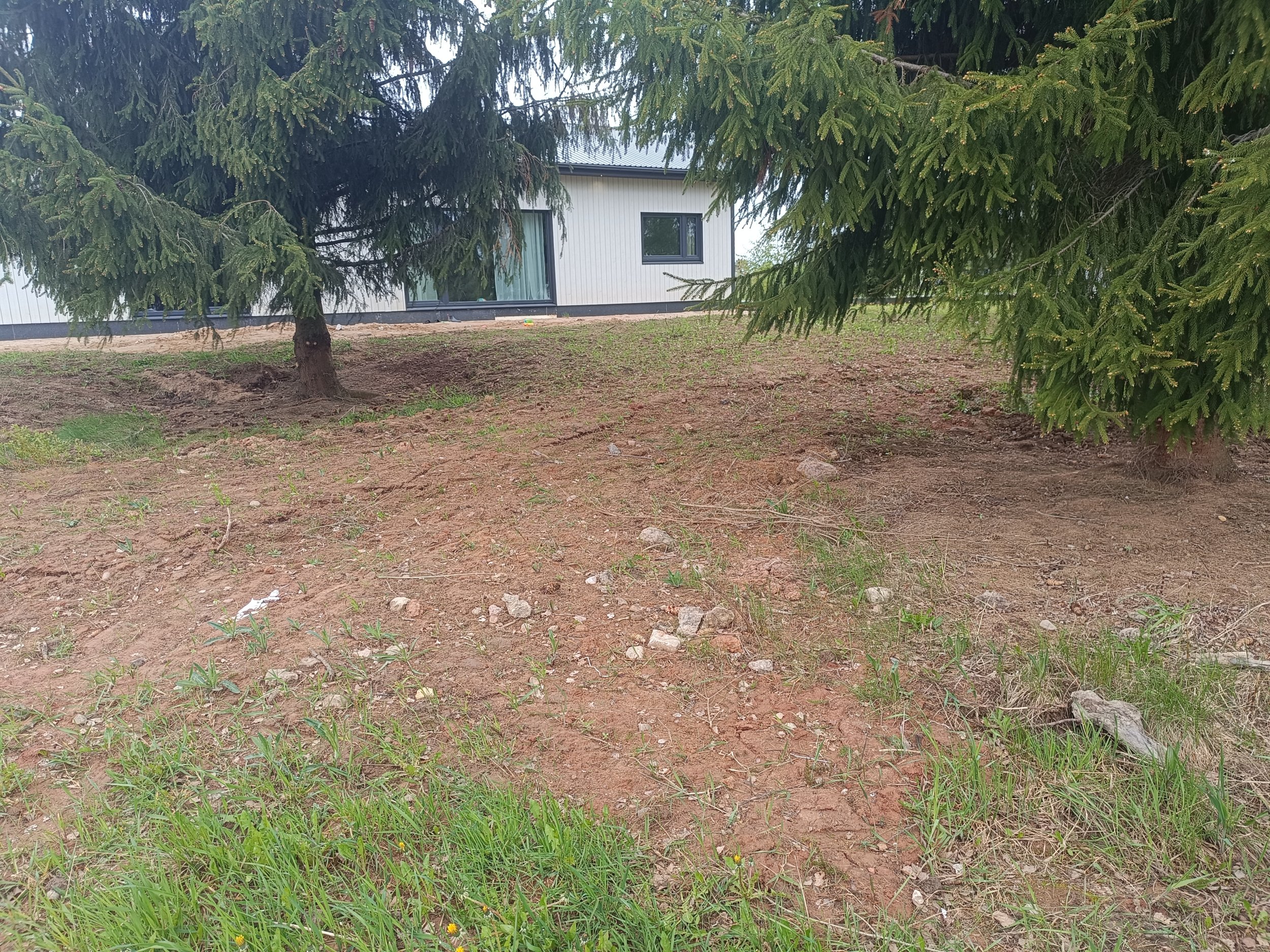 Maja ees vaja pinnas esiti täita (maaküttekontuuri pealne maa), külgedel ja tagahoovis koorida ja tasandada. Krundil mitmed kõrghaljastuspuud, tagahoovis olevatest kuuskedest laseme enne tööde algust kõige olulisemalt haljastust häiriva kuuse eemaldada ja kännu freesida.