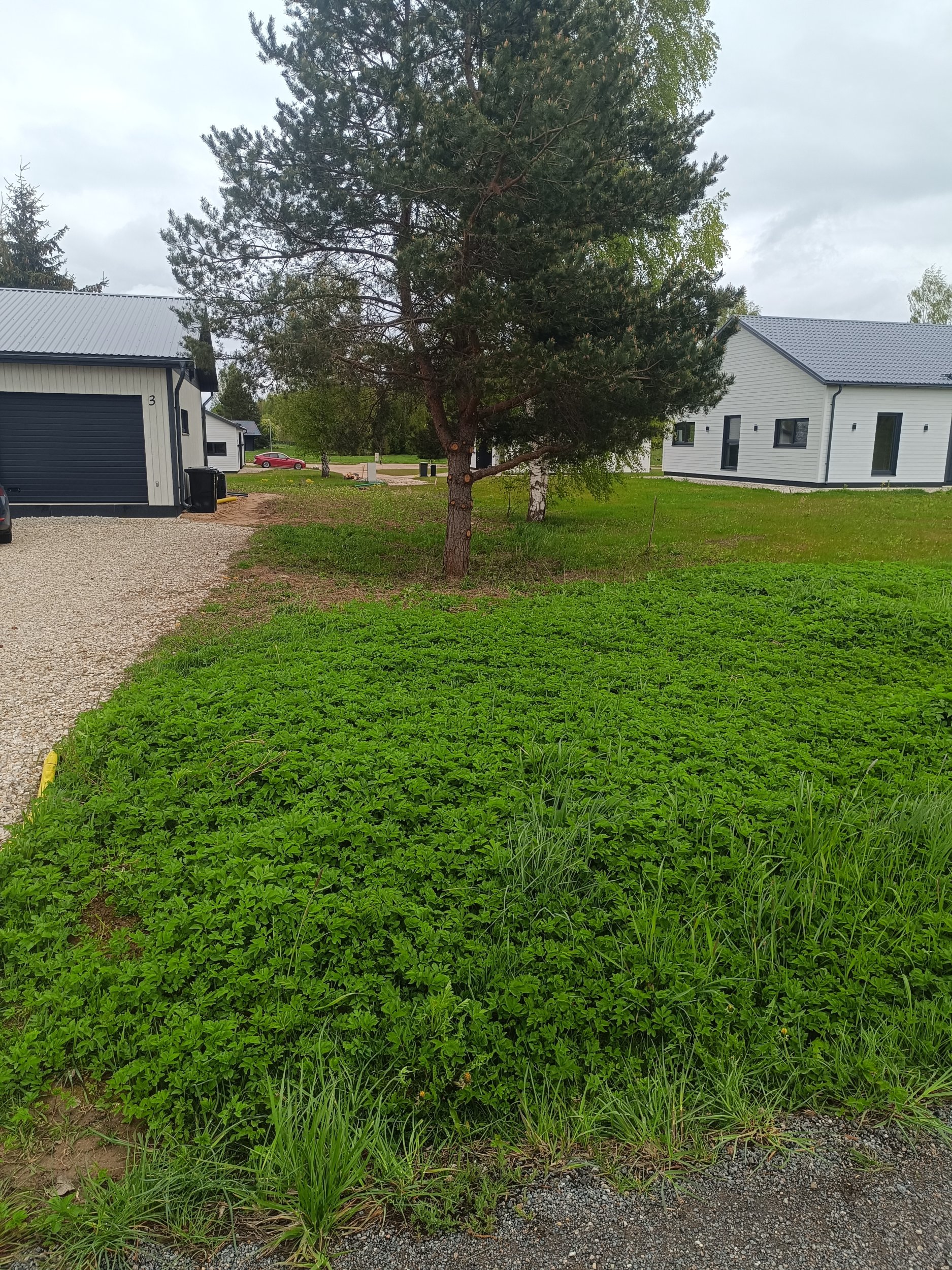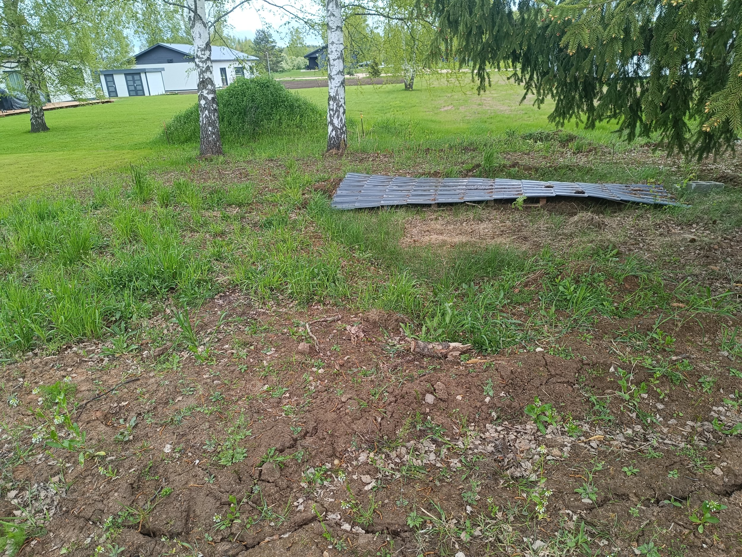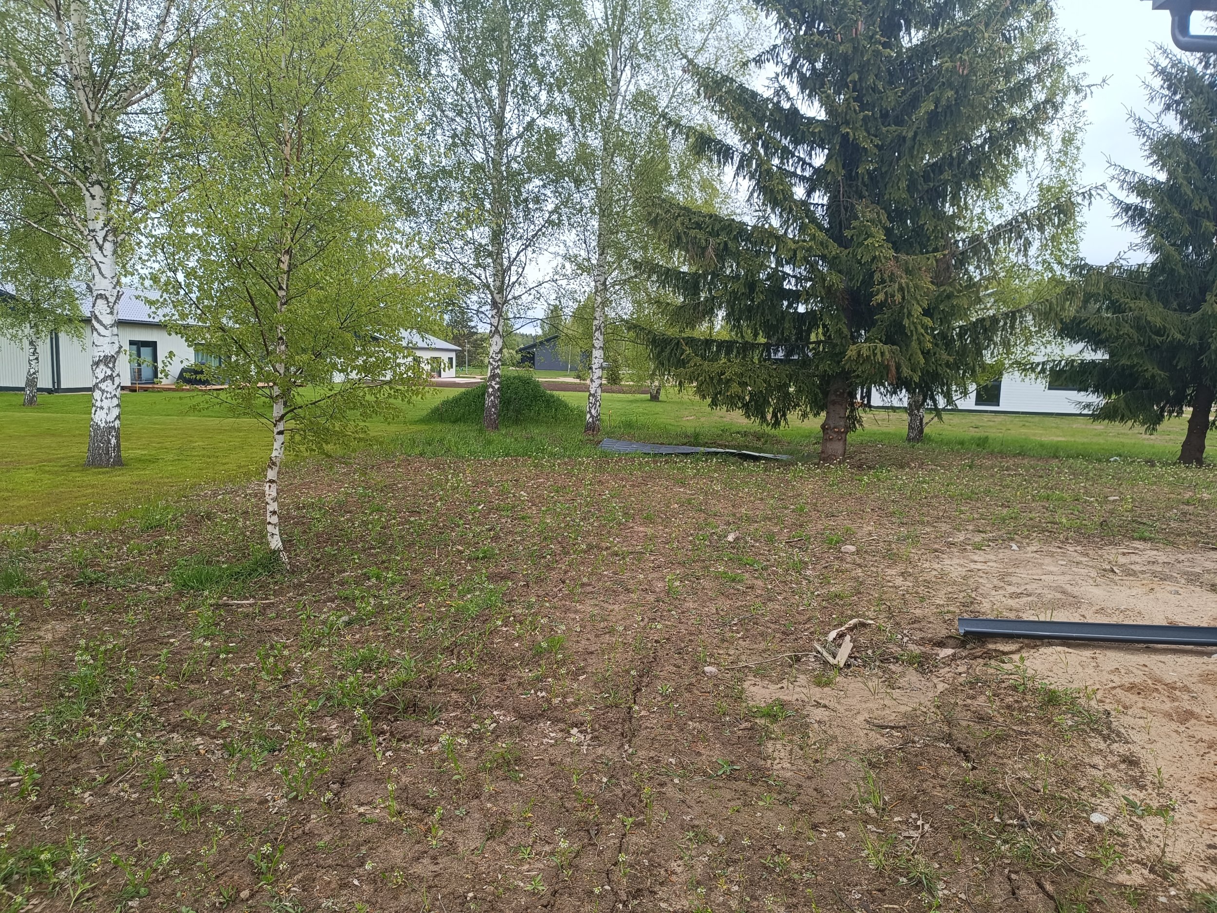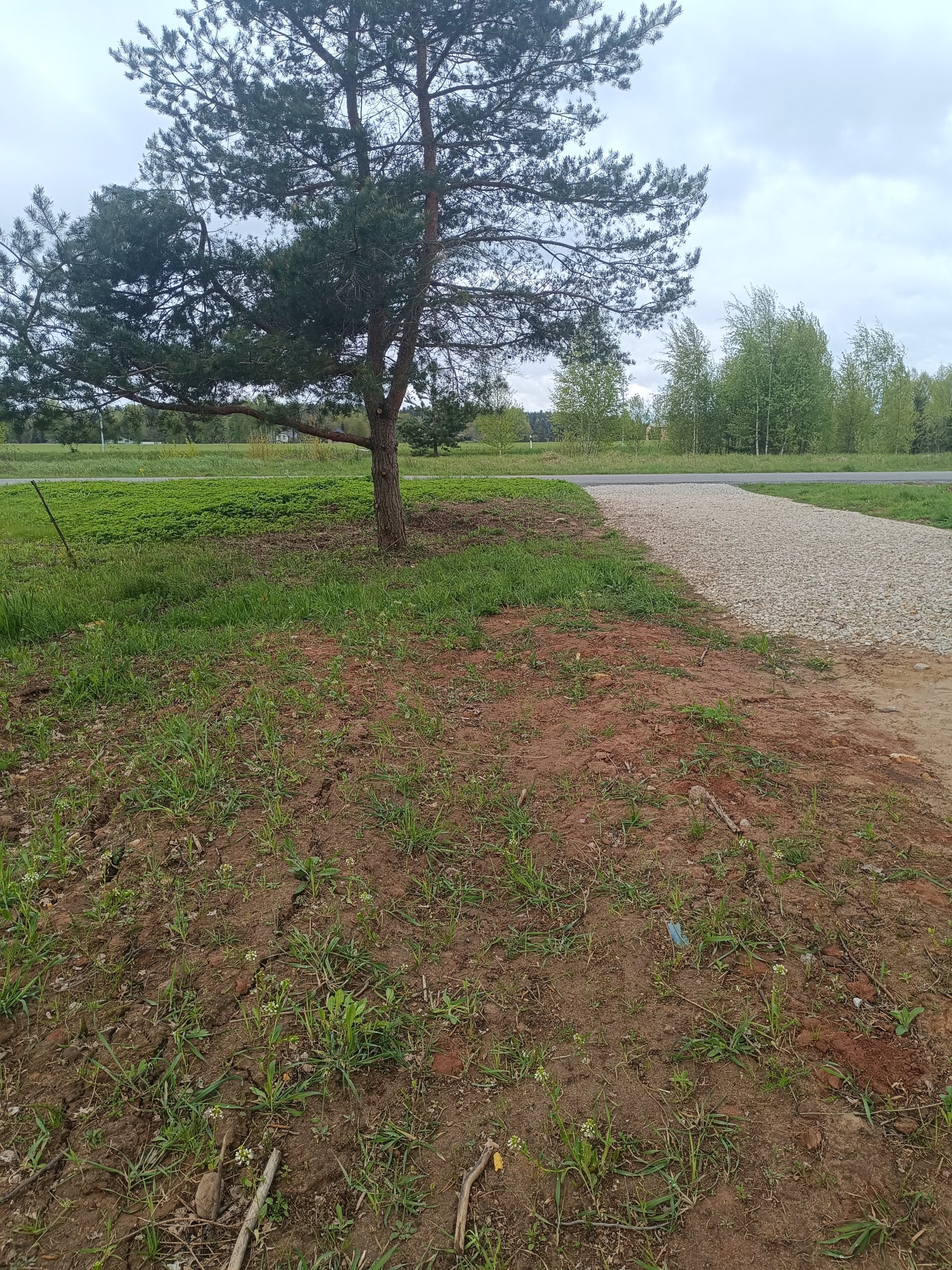 Maja ees vaja pinnas esiti täita (maaküttekontuuri pealne maa), külgedel ja tagahoovis koorida ja tasandada. Krundil mitmed kõrghaljastuspuud, tagahoovis olevatest kuuskedest laseme enne tööde algust kõige olulisemalt haljastust häiriva kuuse eemaldada ja kännu freesida.