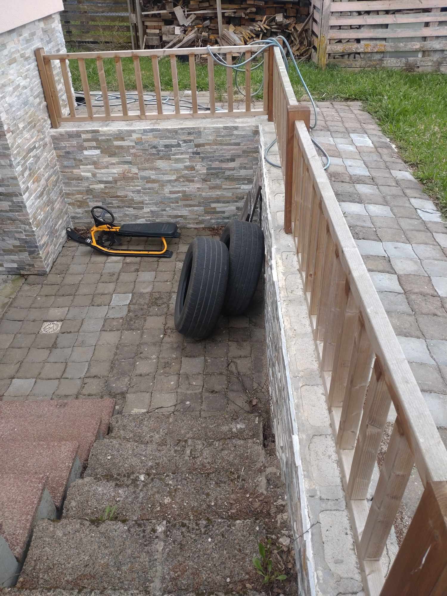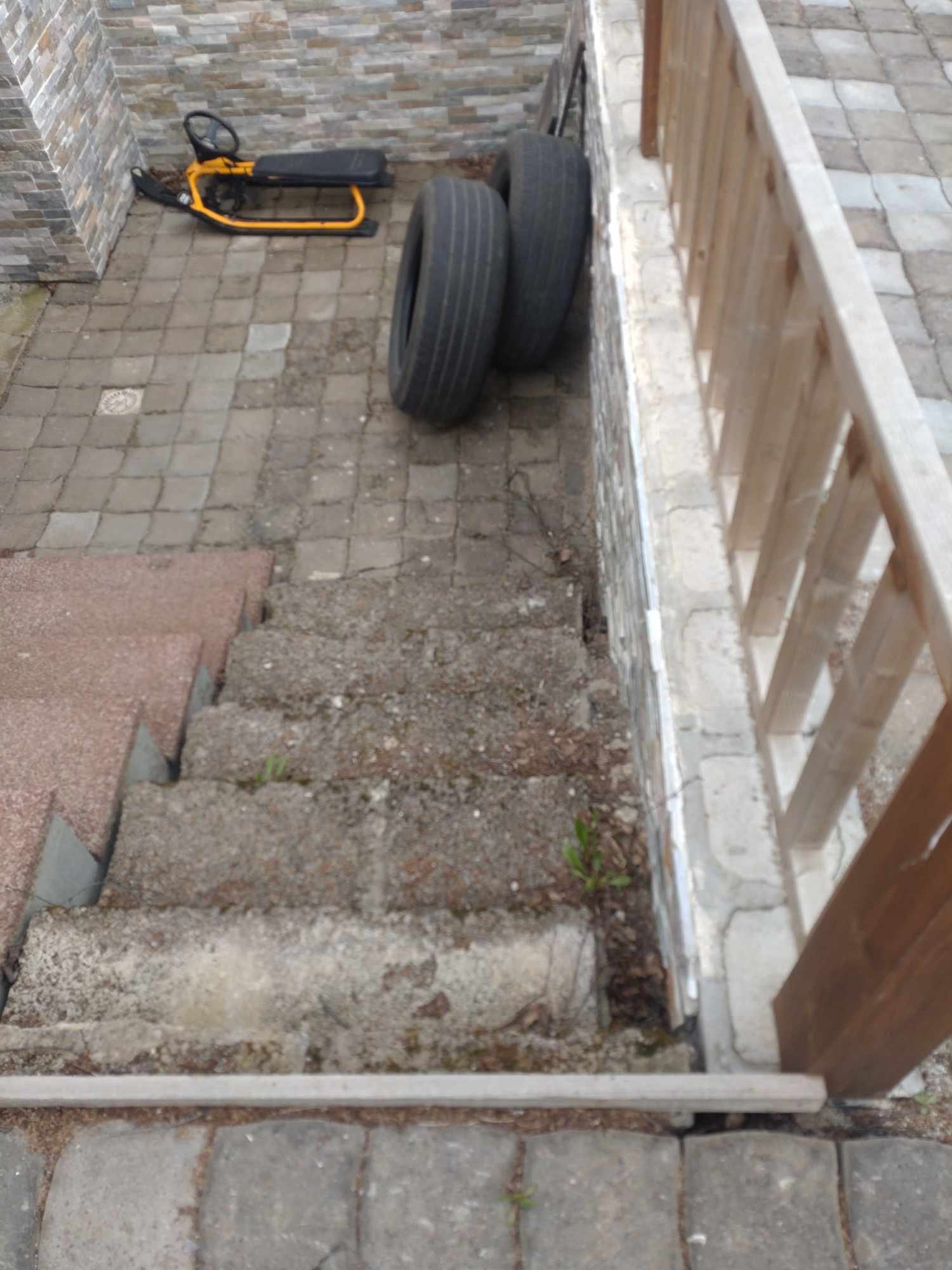 Oleks vaja kinnitada (vasakul pool) olevatele trepiastmetele betoonplaadid. Parem poolsetele astmetele on vaja kinnitada kahest betoonplaadist koosnev kaldtee. Samuti on vaja betoonplaadid kinnitada ülemisele äärele (ümber keldris sisenemise ) ja nende otsa on vaja kinnitada puidust piirded. Plaadid ja piirded olemas, kinnitusi (segu) ei ole.
