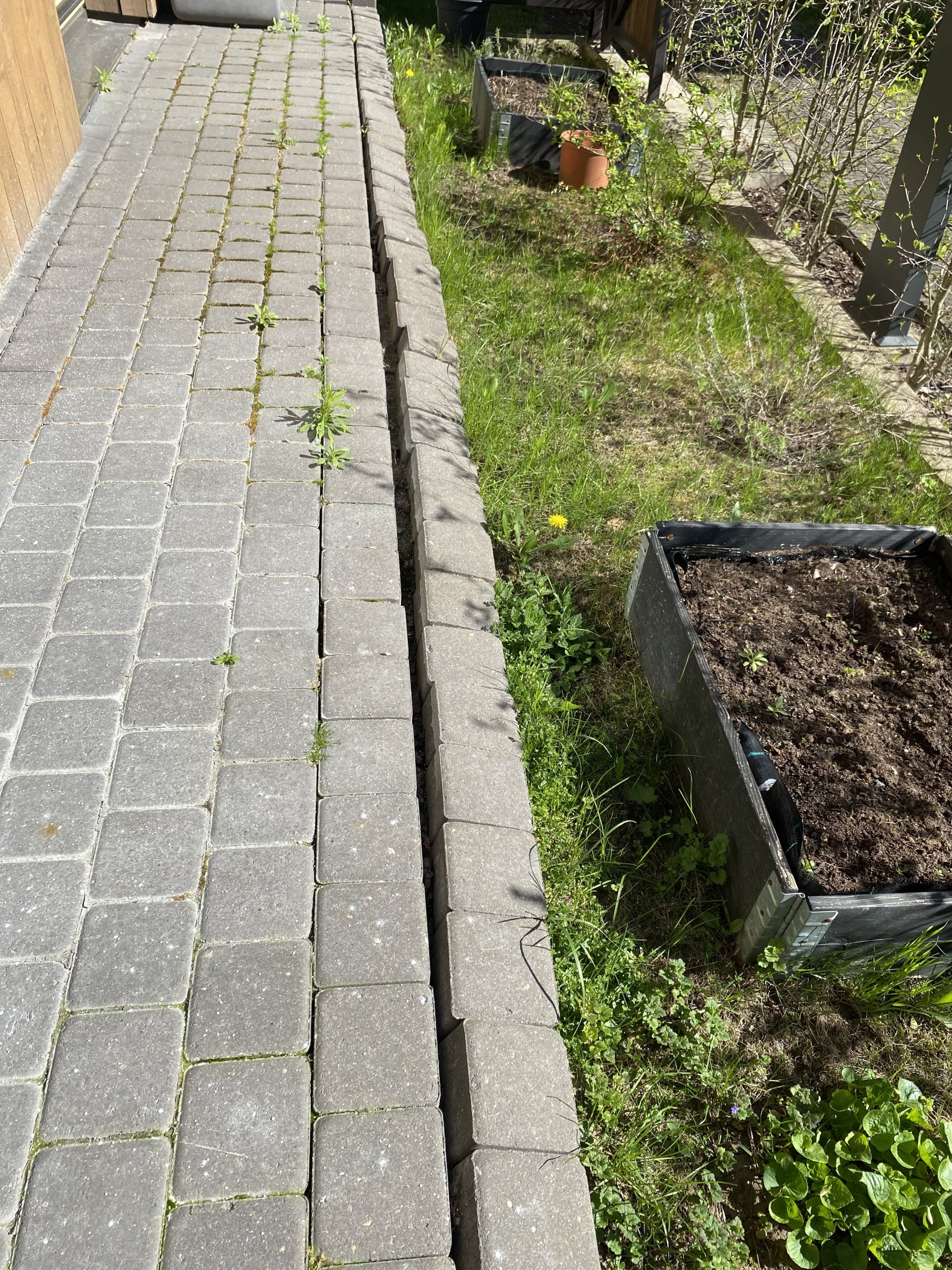 Выровнять завалившийся ряд тротуарной плитки на террасе. Дождями подмыло песок, старый бетонный бортик раскрошился. Нужно снять один-два ряда плитки, подсыпать песок, выровнять, уложить плитку ровно обратно и укрепить край цементом