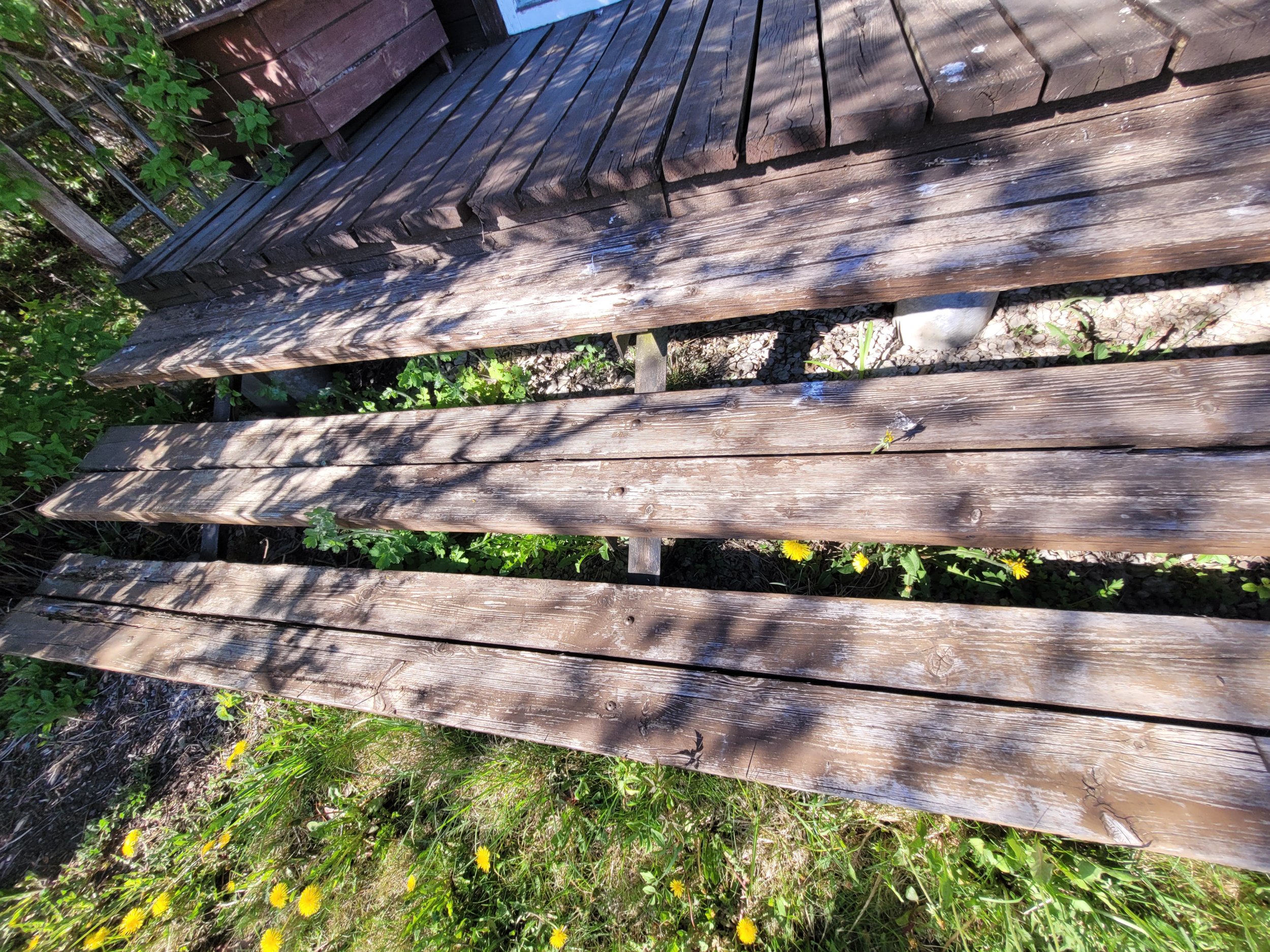 Suvila trepilaudade vahetus ja terrassiosa renoveerimine. Olemasolevate astmelaudade (8 tk) mõõtmed (fotol nr 1) - pikkus 546 cm-486 cm. Paksus 4,5 cm. Laua laius 15 cm (iga trepiaste koosneb kahest lauast, kokku seega trepp 6 lauda). Tõenäoliselt vajalikud ka poldid (olemasolevad on vanad). Iga trepiaste (2st lauast) on kinnitatud metallkonstruktsiooni külge 8 poldiga. Olemasoleva terrassiosa (tasapinna) mõõtmed (fotol nr 2) - laius 140 cm, pikku 468 cm (koosneb 30 lauast).