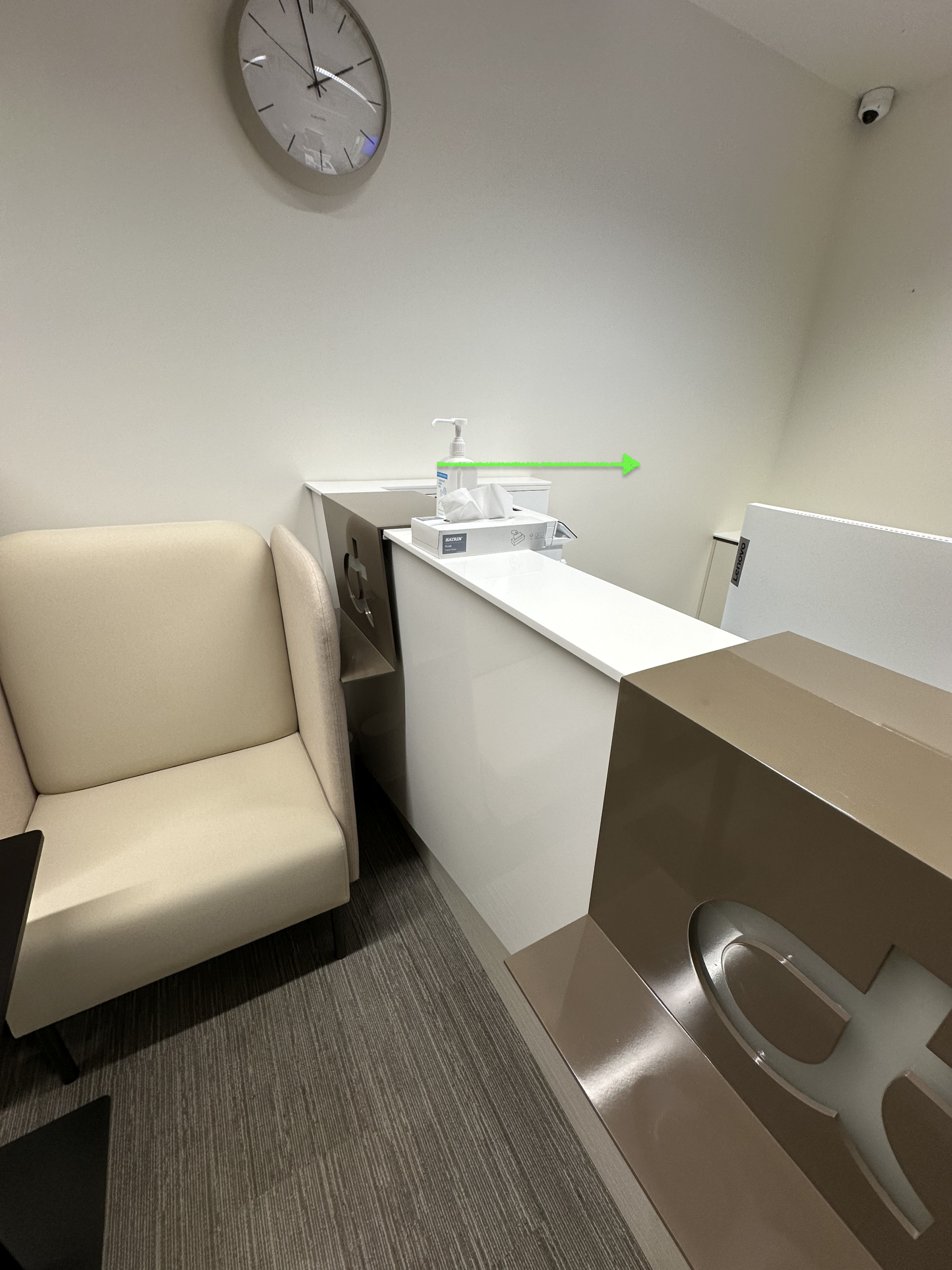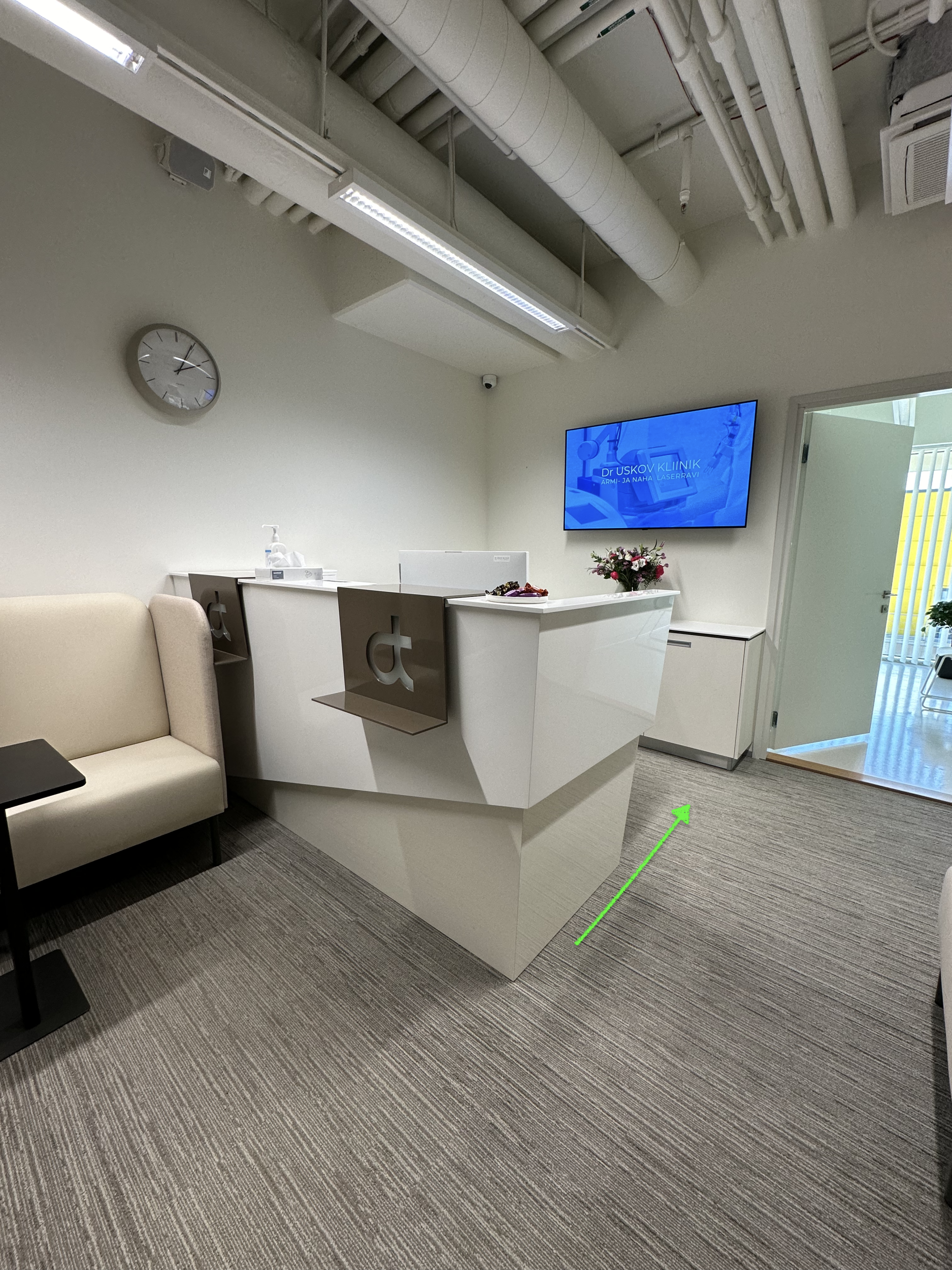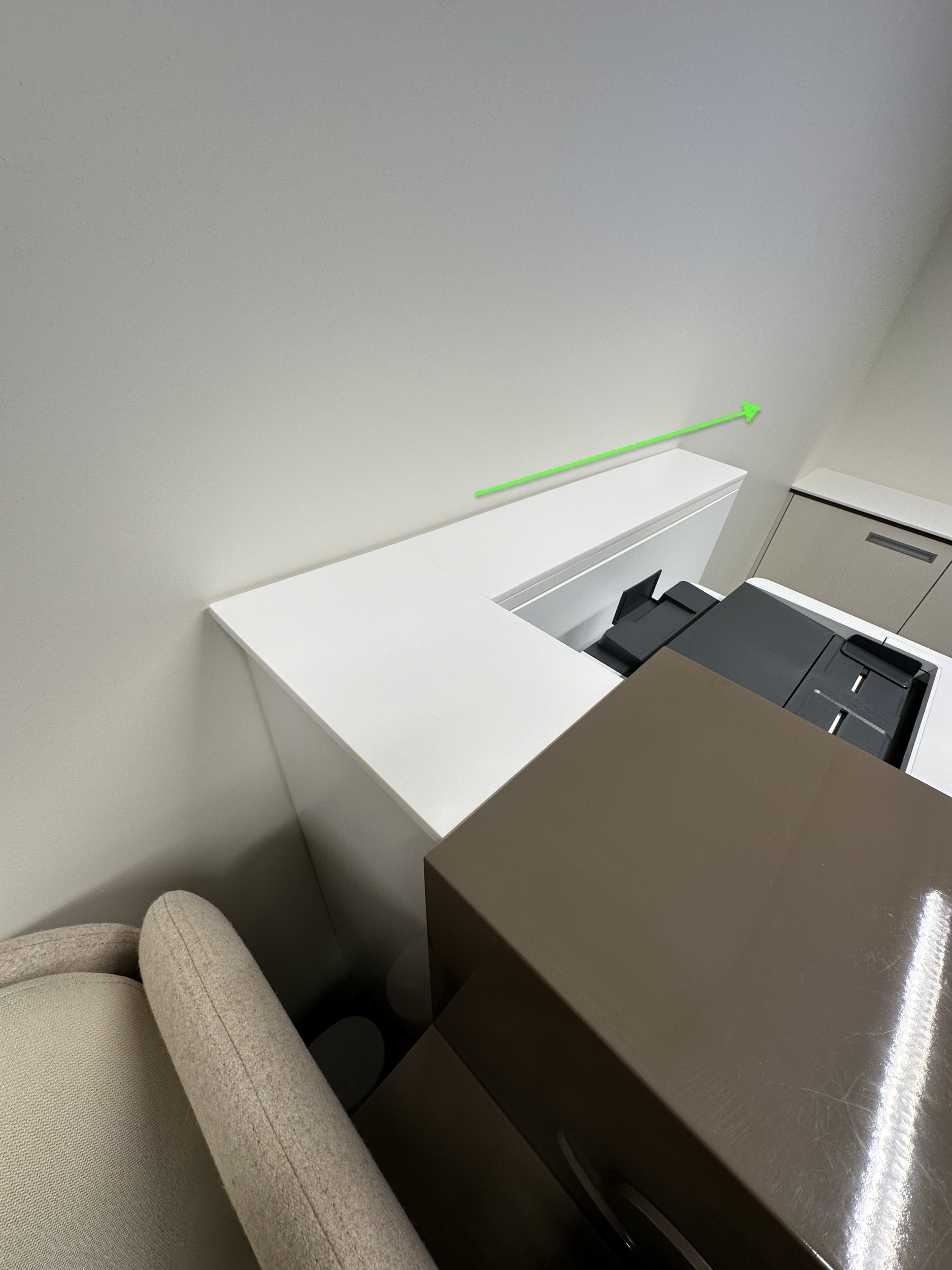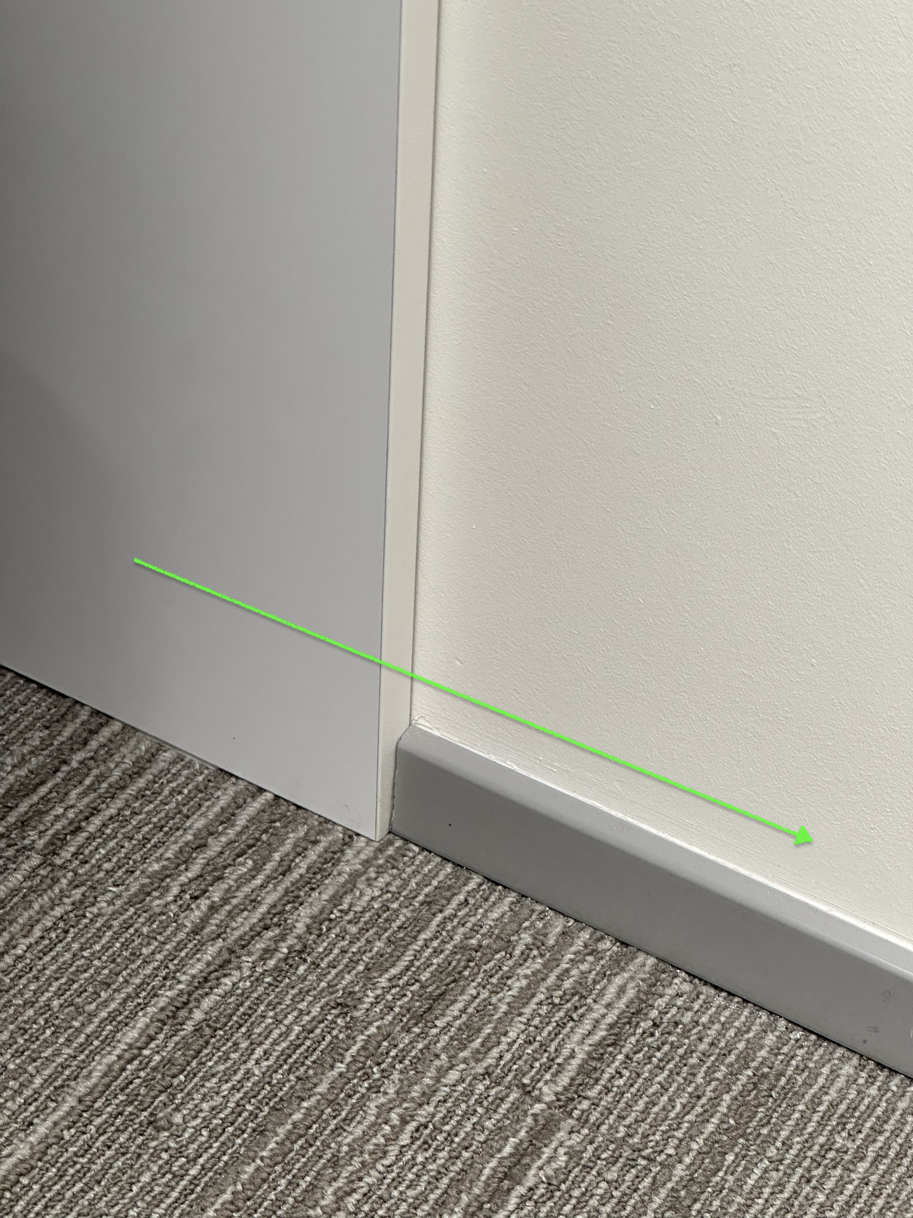 Нужно переместить тяжелую стойку ресепшн примерно на 70 см (обязательно нужна пара человек, я пробовал один, но не смог даже ее толком поднять, возможно, она прикреплена к стене или полу), аккуратно снять фрагмент плинтуса со стены, аккуратно распилить и переставить его, заклеить аккуратно стыки белым силиконом, чтобы было аккуратно и незаметно