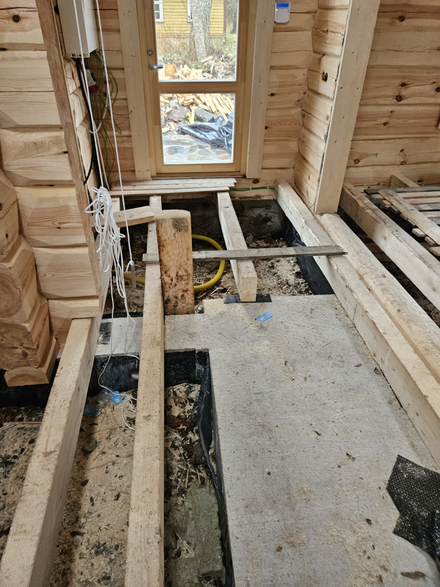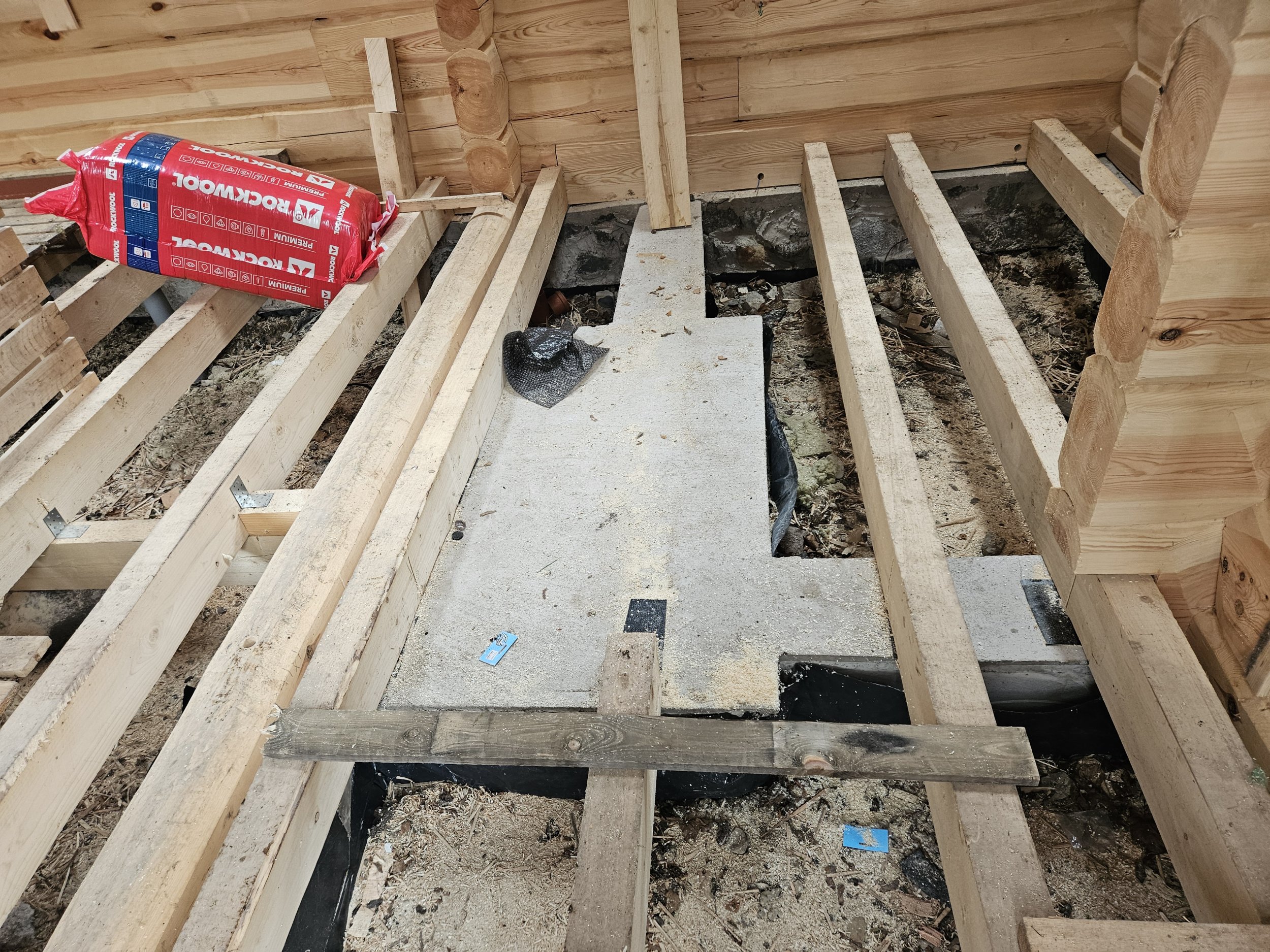 Palkmaja musta aluspõranda tegemine, üldpind 75 m2. Tuuletõkkeks alla talade vahele 12mmOSB, soojustuseks kivivill peale 22mm OSB. Põranda alla laiali visata 10 cm liiva /liiva saab transportööriga läbi akna maja keskele hunnikusse/