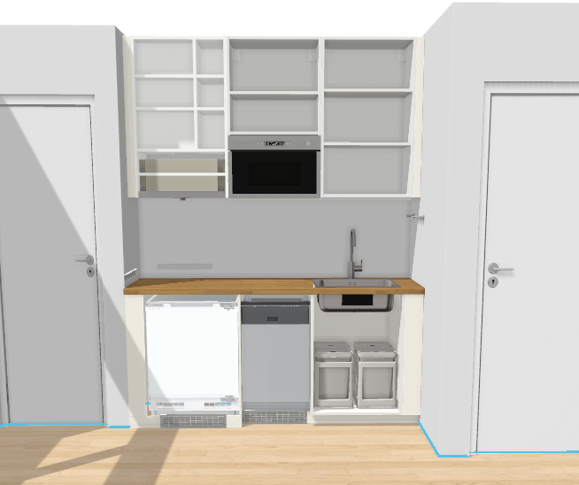 - alumiste kappide ja töötasapinna paigaldus 3 moodulit, sh integ. külmkapp, nõudepesumasin, pliidiplaat ja valamu,