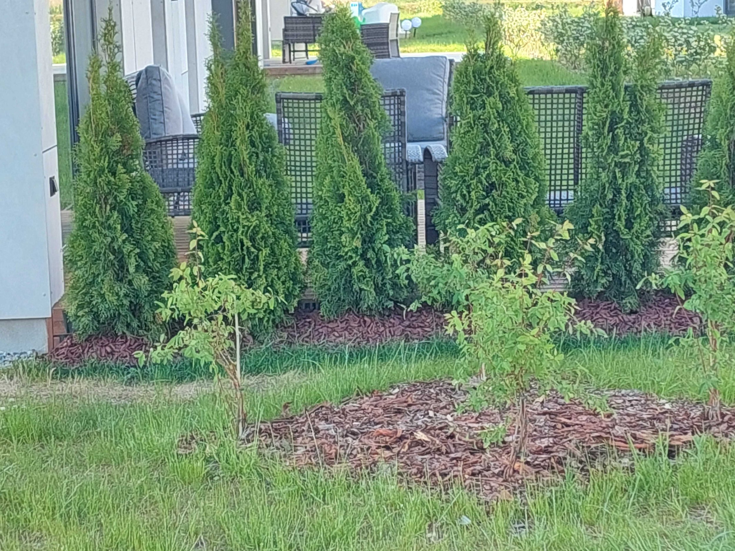 Planning and excavation works Thuja plants and sticks Mulch and mulching |