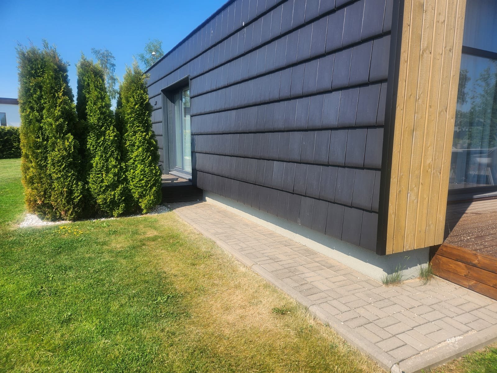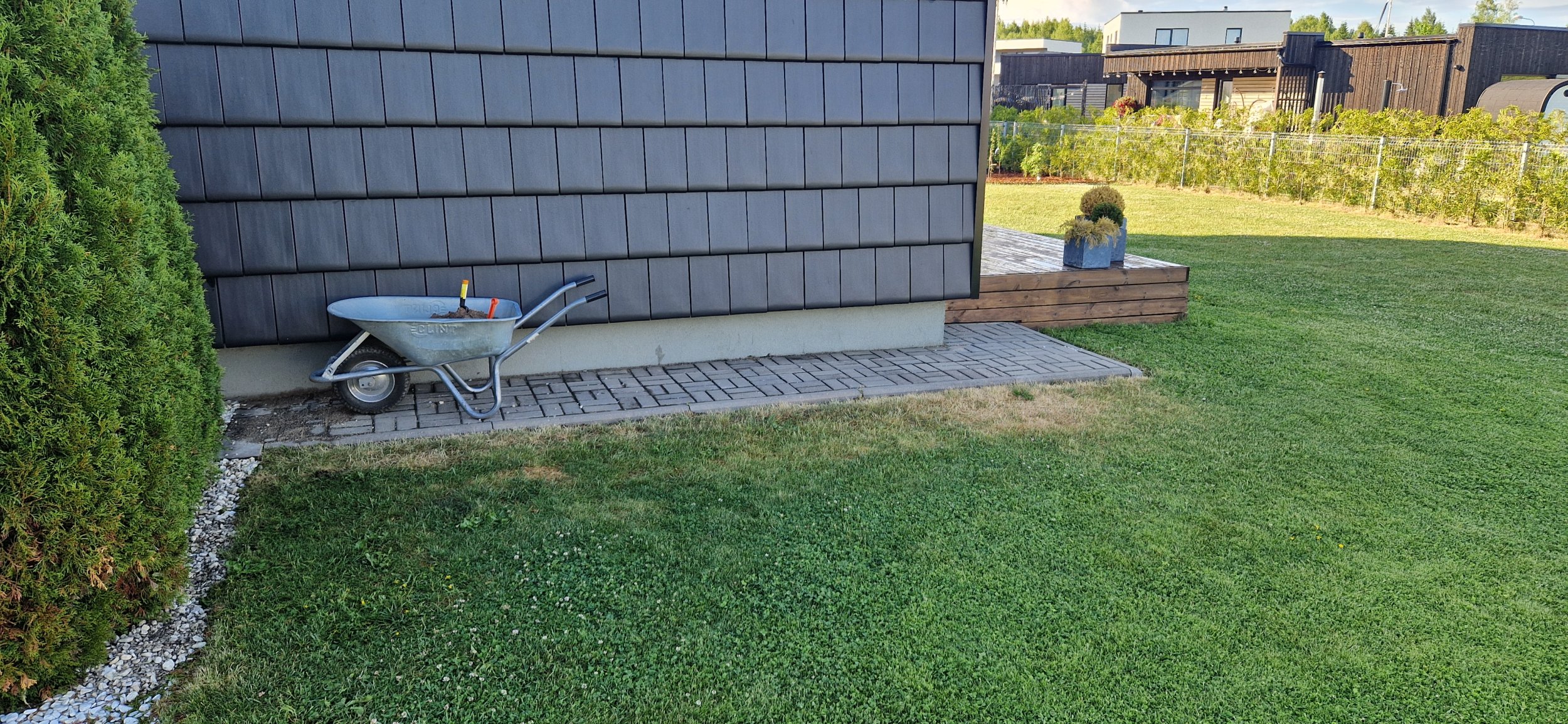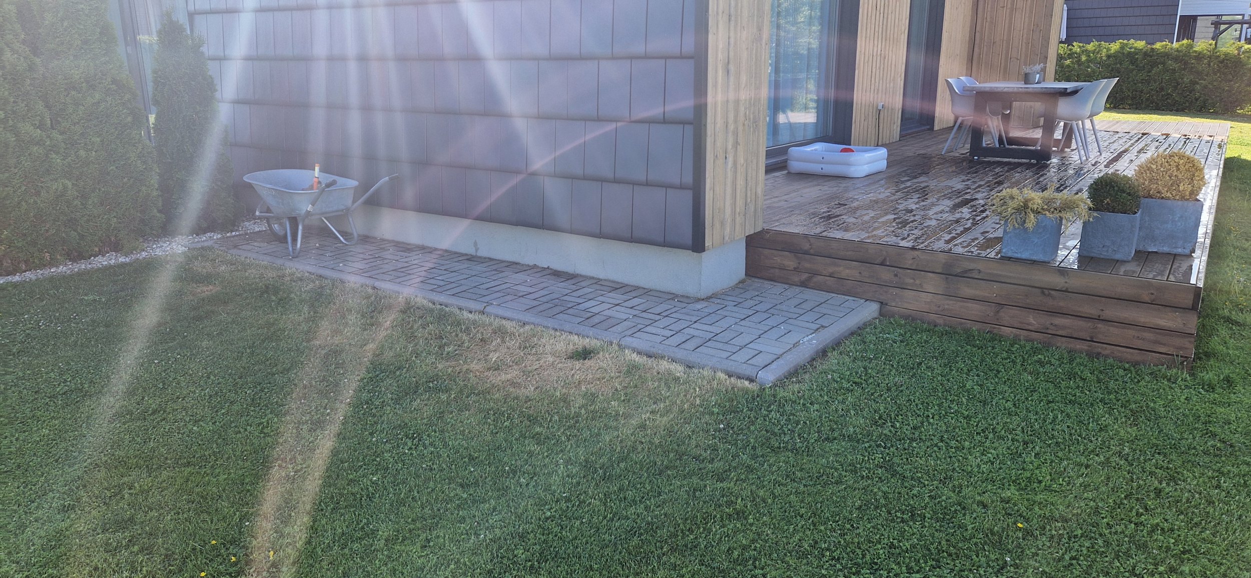 Maja ääres olev sillutiskivi jääb terrassi alla. Muru võib alles jääda, aga muru peale sooviks geotekstiili või kilet. Terrassi mõõtmed jäävad ca 3,5-3,6m lai ning pikkuseks 5,2-5,3 m ning kõrguseks ca 40 cm. Olemasoleva terrassiga tuleks kõrguslikult kokku viia. Terrassi ette sooviks ka saada treppi. Terrassi laua laiuse võib töövõtja ise valida aga pind peab olema sile mitte sooneline/krobe.