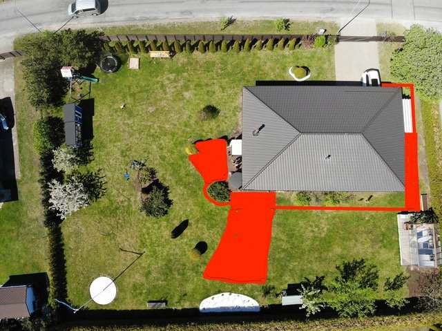 olev punane joon on 1.5 meetrit lai. Maja kõrvale tuleb suurem ala ja maja taha laiem tee ca 3m kõrvalhooneni. Kokku on ca 100 m2.