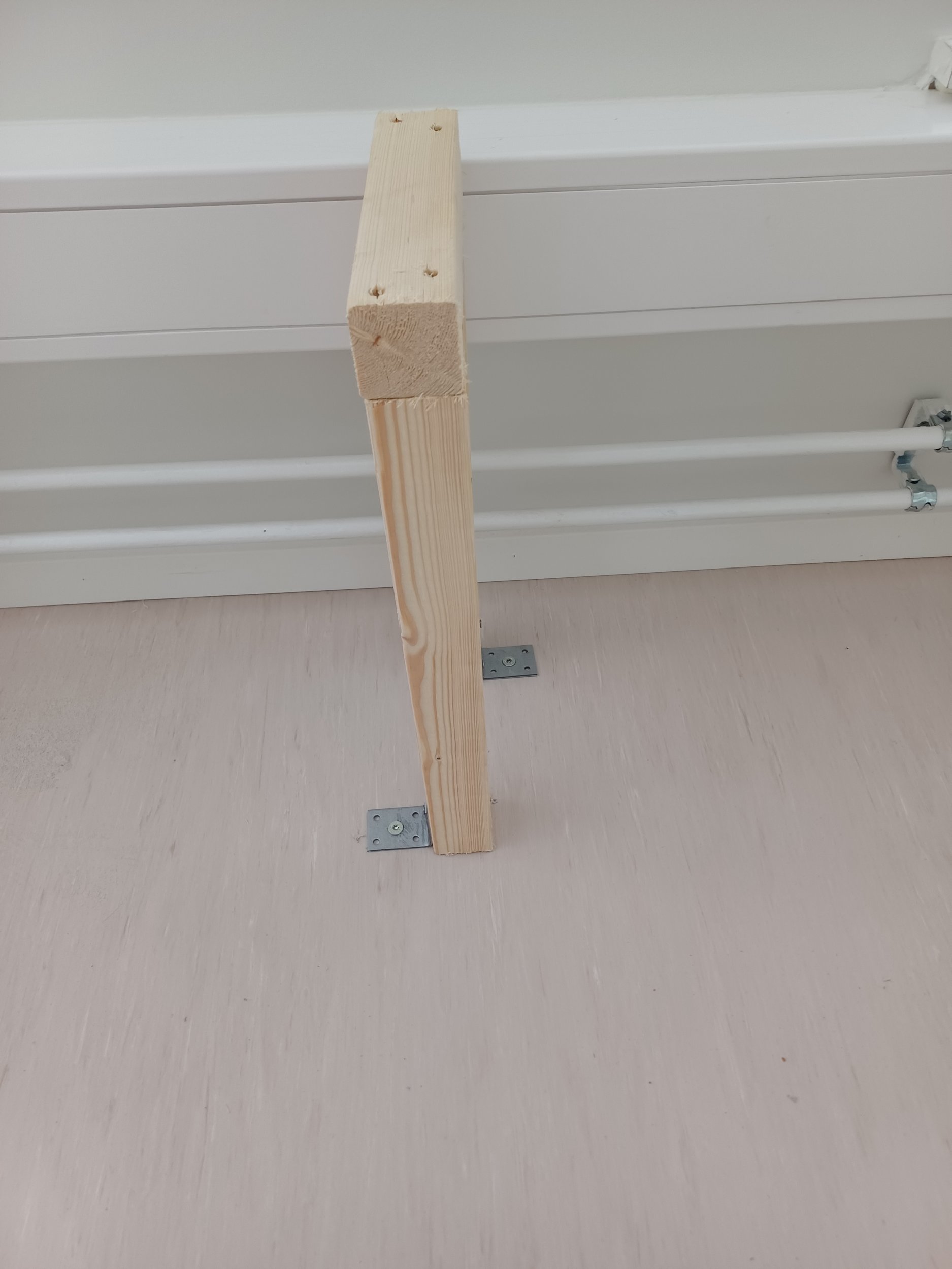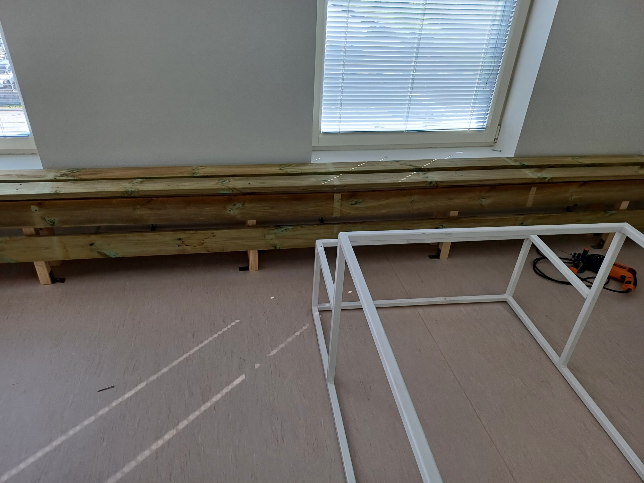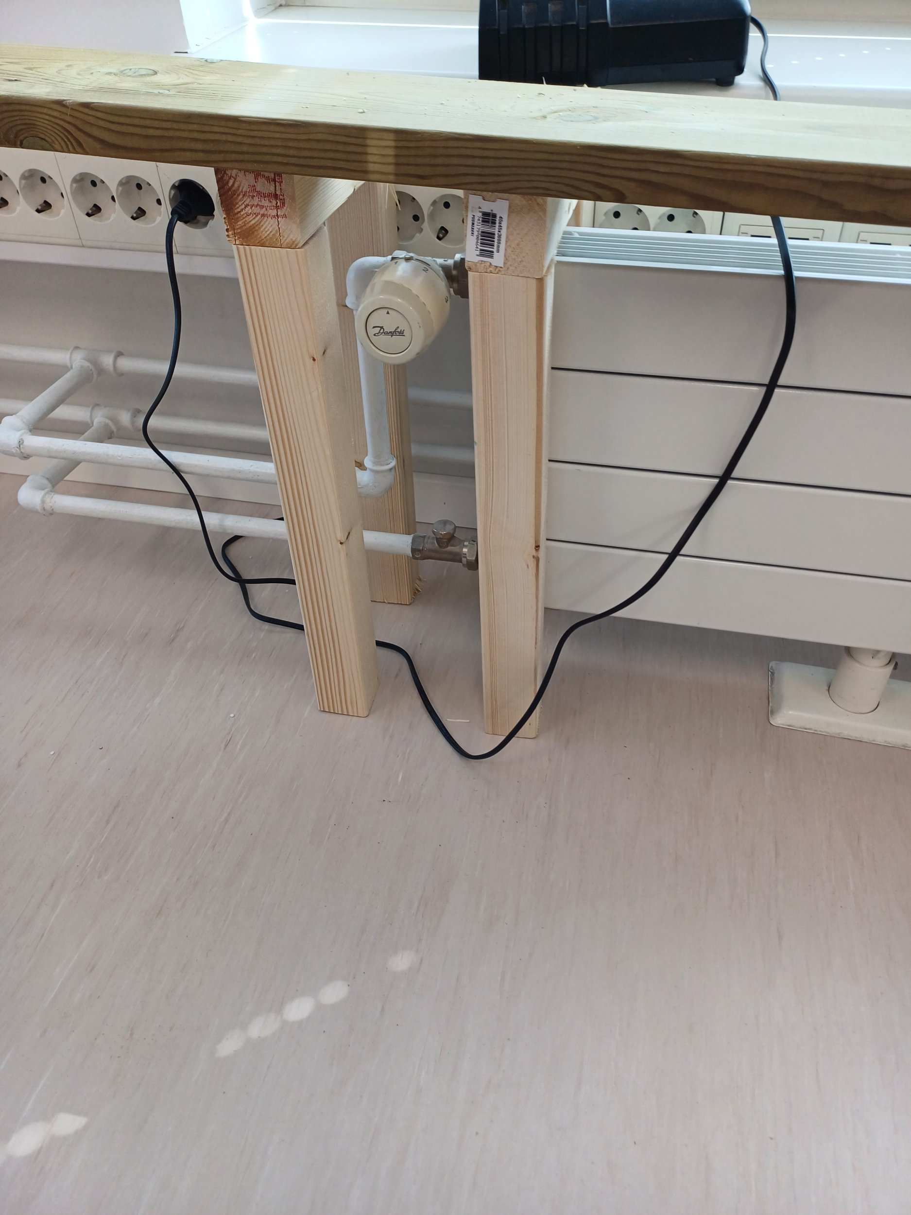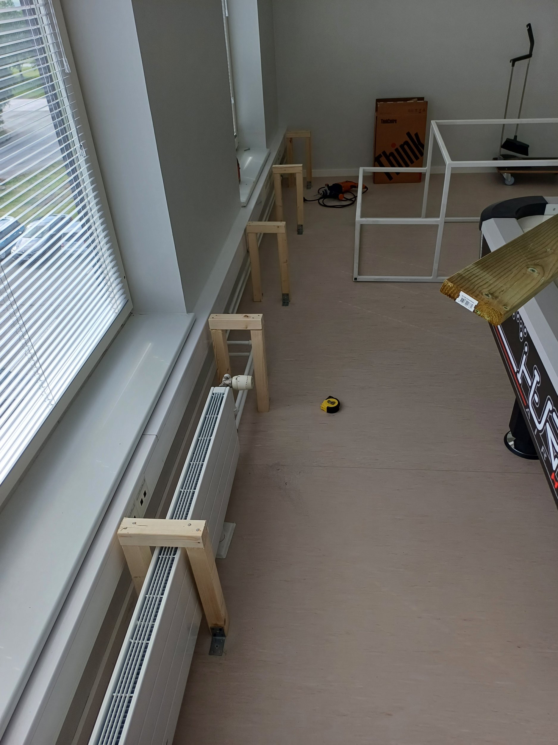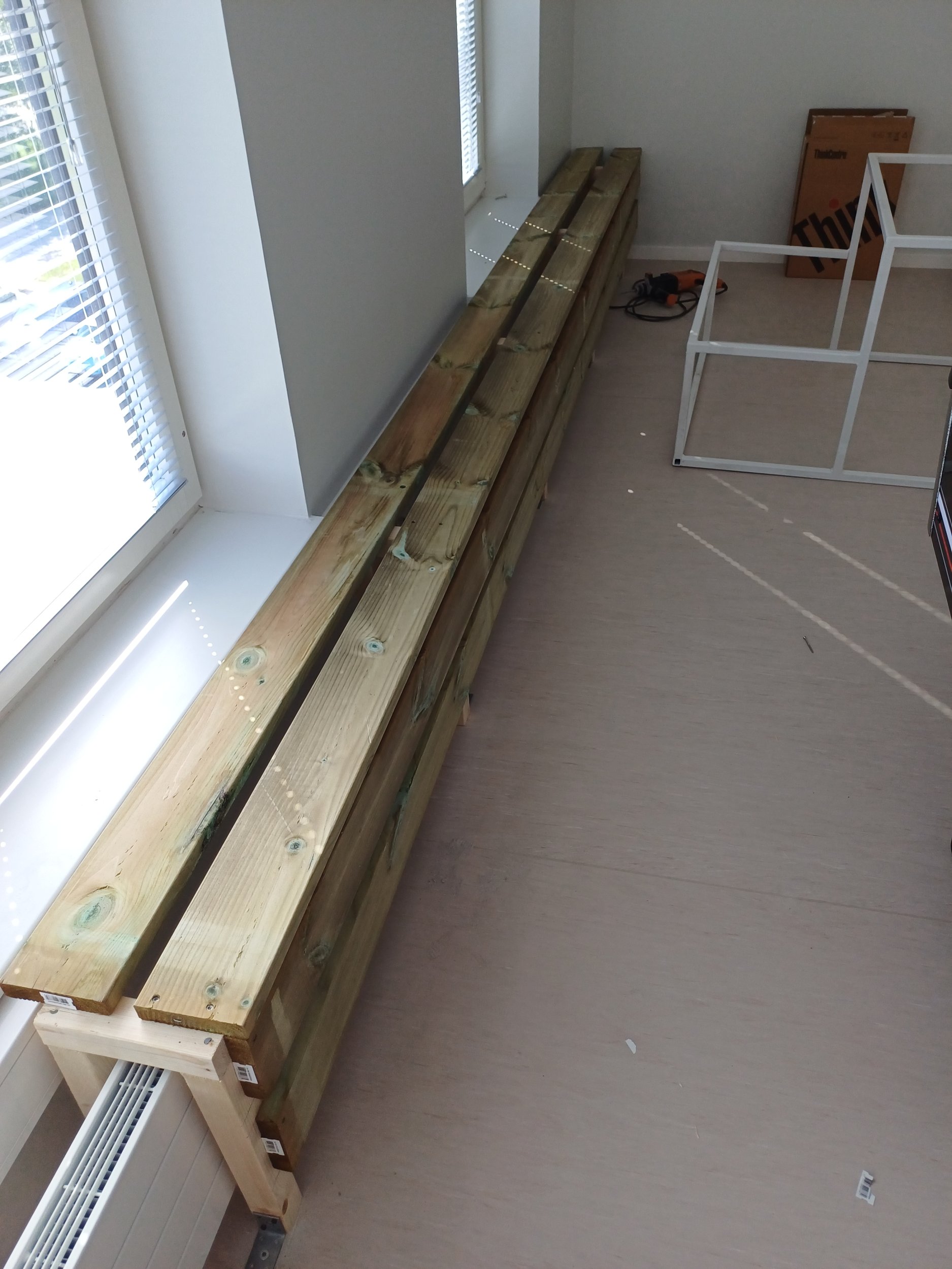 Tuleks ehitada umbes 60 meetrit radiaatorite ja torude kaitset nagu piltidel on näha (esimesed 4,2 meetrit on ehitatud). U-kujulised karkassid on valmis lõigatud ja kokku pandud ning ka nurgikud on külge pandud. Karkassid tuleb ca meetrise vahega betoonpõranda külge kinnitada (piisab kui panna kahe nurgikuga üle ühe) ja terrassilaud (4 lauda, kaks peale ja kaks küljele) peale panna (4,2 meetrine laud). 9-s kohas tuleb jätta ülemine küljelaud panemata ca 10 cm ulatuses, et saaks termostaadiga radiaatori temperatuuri reguleerida (viimasel pildil näha). 1-s kohas tuleb jätta ülemine küljelaud ja pealmised lauad panemata ca 10 cm ulatuses, et saaks termostaadiga radiaatori temperatuuri reguleerida ja pääsed kahele elektripistikule ligi.
