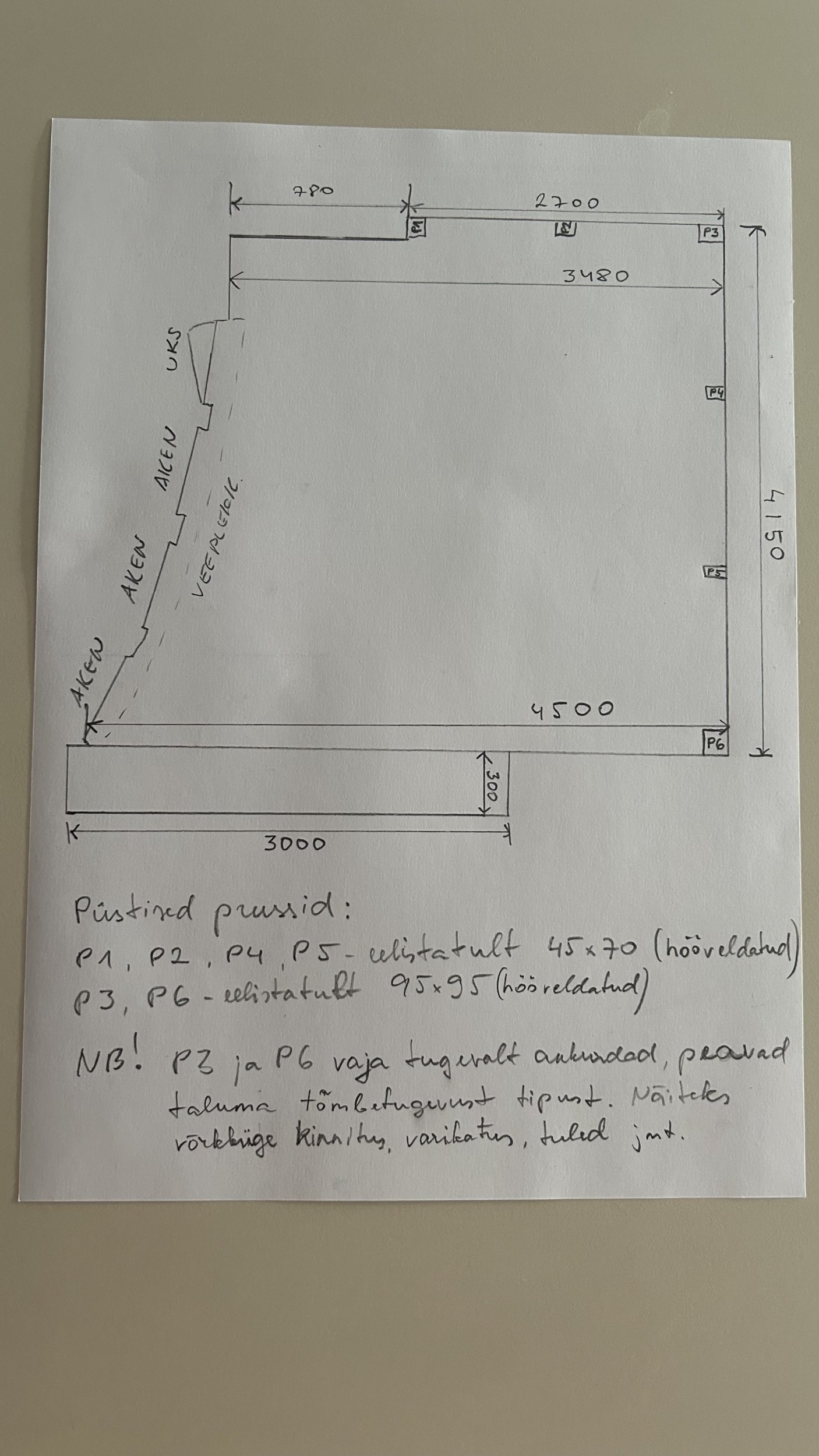 Pane piltidelt tähele! Uue terrassi puhul ei tellita vahepealseid “ribisid” seinapaneeli . Samas, erinevalt praegusest lahendusest tuleb kõik 6 vertikaalset prussi arvestada kõrgusega 2500mm terrassi pinnast. Vt joonist. Olemasolevatel vertikaalsetel postidel ei ole täna ankurdust, kuid uutel on vaja. Nurgapostidel korralikku, vahepealsed prussid peavad lihtsalt stabiilsed olema.