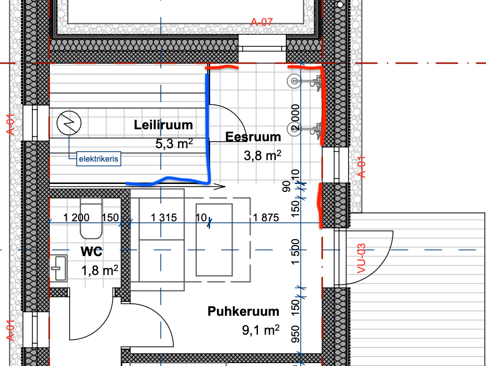 Töö sisuks leiliruumi ehitamine ning lisaks eesruumi põranda plaatimine, osaline seinte plaatimine, segistite ja trapi paigaldus (segistid ja trap juba olemas). Lisaks elektrikeris nuti juhtimisega. Ruumi joonis koos mõõtudega lisatud kokku 18,2m2. Punasega märgitud seinad on plaadi alla mõeldud ning sinisega märgitud leiliruumisein peaks tulema klaasist. Plaadid töö tellija poolt, kõik muu materjal töö teostaja poolt. Leiliruumi toonid pigem heledamad ning klaas tumedam.