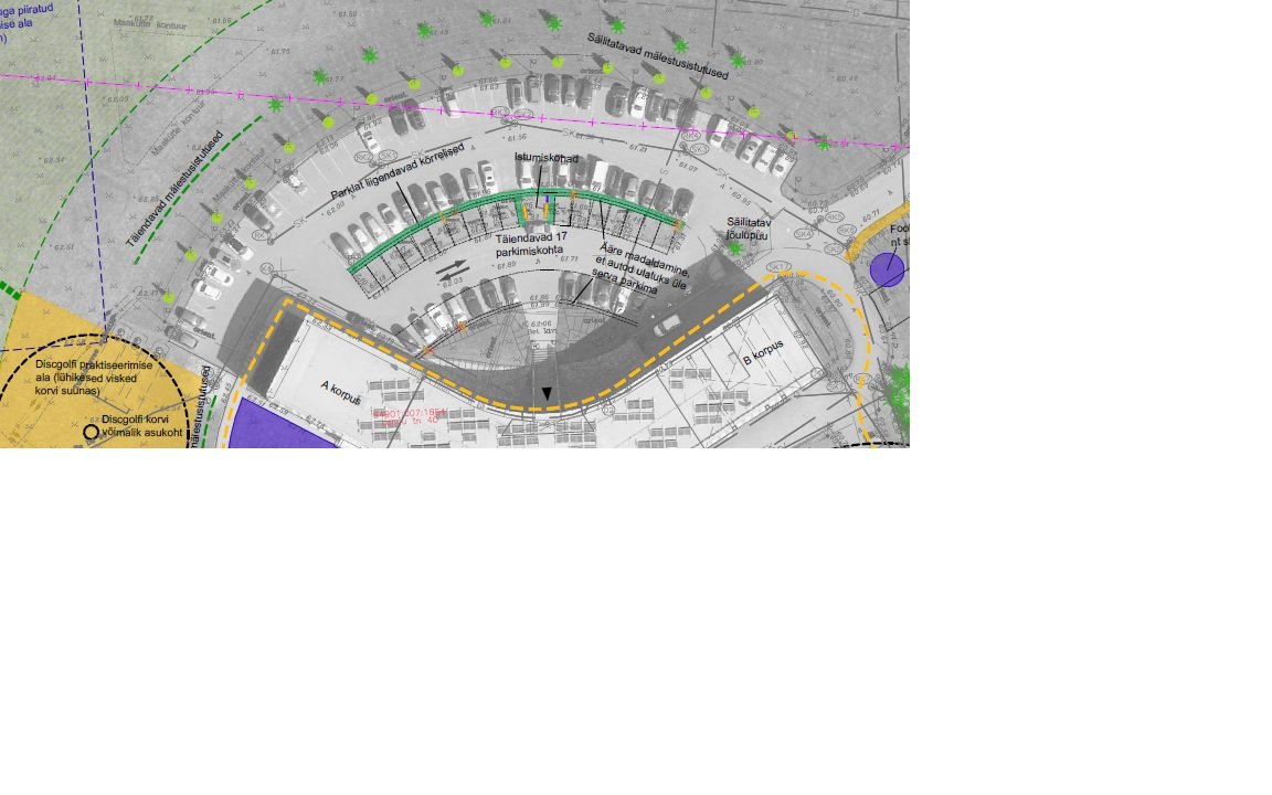 Projekteerida olemasolevale parklale lisakohad. Olemas maastikuarhitekti väliruumi ümberkujundamise esmane tsoneering ja ümberkujundamise põhimõtted, kus esmane lahendus pakutud. Olemasoleva parkla osa laius 5+7m, mururibade arvelt võimalik juurde saada 4+1m. Piirnevaid välisvalgusteid projektiga ei lahendata. Soov saada projekt, mille alusel võrdlevaid pakkumisi võtta. Geoalus uuendatud 2023
