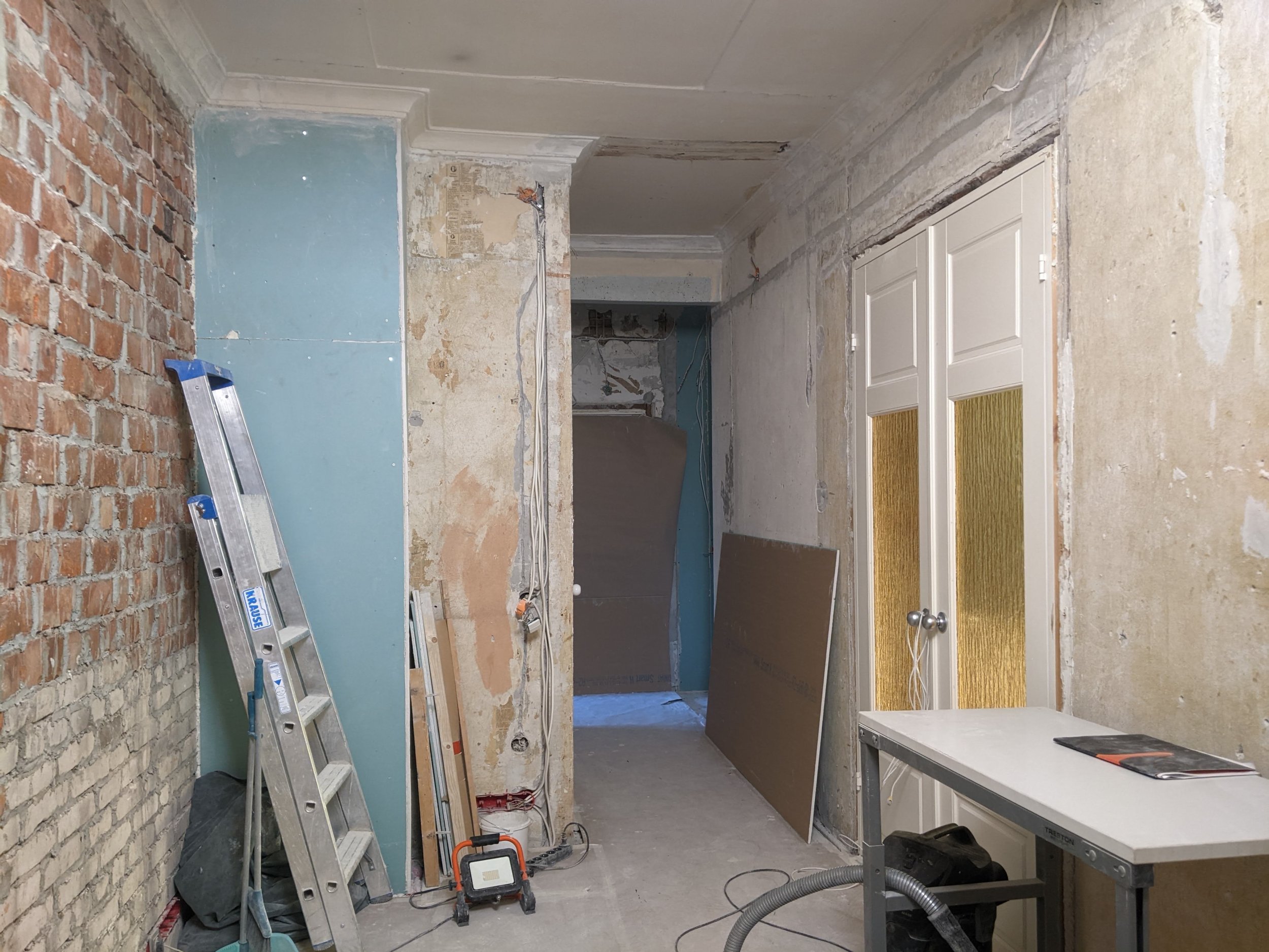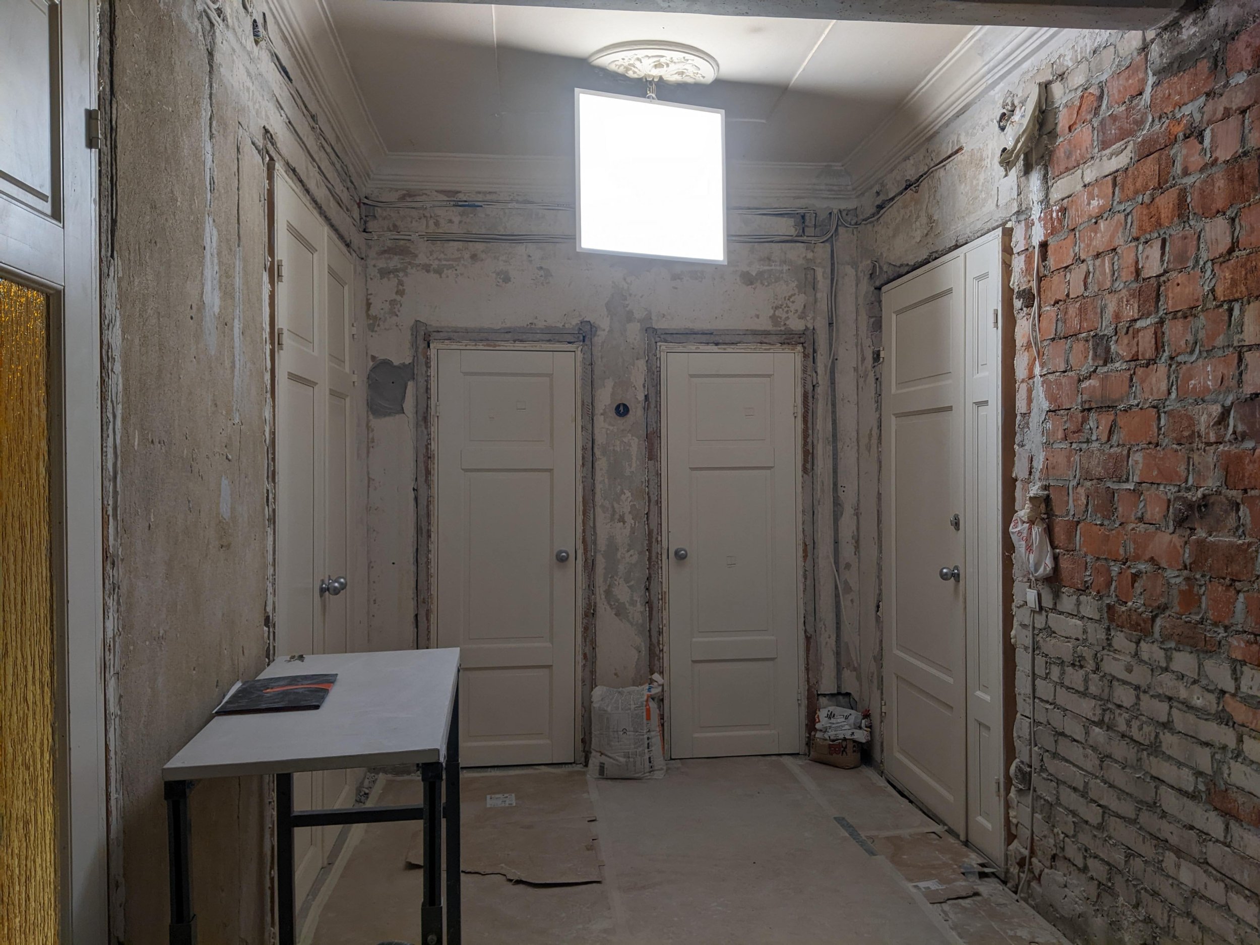 Seina pinda 36 m2, ilma usteta. Uksed seinaga tasa, tulevad liistud peale. Punasest tellisest sein on ebatasane, ühes servas tuleb krohvi paksus ilmselt ca 3 cm, teises 1 cm, päris loodi ei pea ajama, aga et oleks piisavalt tasane, et saab kapi või laua seina äärde panna. Enamus seinast nagu pildilt näha, valge sein, mis kunagi tapeedi all olnud. Punasest tellisest seina on 7m2, ühes kohas veel krohviparandust vaja. Kokku on krohvimist vajavat osa 8m2 kogu pinnast (kogu 36st m2-st).