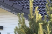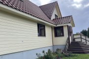 Puitvooderdus, valge, nurgad ja akna ümbrised tume punakaspruun. Värvipinda umbes 200 m2. Maja viilkatusega, seega otsad on kürgemad, umbes 20 m. Värvi ei ole muretsenud.