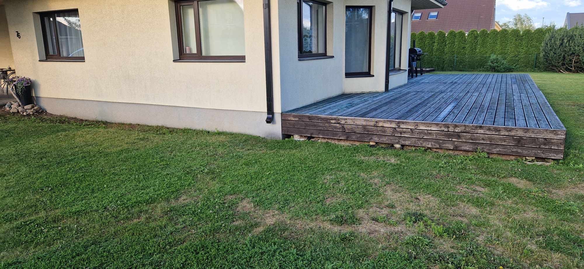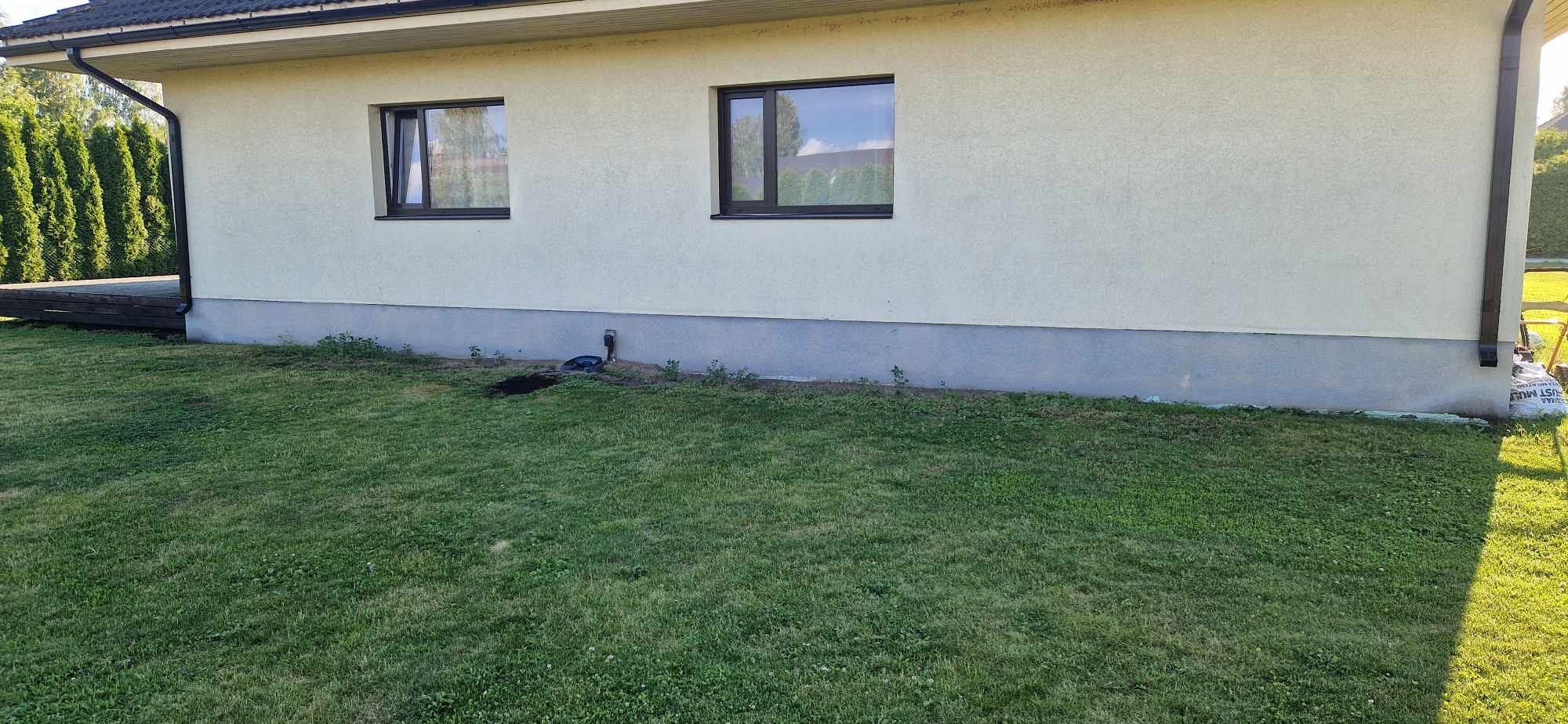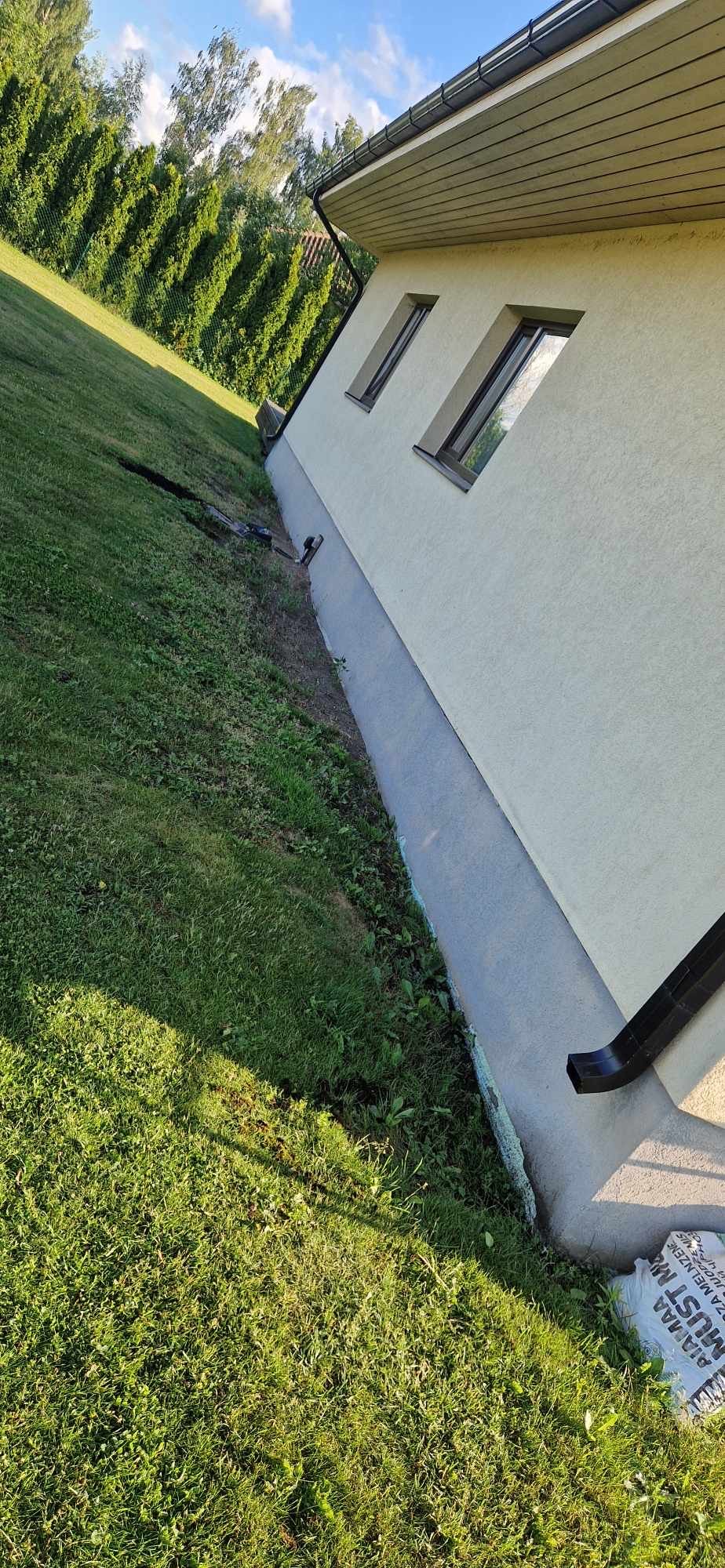 Ümber maja kaevata 60m pikkuselt ,1,2 meetri laiuselt ja 80-60 cm sügavuselt lahti. Pinnas täita ja paigaldada horisontaalne vundamendi soojustus . Lisada täide ja muud materjalid. Paigaldada teeäärekivi 60 meetrit ja 60m2 halli Unikivi.