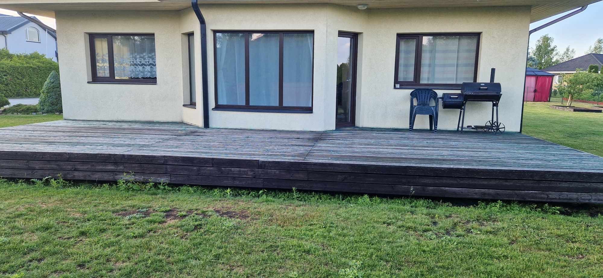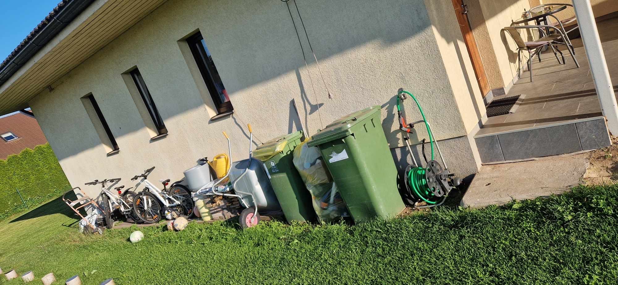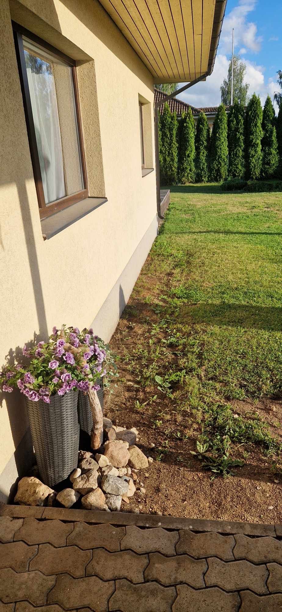 Ümber maja kaevata 60m pikkuselt ,1,2 meetri laiuselt ja 80-60 cm sügavuselt lahti. Pinnas täita ja paigaldada horisontaalne vundamendi soojustus . Lisada täide ja muud materjalid. Paigaldada teeäärekivi 60 meetrit ja 60m2 halli Unikivi.
