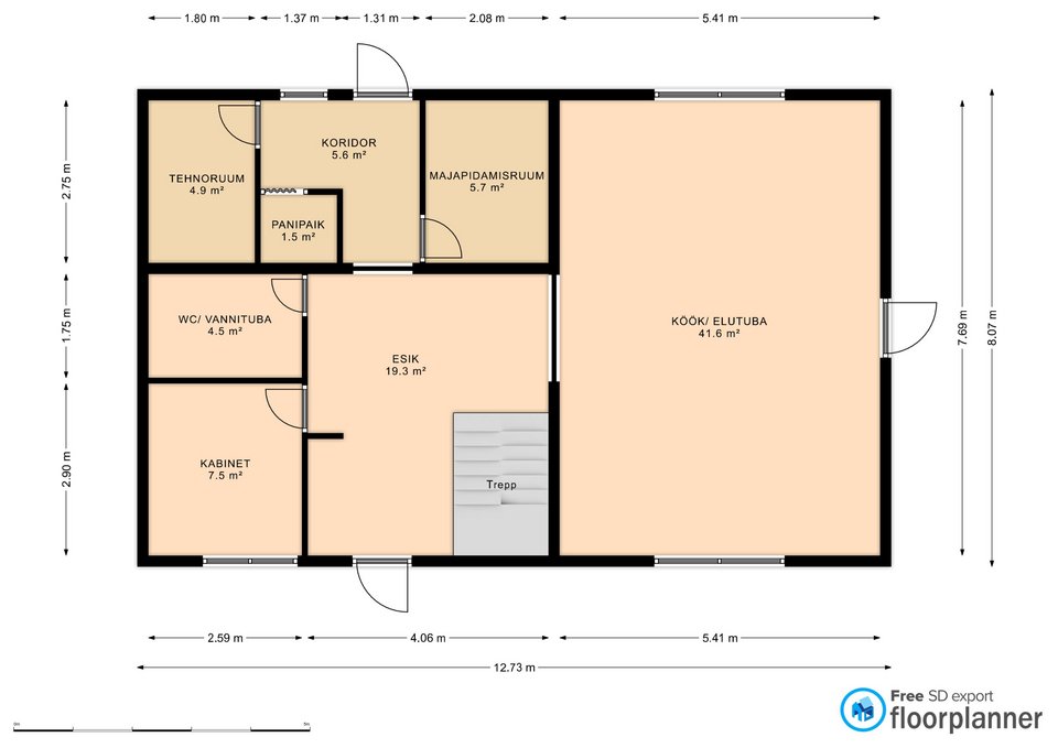 Maht ca. 90m2. Kaldega osasid 3. Joonisel paksemalt märgitud seinad olemas, õhemad puuduvad.