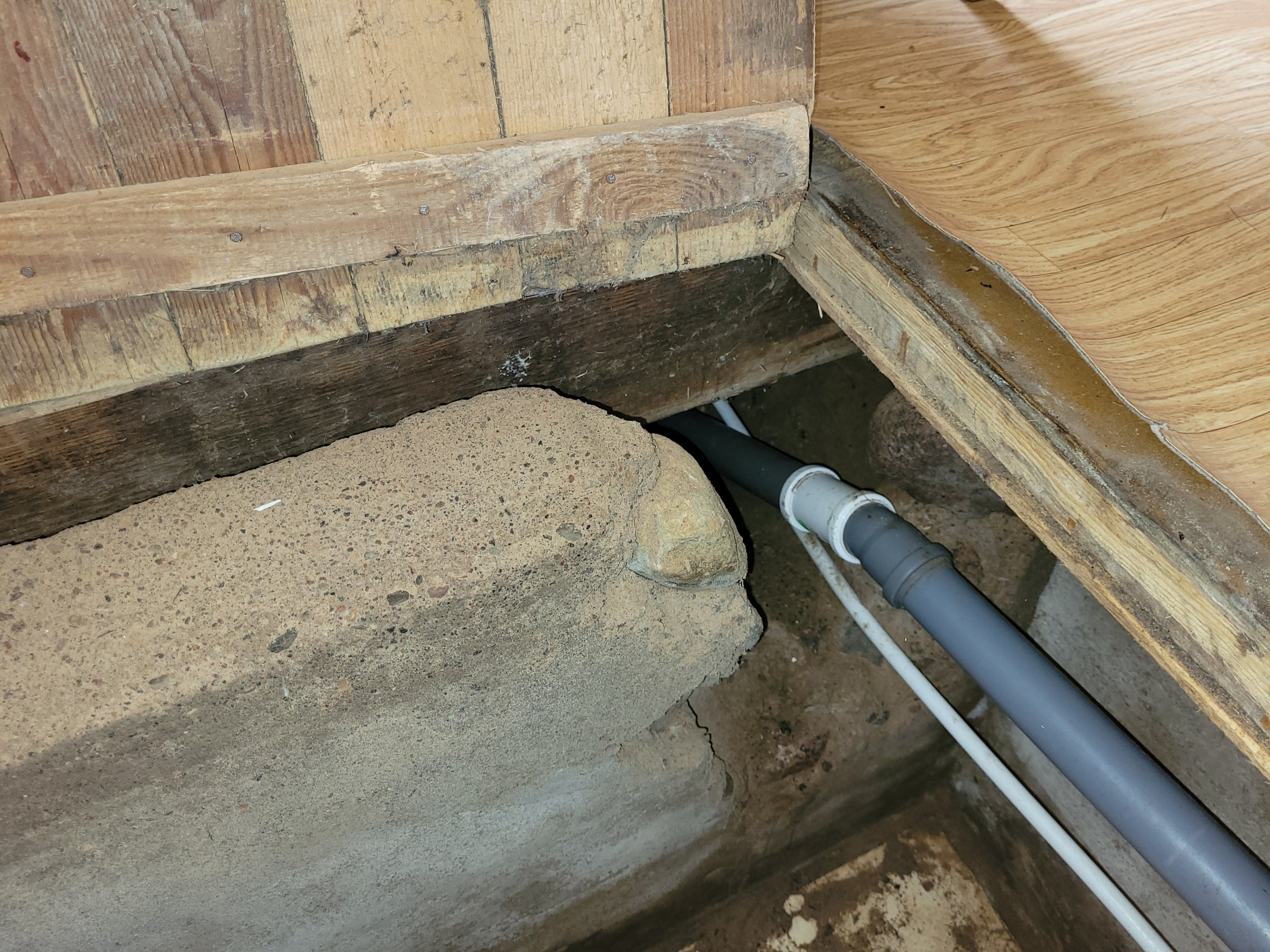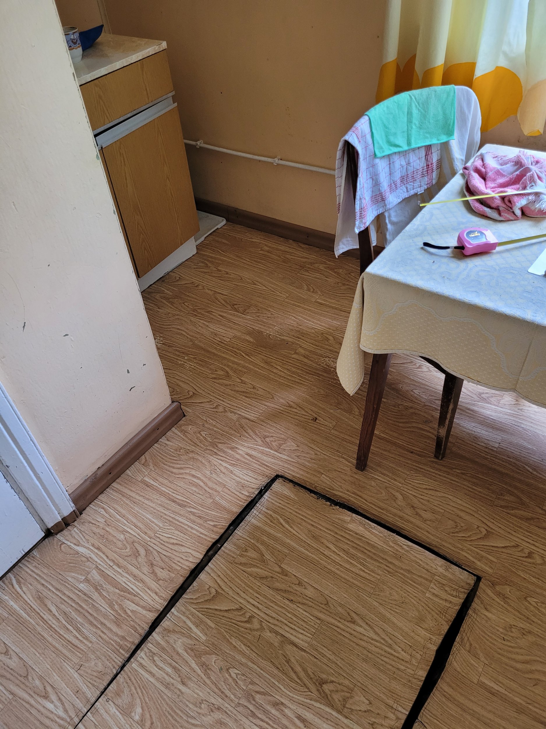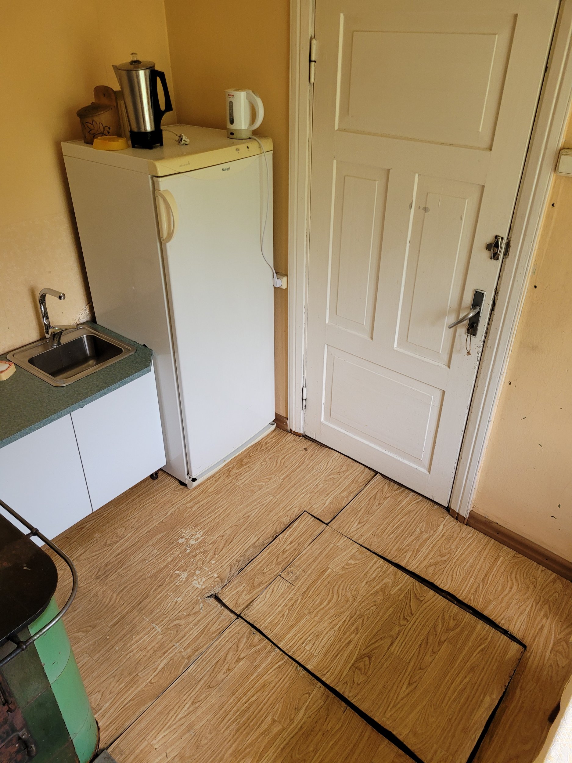Põranda all peaks ruumi olema, plaanide järgi oli seal kelder, kuid see on majast kinni ehitatud millegipärast. Põrand on saanud veekahjustusi ja kuna plaan on ruumist köögi asemel pesuruumi moodi ehitada, siis praegune põrandakate üles võtta ja rohkem veekindlamaks teha.