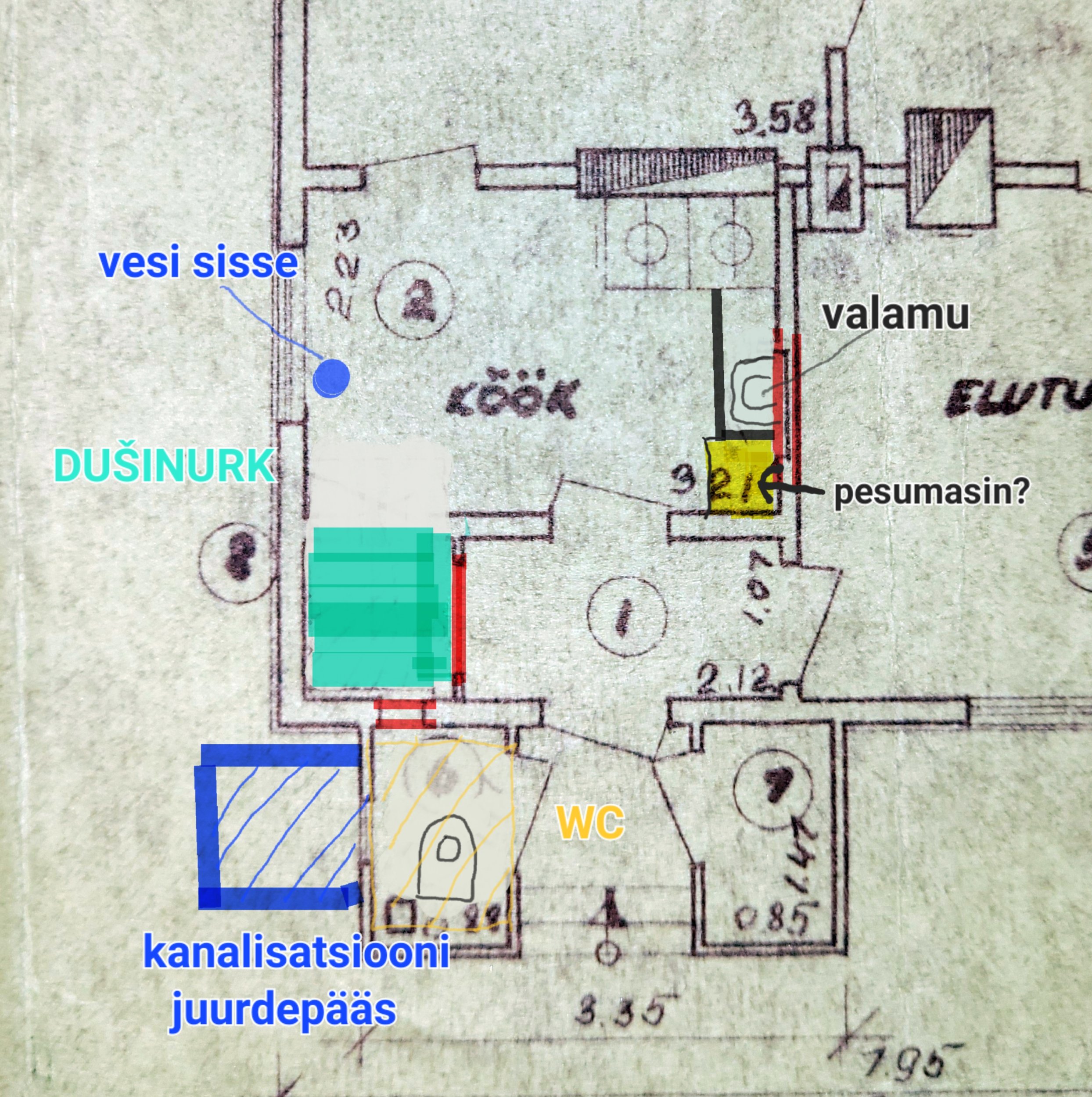 Ehitusplaan ei vasta enam tegelikkusele, seal kus kunagi oli trepp tahaks dušinurka ehitada (piltidel on seal kapid). Vesi on majja toodud, kuid oleks vaja ka sooja vee lahendust.