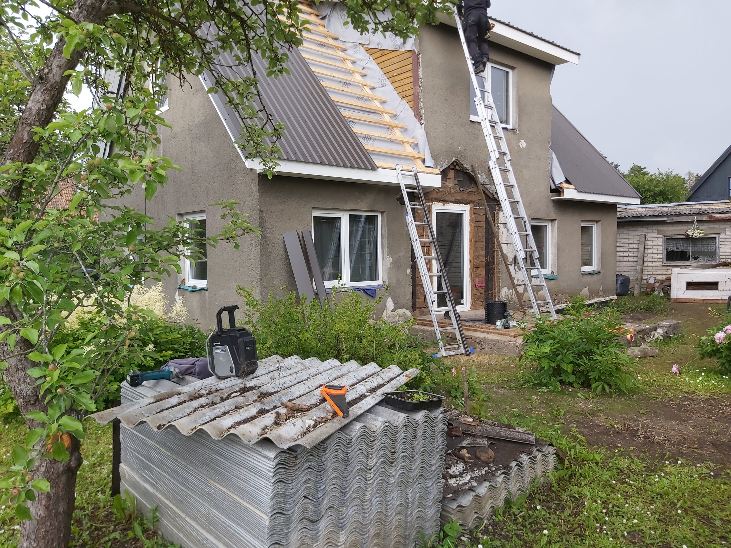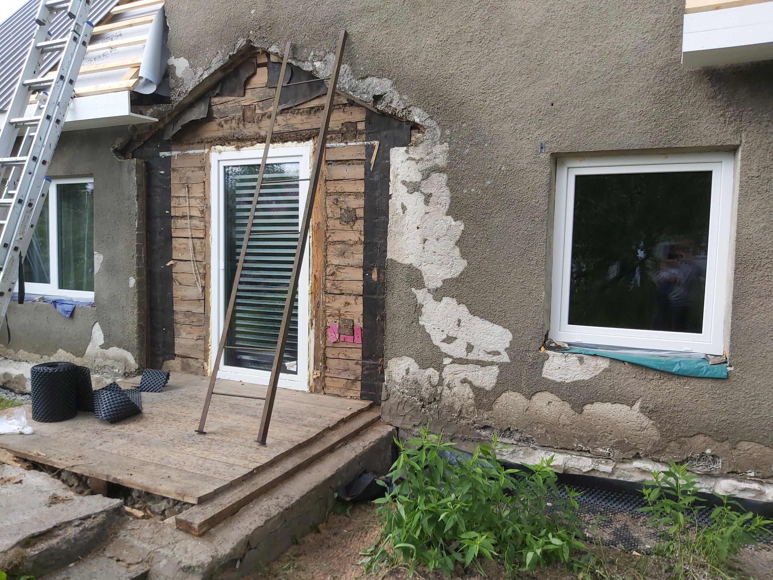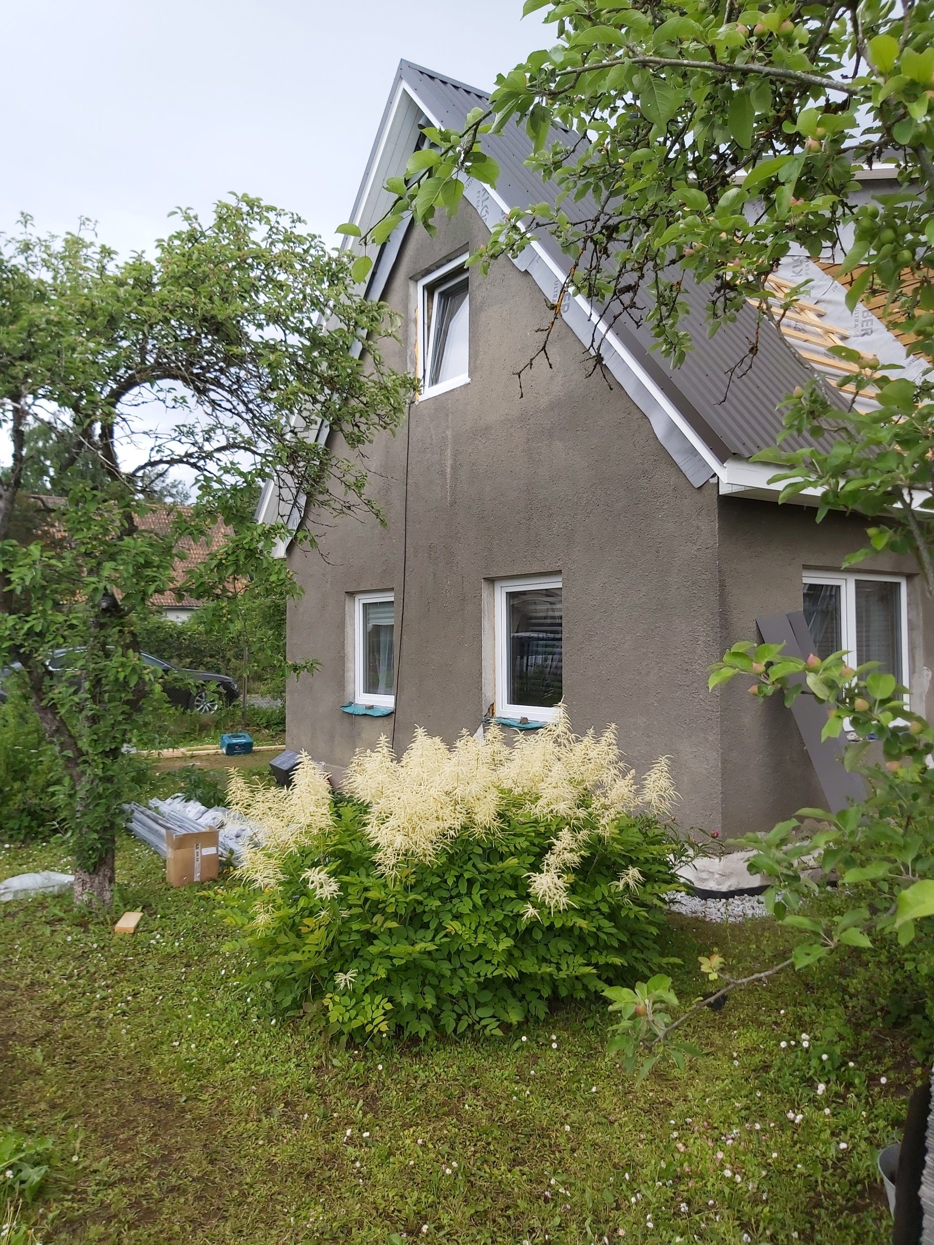Majale on osaliselt uus katus paigaldatud, aga tep-plaat koos krohviga seisab soojustusel ja katusetööde lõpetamisel ees.