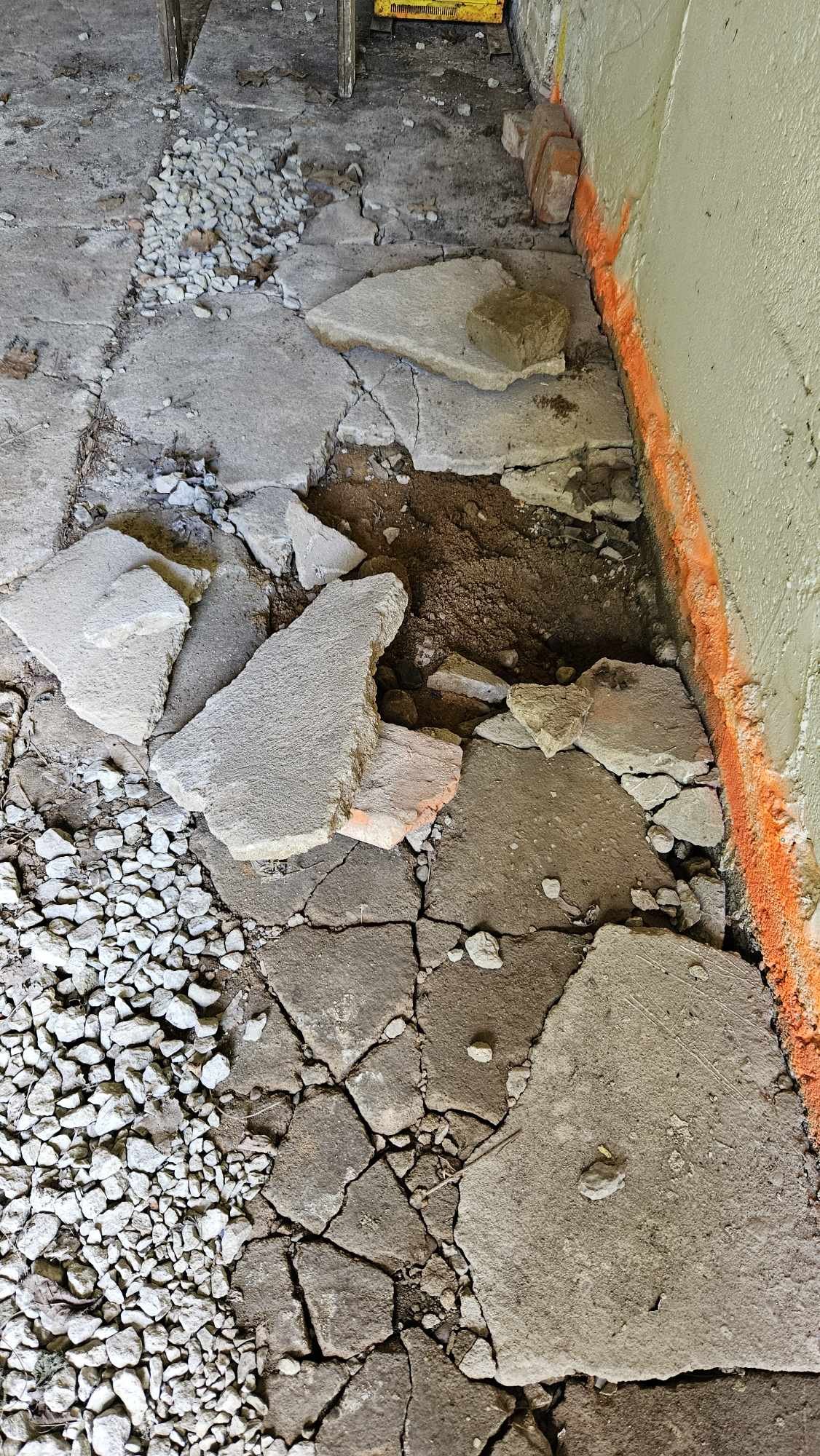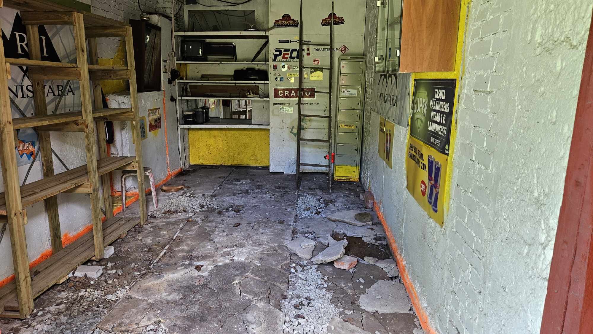 Vana põrand on lagunenud betoonpõrand ca 5cm paksune, suures osas lihtsasti teisaldatavate tükkide näol. Ca 2 ruutu on vaja lammutada. All suures osas liiv + veidi killustikku. Vana põrand ja vajalikul kogusel pinnasetäidet tuleb utiliseerida.