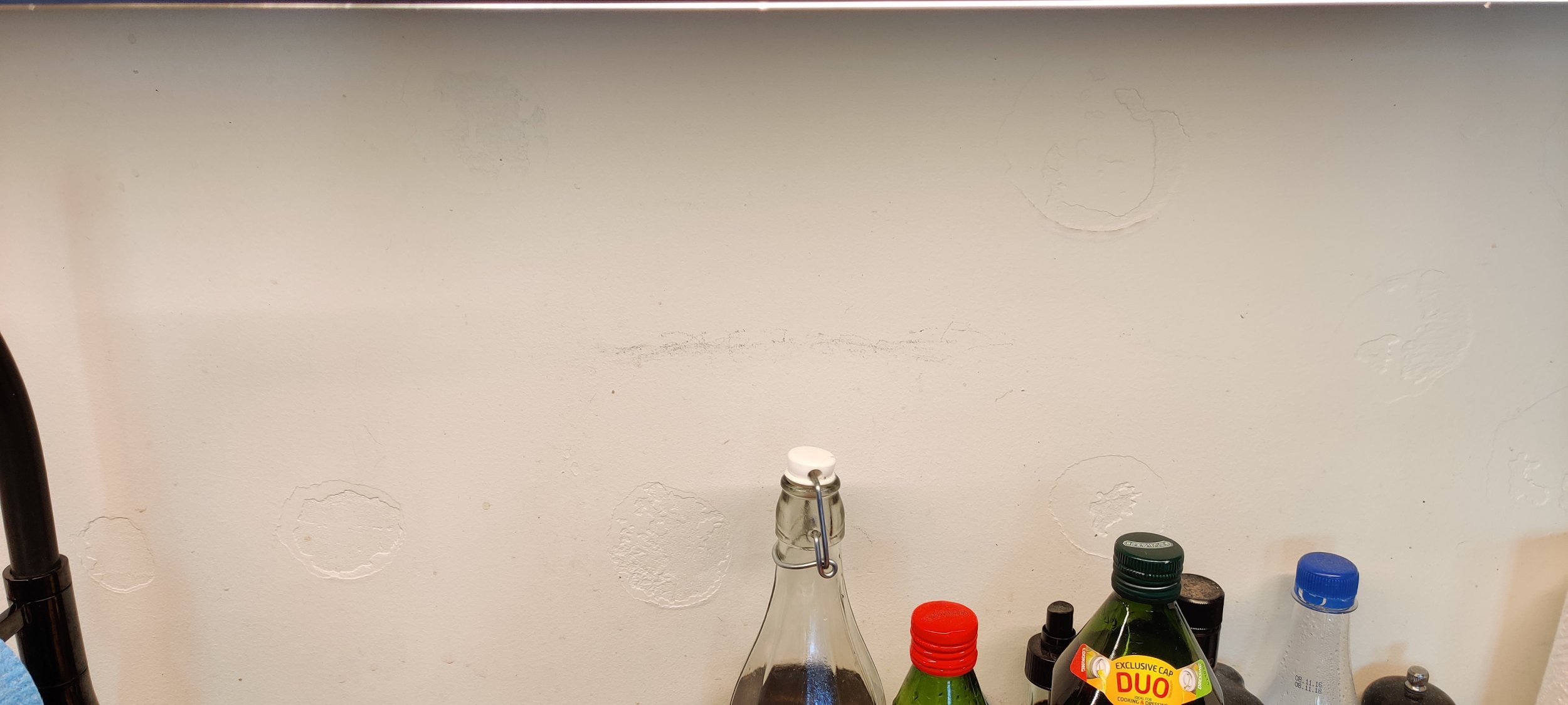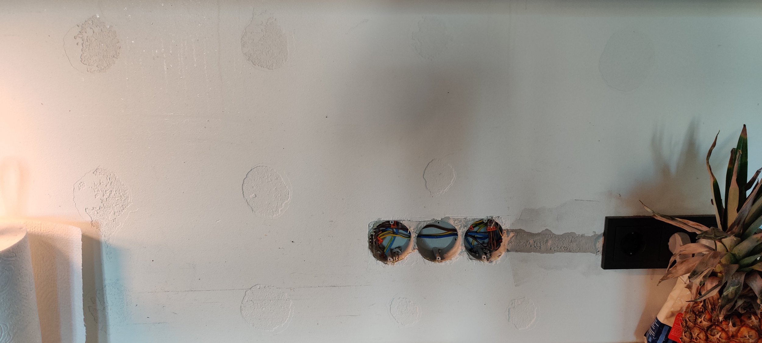 Tarvis plaatida köögi 383x55cm köögi tagasein püstises reas. Vanad pistikupesa augud katta, pistikupesad tõsta plaatide peale. Kasutada epoksiidvuuki ja hallituskindlat silikooni.