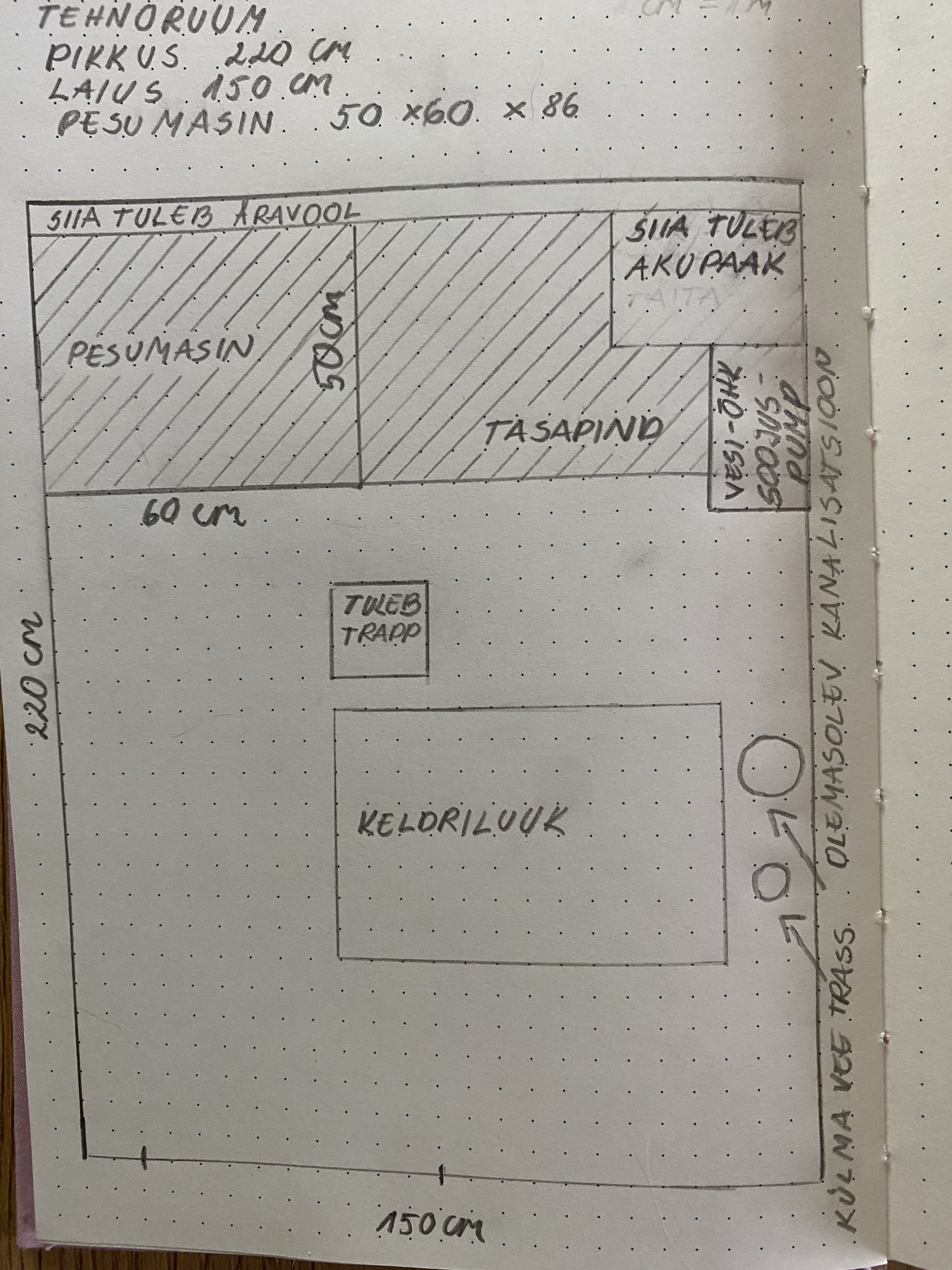 Ruumis jooksevad läbi kanalisatsioon ja veetrass mis tuleks pikendada pesumasinani( äravool ja vesi)