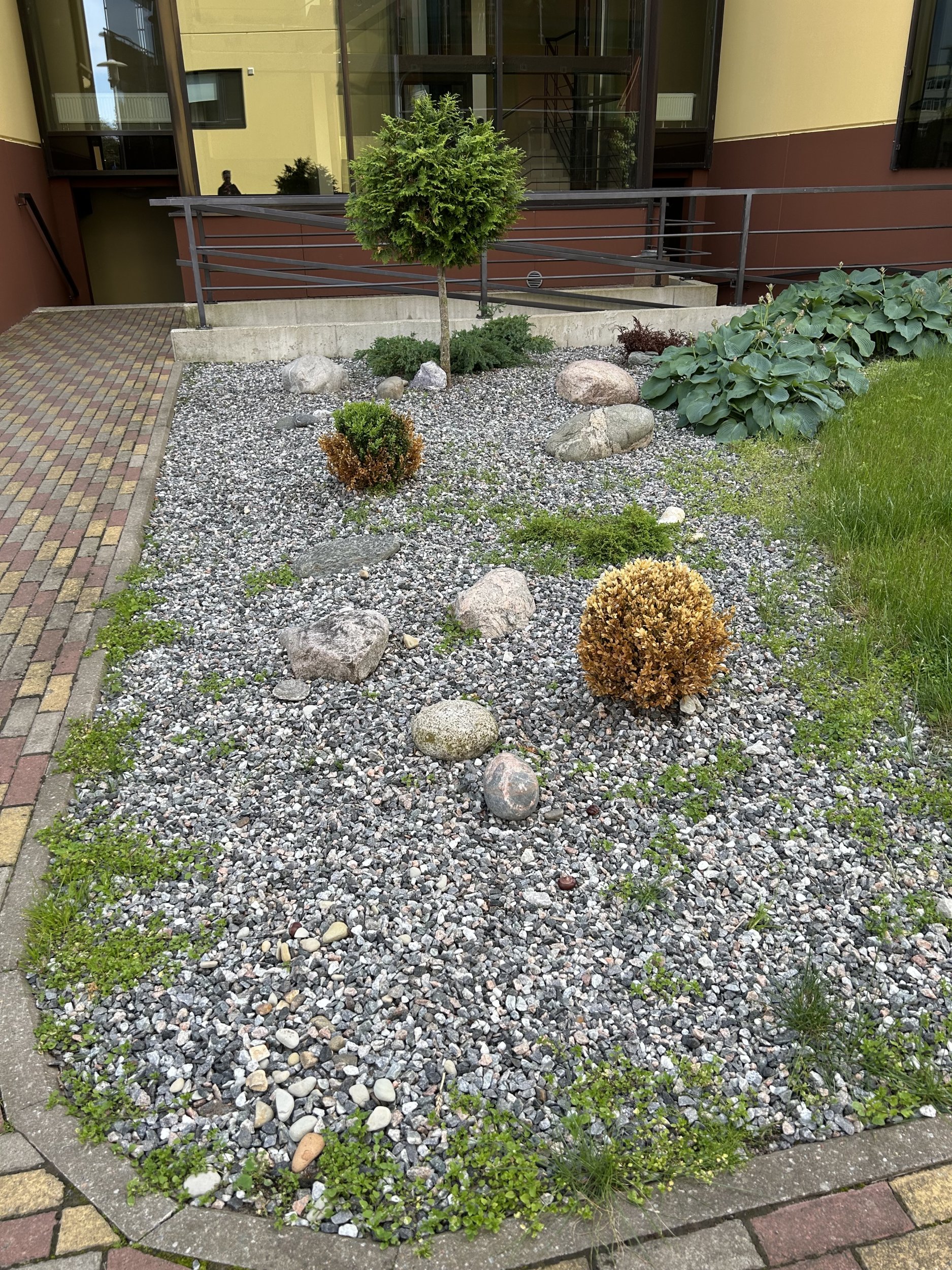 Kolme väiksema kuivanud põõsa eemaldamine ja asendamine väiksema igihalja okaspõõsaga ( kadakas või muu selline)