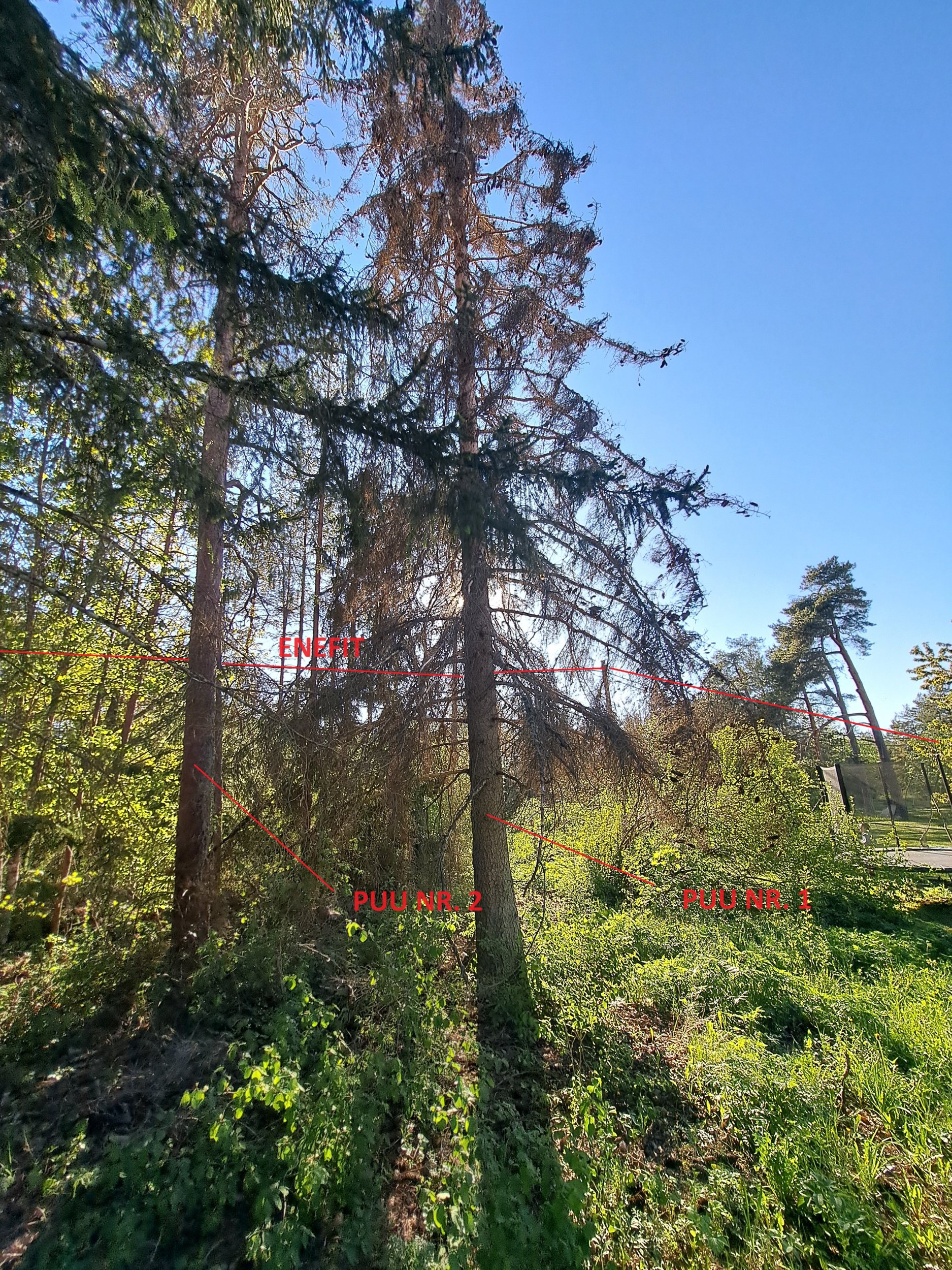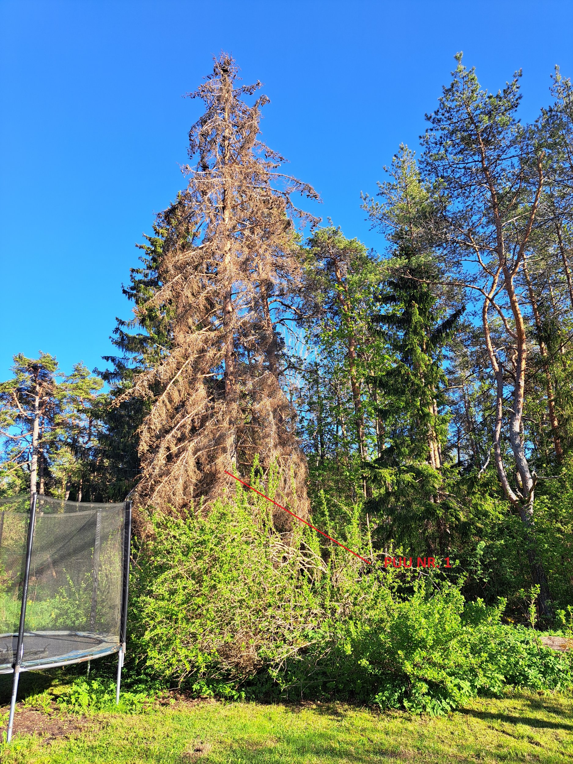 vaja maha võtta kuivanud kuused, 2 puud, vaja võtta maha, puud võib jätta kinnistule.