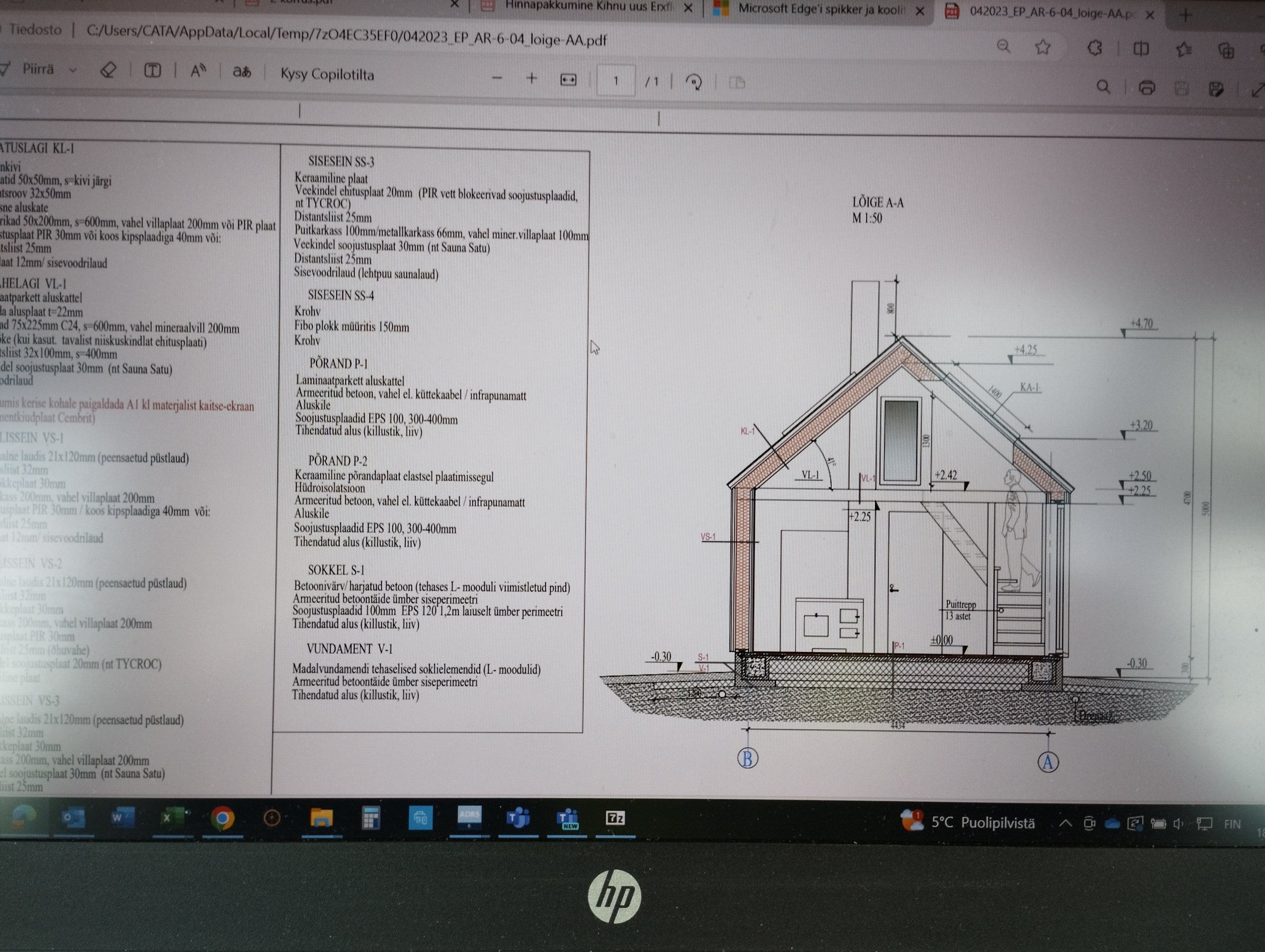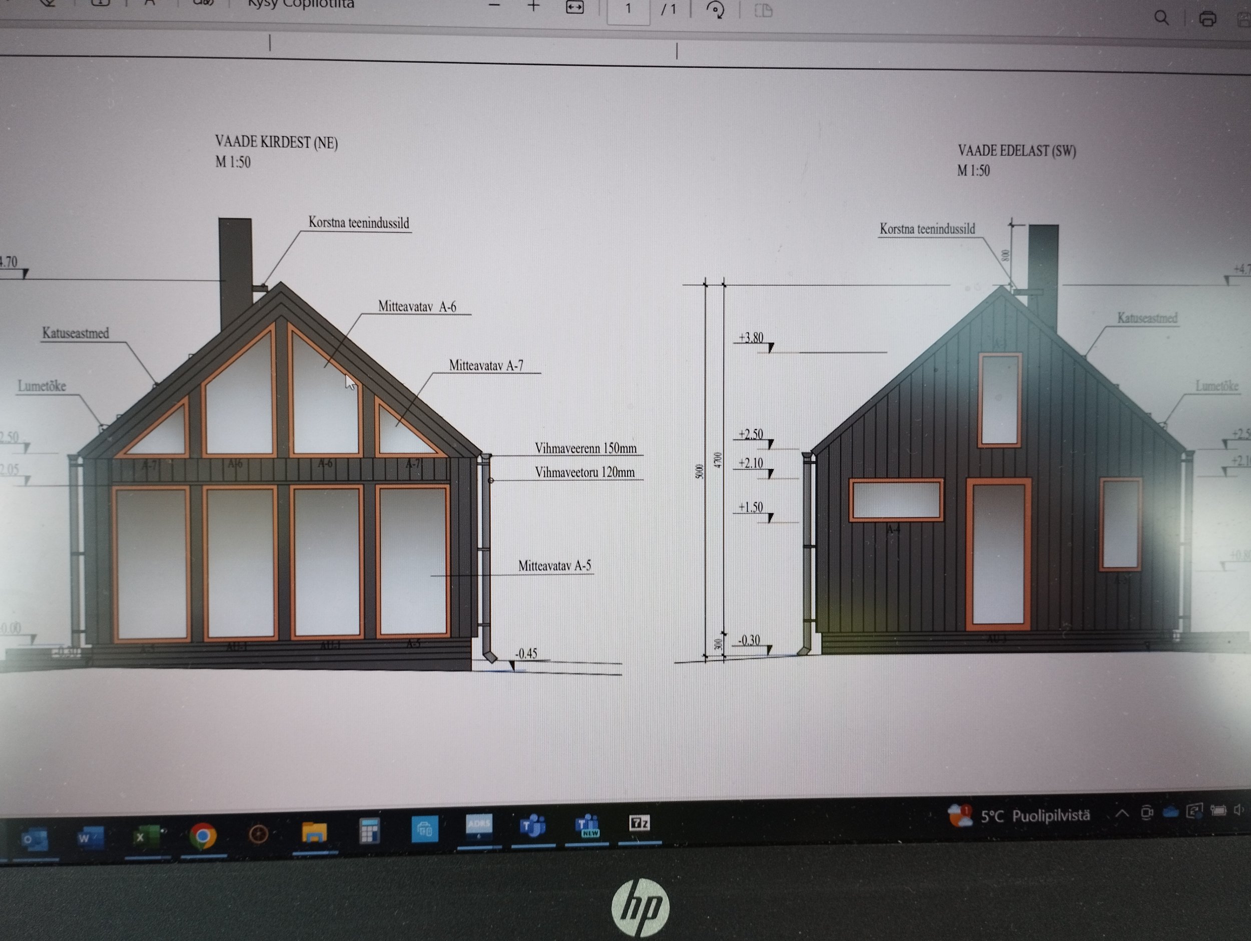Pakkumine mis ma Teile tegin on täiesti huupi(tööraha) kuna täpselt ei näe piltide pealt milline karkass tuleb/kas lisaroov soojustusega/milline on siseviimistlus täpsemalt jne jne! Täpse hinna saab siis öelda kui saab yäpsemalt projekti süveneda ja kohapeal käija! Aga suurusjärk võiks sinna kanti jääda(tööraha) Kui peaksime hanke võitma siis saan üksipulga m2 hinnad Teile teha kui saan korraliku projekti Vastavalt kokkuleppele saan anda/kasutada meie kontakte puidu osas ja kinnitusvahendite ostmisel! Lisaküsimustele vastan meeleldi vestluse all! Edu hankel |
