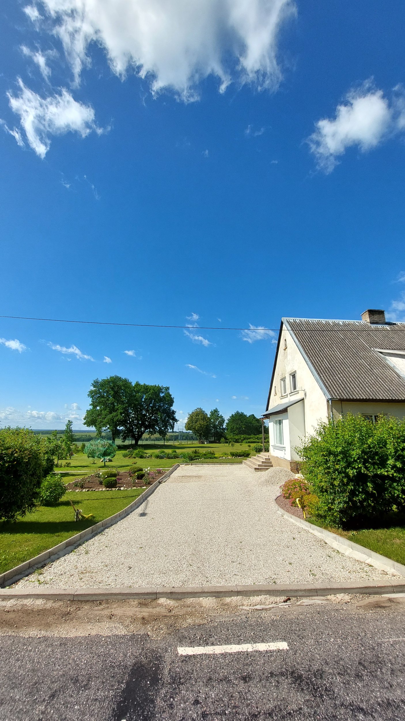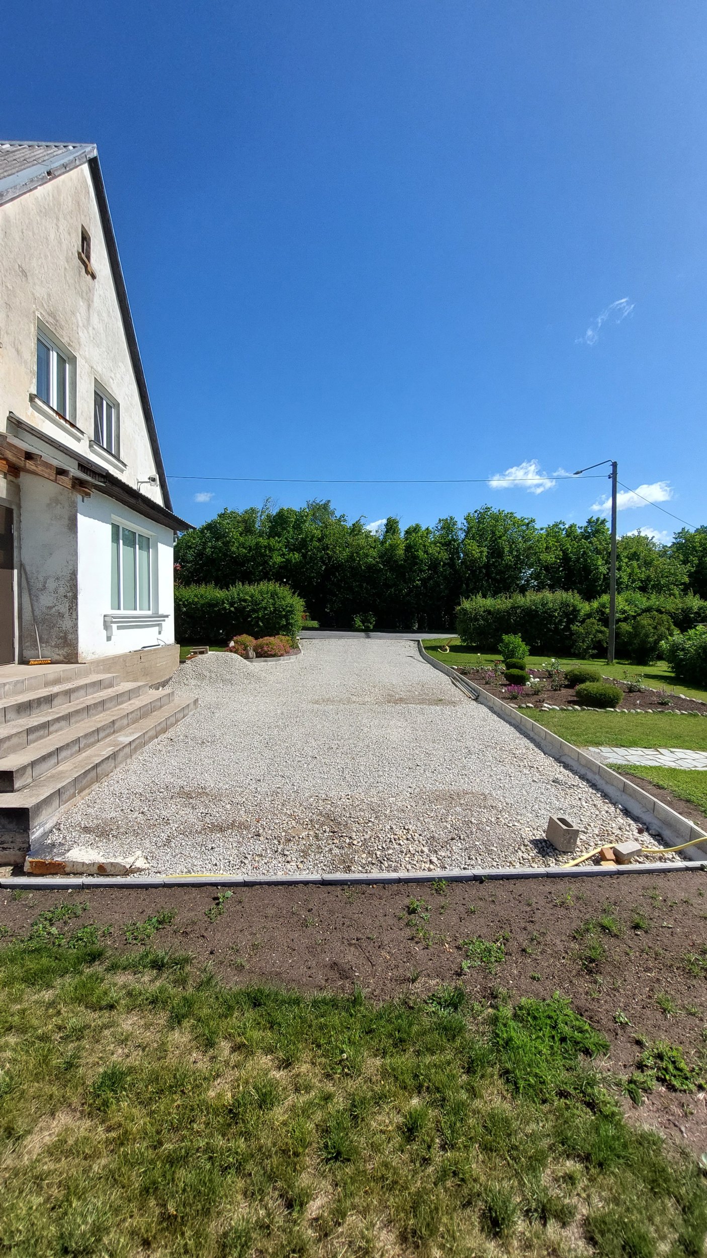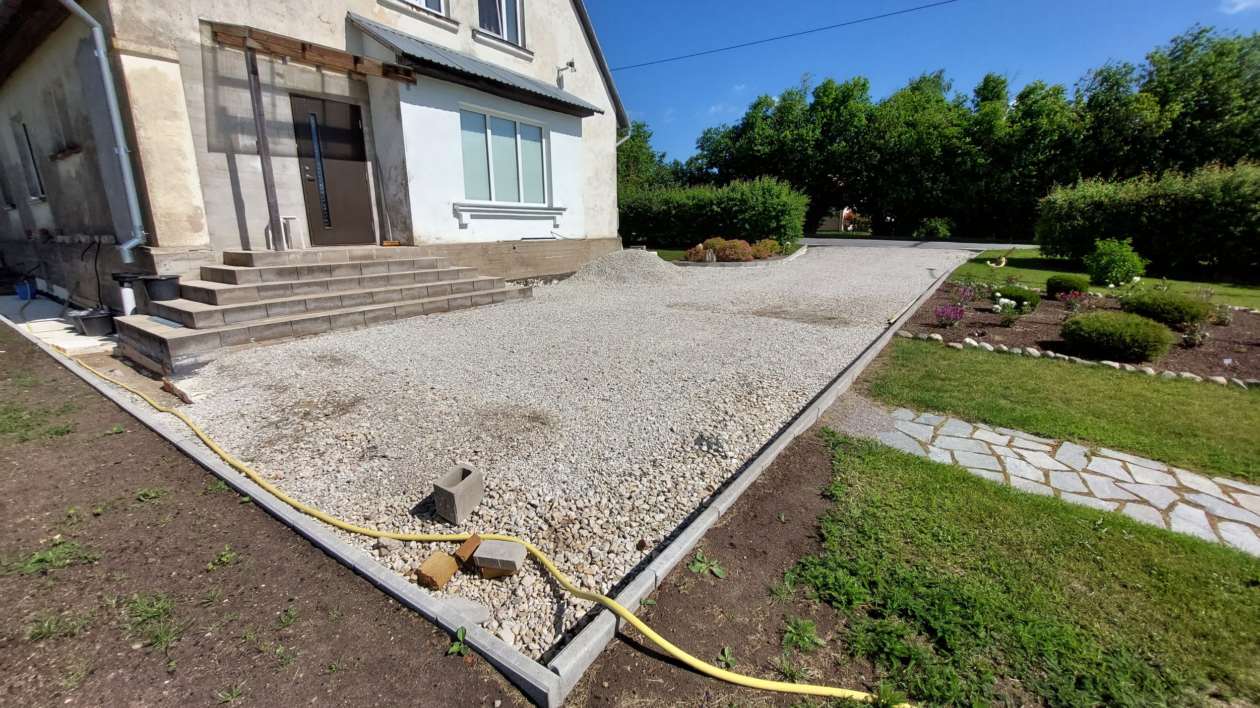 Hoovi sissesõit on killustiga täidetud,aga kindlasti tuleb veel juurde täita. Äärekivi pandud. Ca 100m2