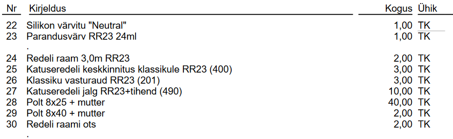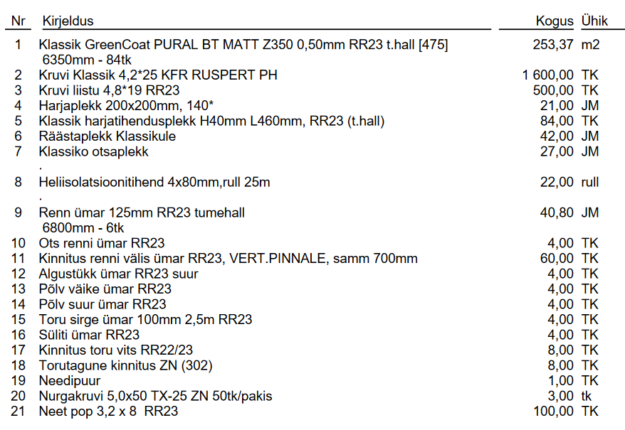 Pakkumine sisaldab vihmaveesüsteemi paigaldust, tilga-, räästa- ja harjaplekkide paigaldust, klassikprofiilpleki paigaldust. Tööle garantii! Lugupidamisega |