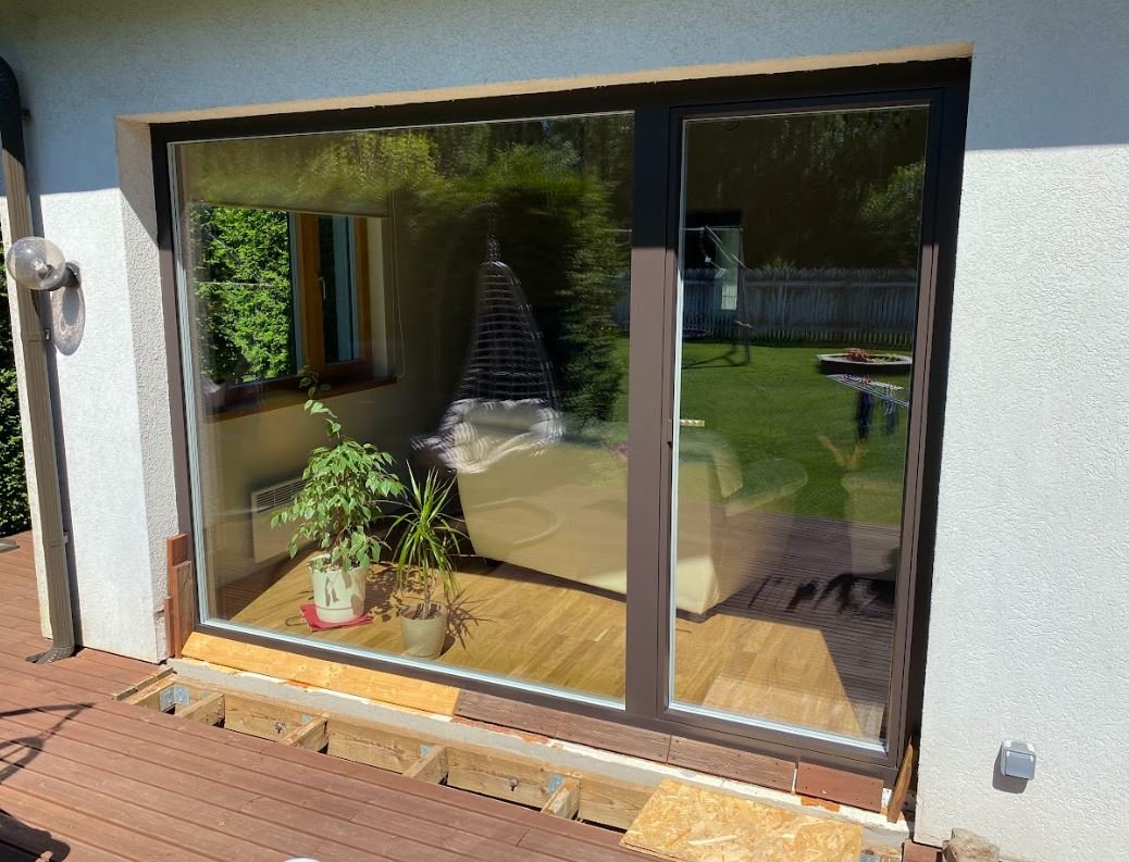 Hiljuti vahetatud välisukse ja terrassiakna palede, sh ümbritseva seina 20-30 cm ulatuses, ülekrohvimine. Uus krohv peab seina peal jääma selge piirjoonega vana krohvi peal.