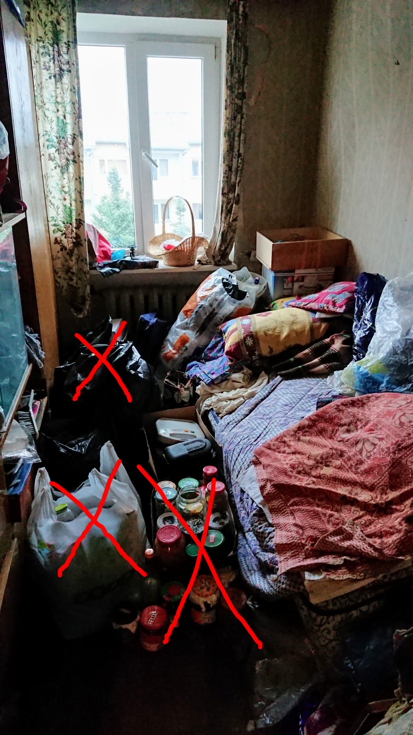 Korter asub kolmekordse maja 3. korrusel, 3-toaline, 47 m2. Soov on utiliseerida kogu lahtine kola (nõud, raamatud, riided jm tekstiilid, pudi-padi), tehnika (teler, pesumasin, köögitehnika) ning suur osa mööblist (esikumööbel, kušetid, diivan, tugitoolid, sektsioonid, kapid, lauad, toolid). Võrreldes piltidel nähtavaga, oleme oma jõududega lahtist pudi-padi vähemaks saanud, kuid siit edasi usaldame töö professionaalidele.