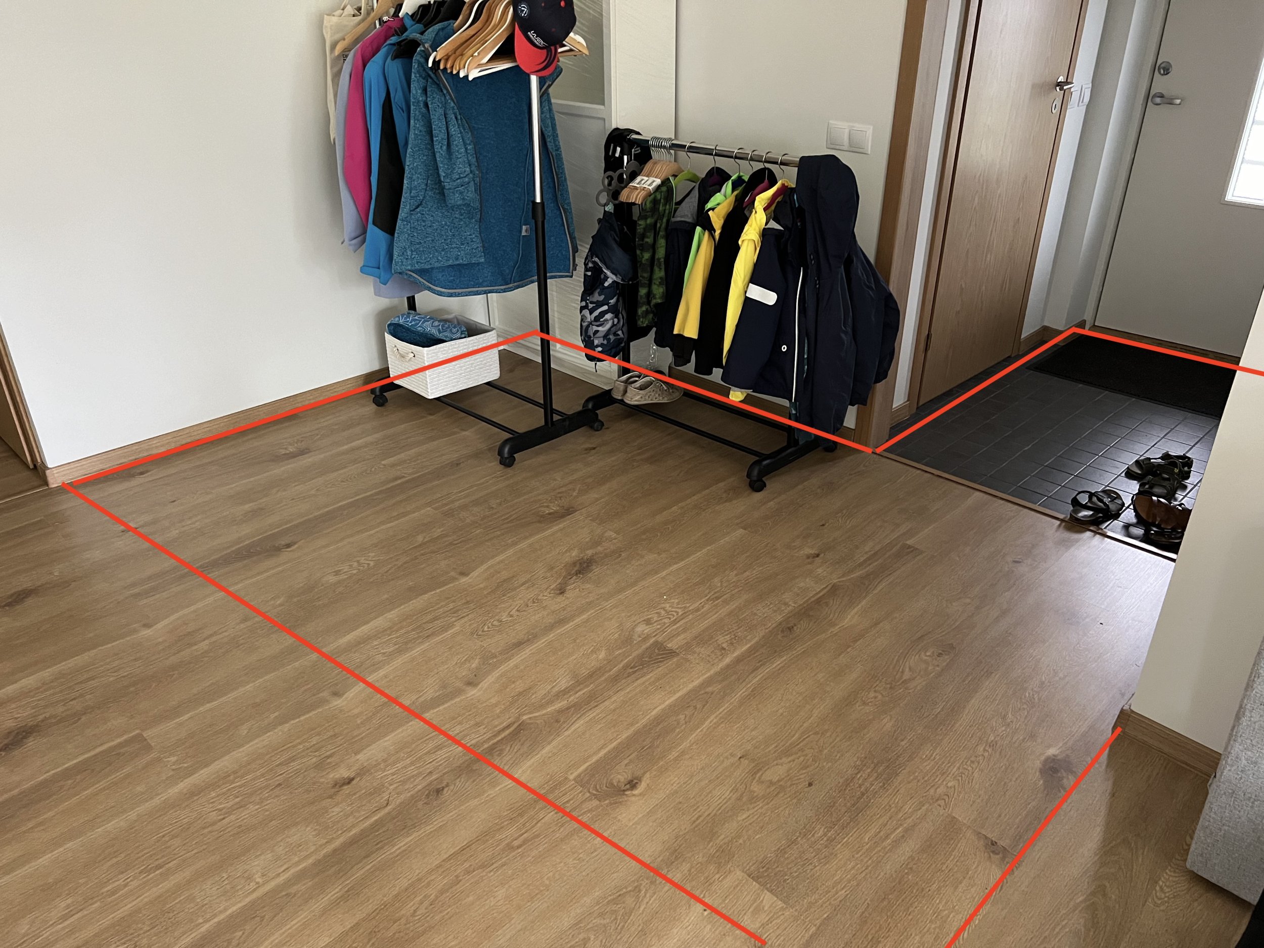Esiku väiksemas osas (vt. plidil) on täna plaadid juba olemas ning vaja on need asendada samasugustega, mis lähevad parketi asemele. Põrandaliistud käivad kergesti ära ning need saab hiljem tagasi panna.