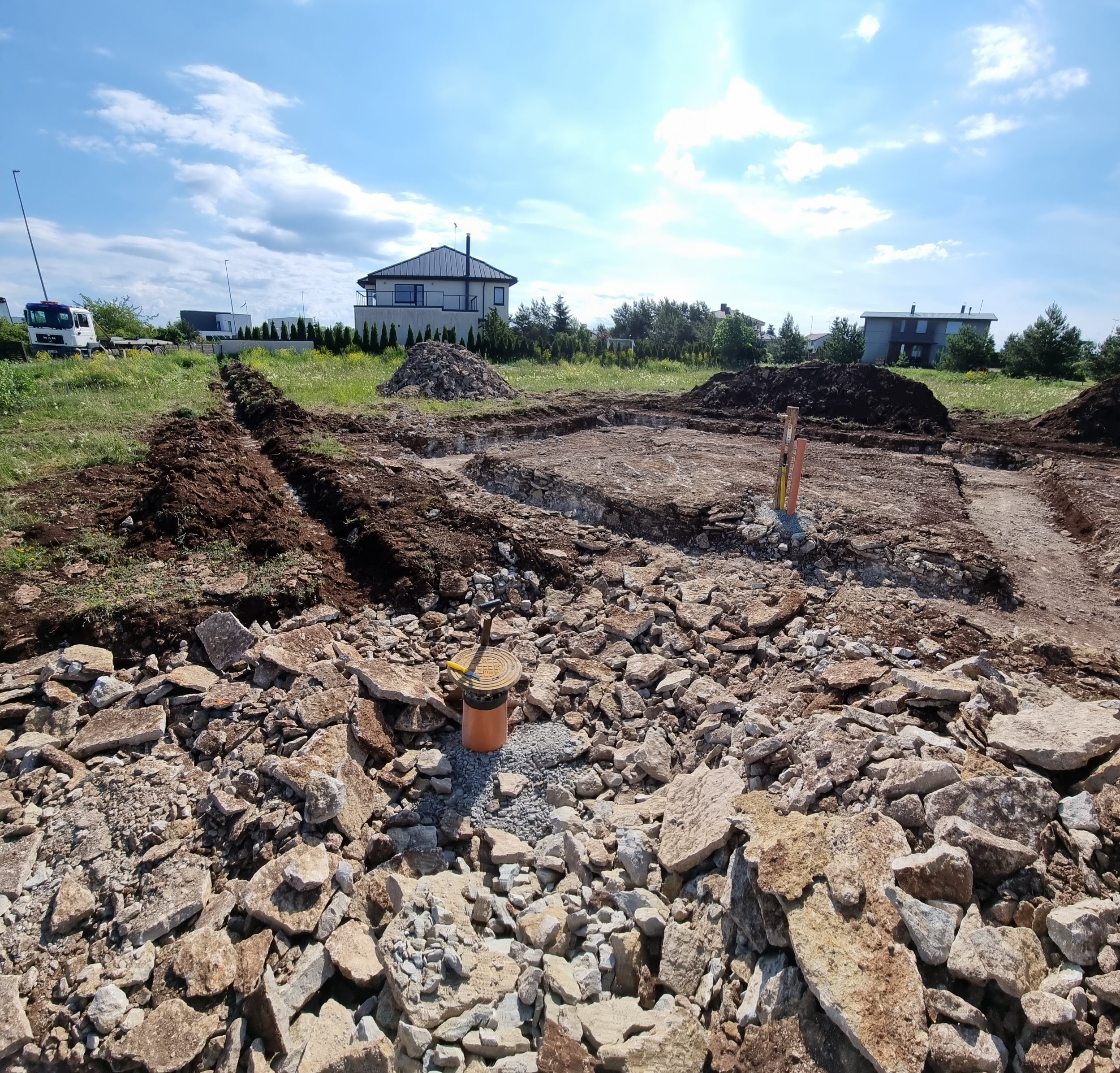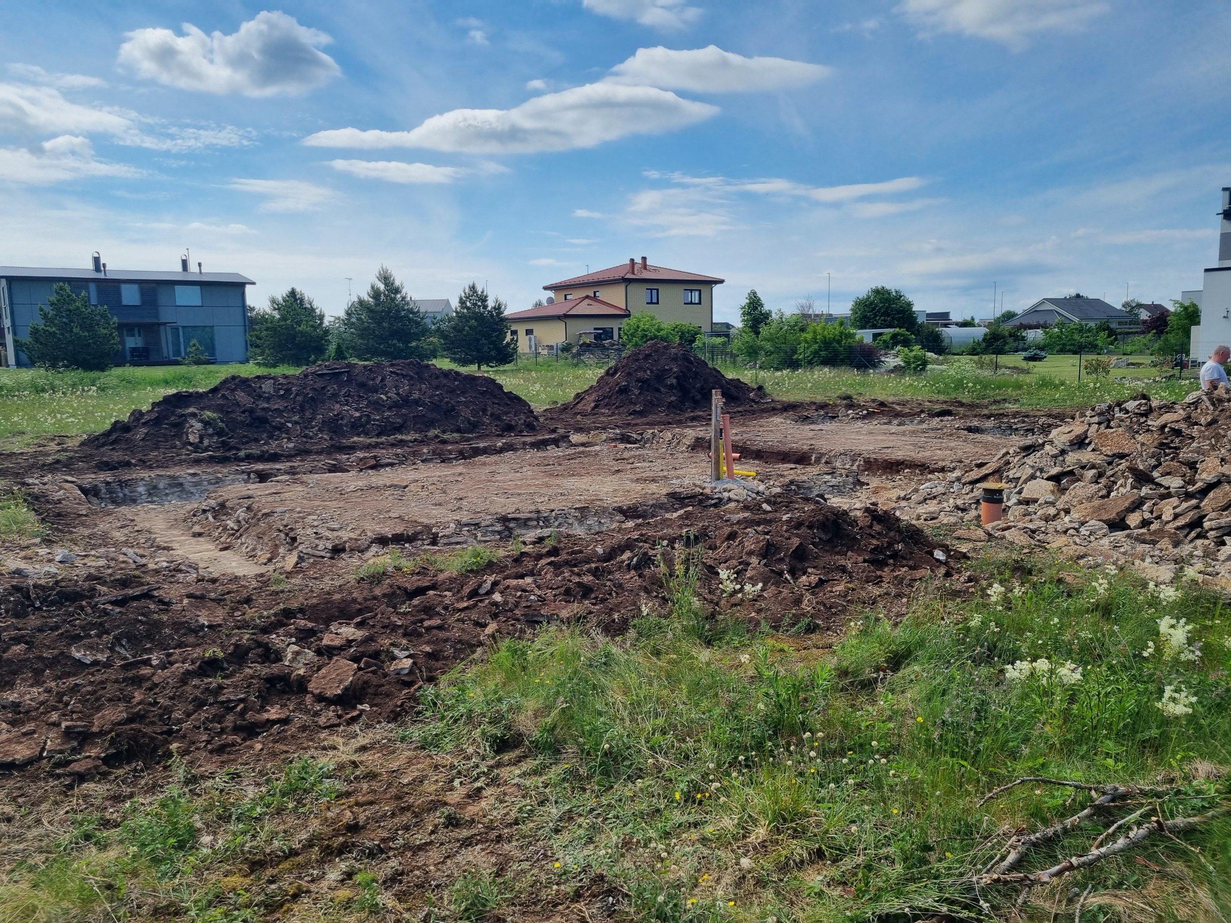 Murases ehitame väikset (kaks korrust 75m2+75m2) ja lihtsat (ristkülliku plaaniga) eramaja. Hea ja kiire ettekujutuse saamiseks oleme lisanud maja arhitektuuri plaanid, lõike ja laotised. Hetkel on pinnases kaevetööd tehtud (mis saate nähe fotodelt) ja talevaks tahaks maja karbi ehitada valmis (PDFilt faas 7).
