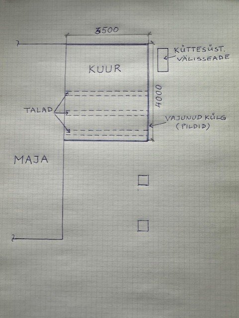 Kuur on maja osa. Kuuri üks külg on elumaja külg. Ehitatud 20 aastat tagasi. Kuuri põranda talad toetuvad otsapidi külgprussile, mis on vajunud pinnase peale ja läbi mädanenud. Sellega seoses see kuuri külg on vajunud alla. Renoveerimistöö eesmärk on tõsta kuuri seda külgseina ülespoole ja toestada põrandatalade otsad kas uue külgprussi panekuga (seda vaja ka toestada, et ta pinasesse ei vajuks) või kerge vundamendi tegemisega.