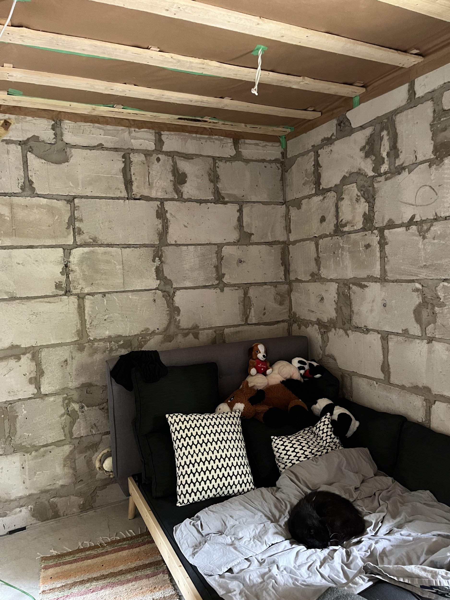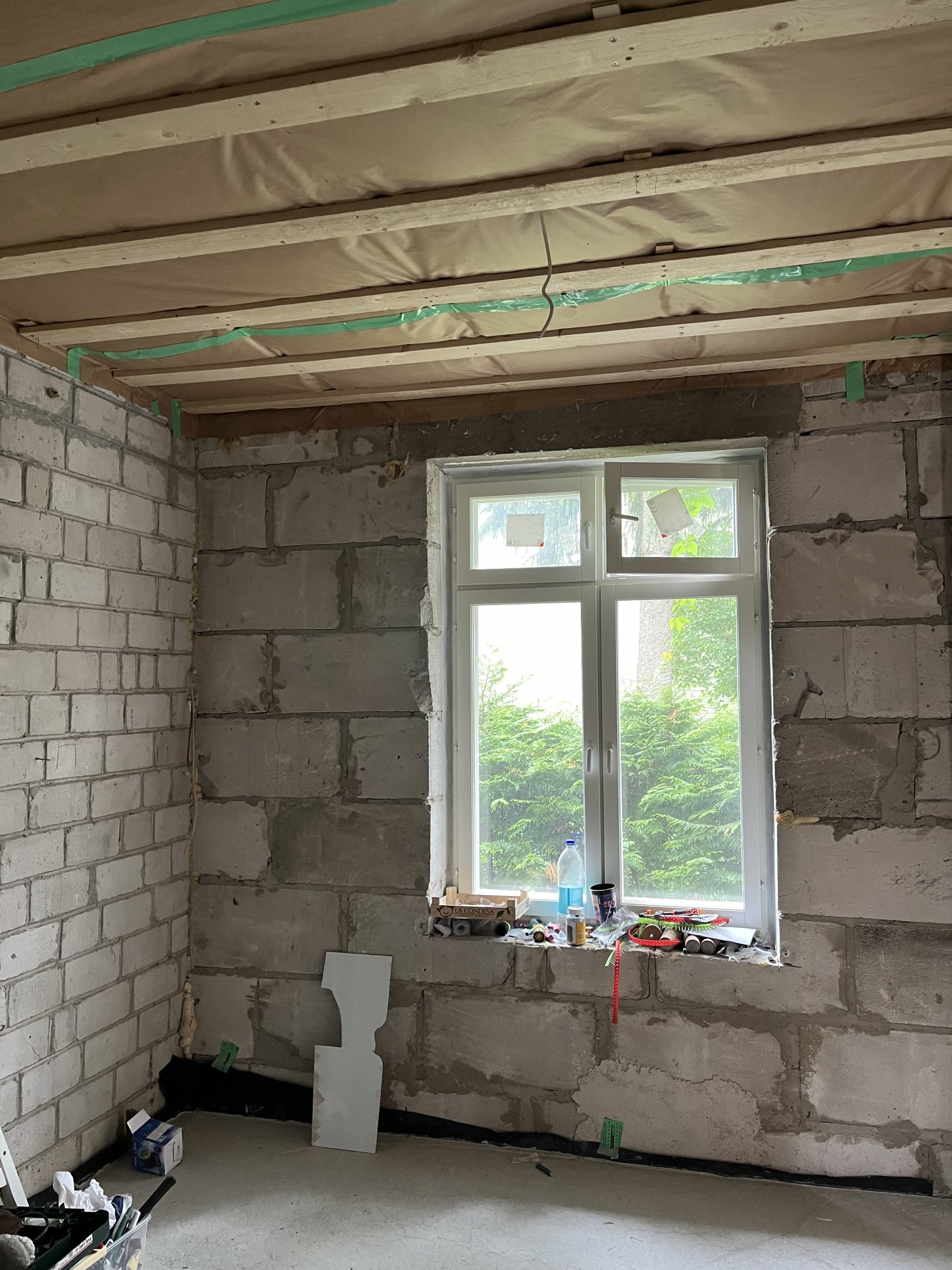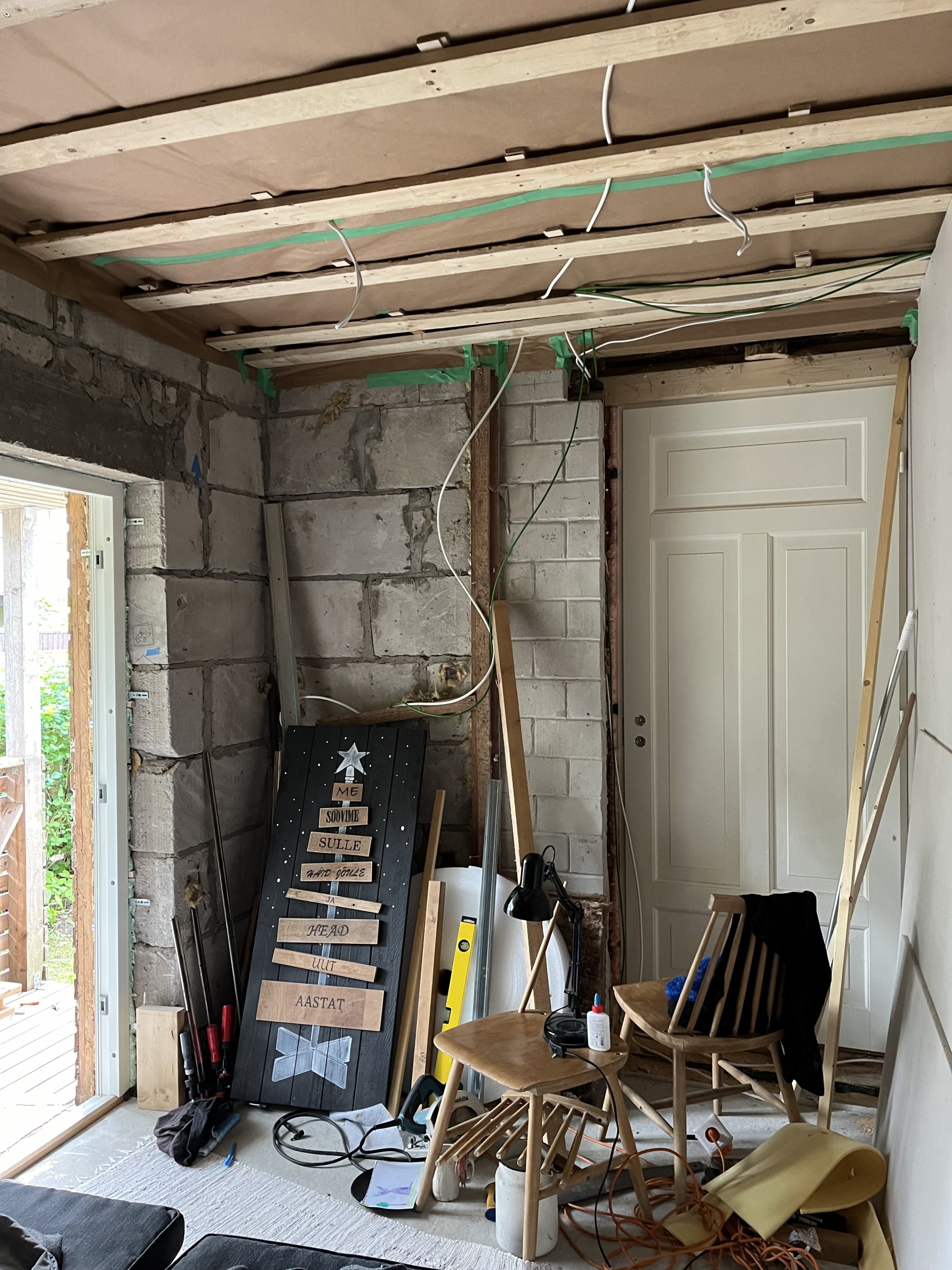 Kahte tuppa on vaja paigaldada osb ja kips. Mõlemal toa lael on karkass olemas. Sinna läheb otse osb ja kips peale. Tubadesse on vaja kahte seina karkassiks paigaldada kas tolline laud vmt (et oleks sirge aluspind) ja sinna peale osb ja kips. Mõlema toa otsaseinad kus on ukse ava, võib karkass olla standard mõõdus. Kokkuvõte: kahe toa lakke osb ja kips, kahe toa kolme seina õhuke karkass, osb ja kips.