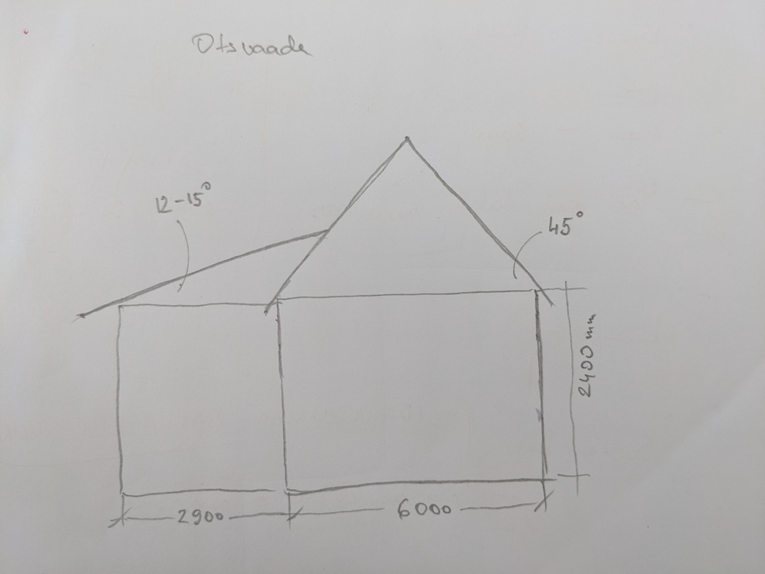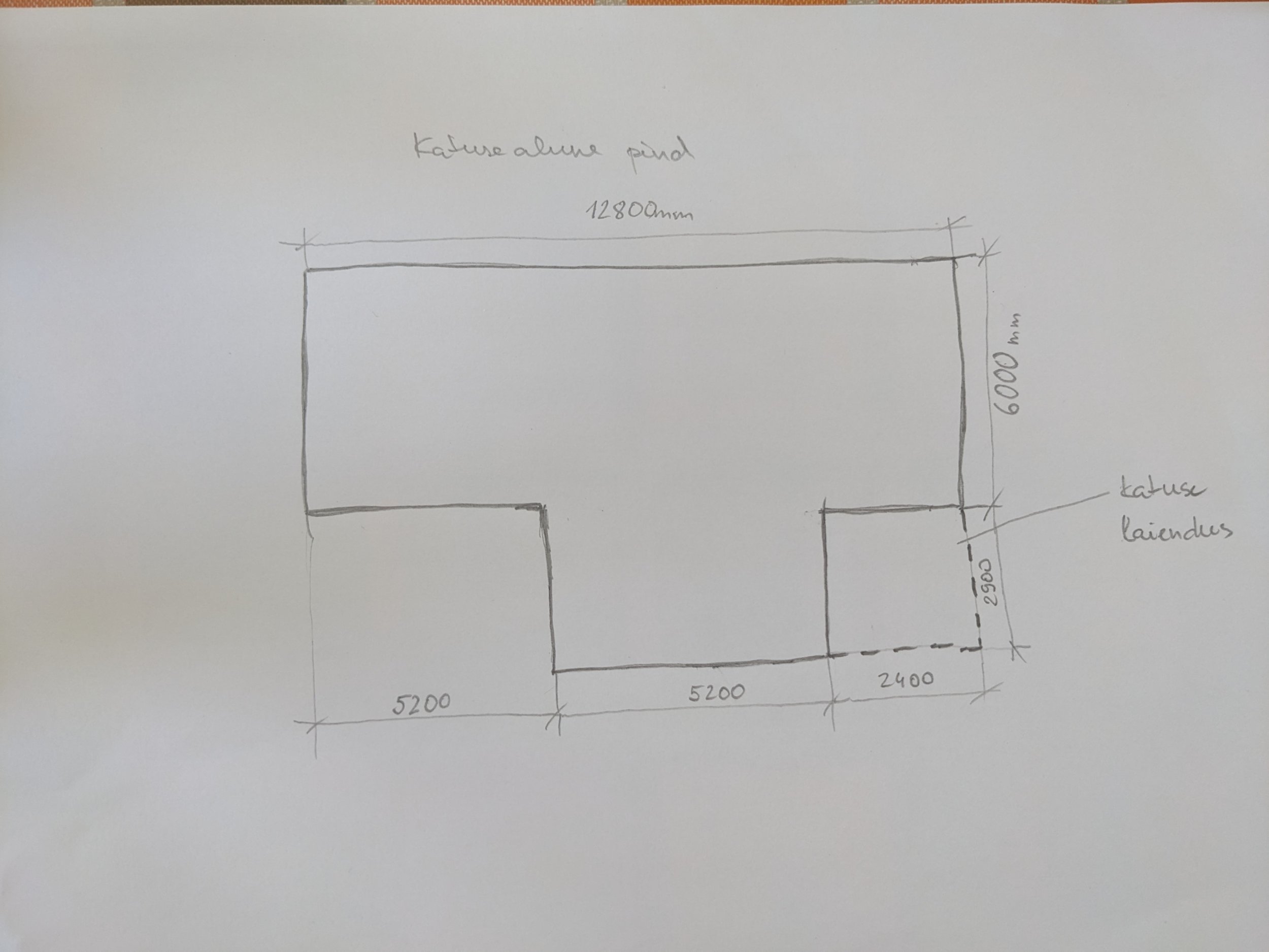 Tegu on palkhoonega. Hoone katuse aluse pinna mõõdud on toodud välja ühel piltidest (katusealunepind.jpg). Katuse alust pinda on plaanis suurendada, see tähistatud kriipsjoonega eskiisil. Vanad talad tuleb maha võtta ja uute katusetalade vahekaugus peaks olema selline (nt 50x150 tala, 600 mm samm), et hiljem saaks paigaldada sinna standardmõõduga villa. Põhikaldenurk katusel 45 kraadi (vaata pilti otsvaade.jpg). Katusepleki näidis on näidatud pildidl katuseprofiili_naidis.jpg.