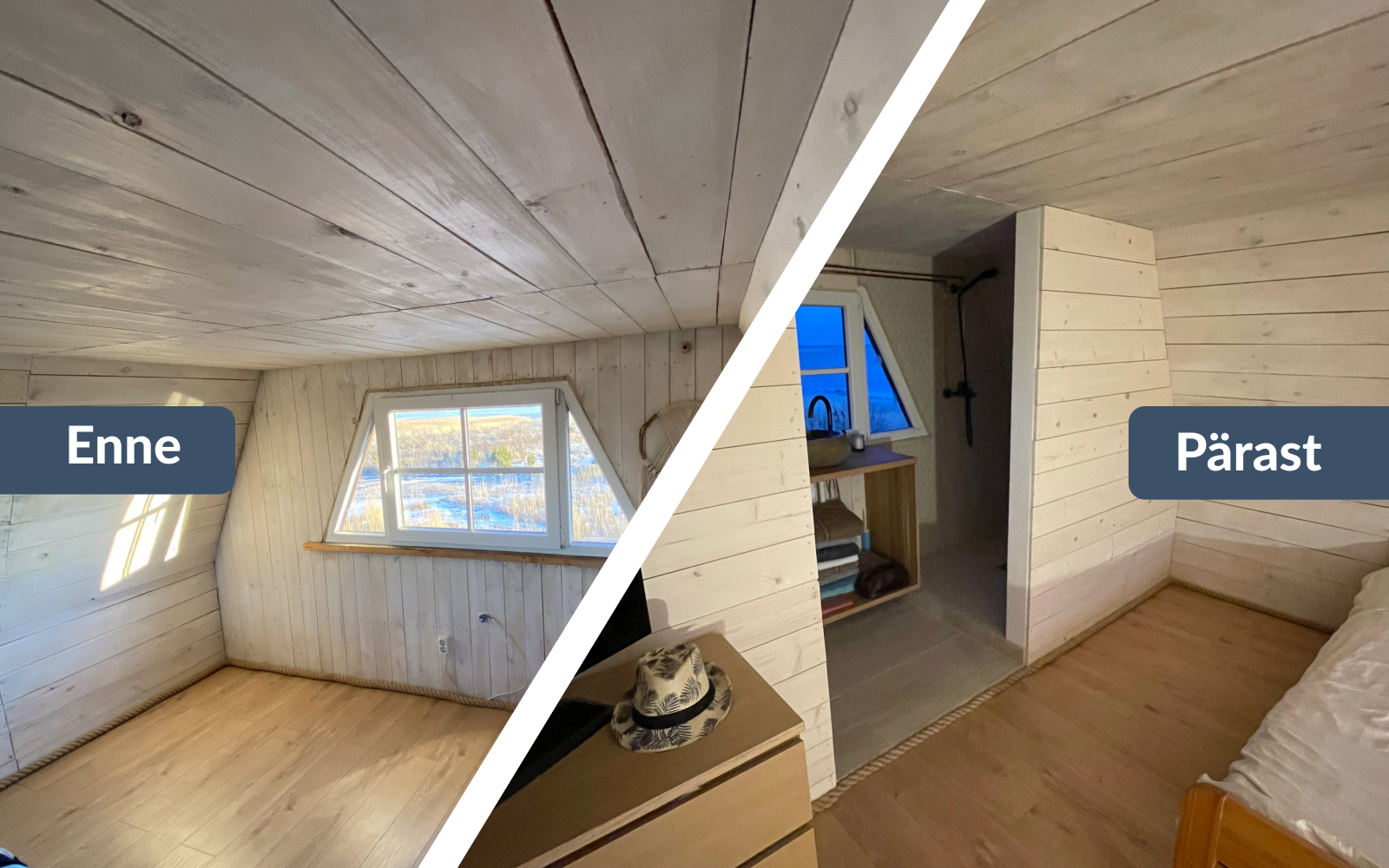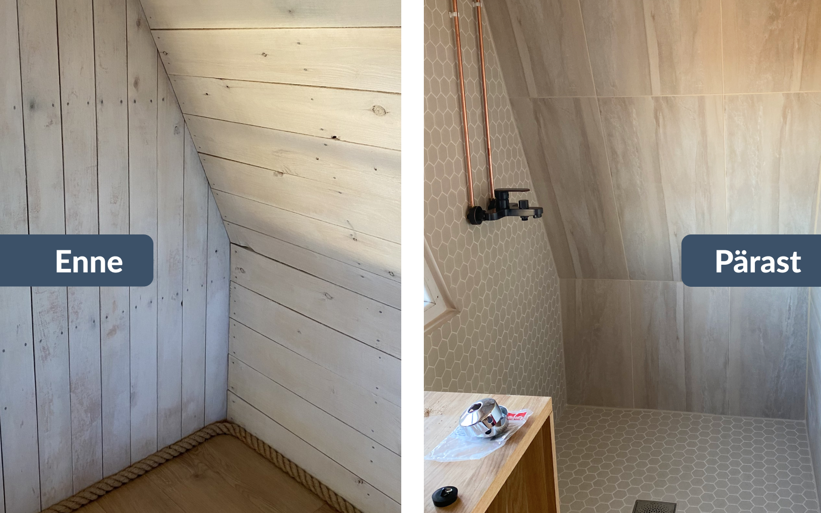 Kuid Ergi leidis inspiratsiooni sotsiaalmeediast ning tema nägemuse kohaselt pidi vannituba eraldama vahesein koos klaasist lükanduksega, mis laseb ka valgust tuppa. Lisaks soovis ta, et vanale puitlaudisele pandaks laminaatparkett.