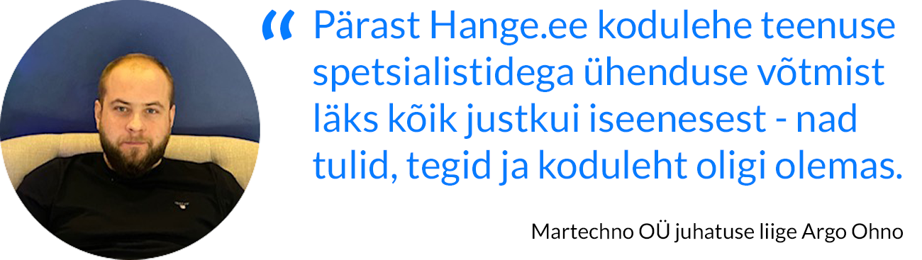 Tegelikult alguses oli lihtsalt mõte, et oleks vaja koduleht teha ja endast internetti märk maha jätta. Edasi kõik lihtsalt kuidagi sujuvalt laabus. Meil oli vajadus ja Hange.ee-l usaldusväärse ja asjaliku ehitusalal tegeleva ettevõttena oli olemas vastav teenus. Pärast Hange.ee kodulehe teenuse spetsialistidega ühenduse võtmist läks kõik justkui iseenesest: nad tulid, tegid ja koduleht oligi olemas, kirjeldab Ohno olukorda. Martechno OÜ kodulehte saab lähemalt vaadata aadressil: https://www.martechno.ee/