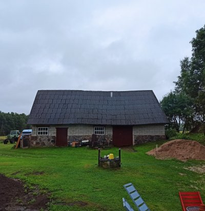 Maja fassaadi ehitus, vundamendi ja katuse soojustamine, plekk-katuse paigaldus